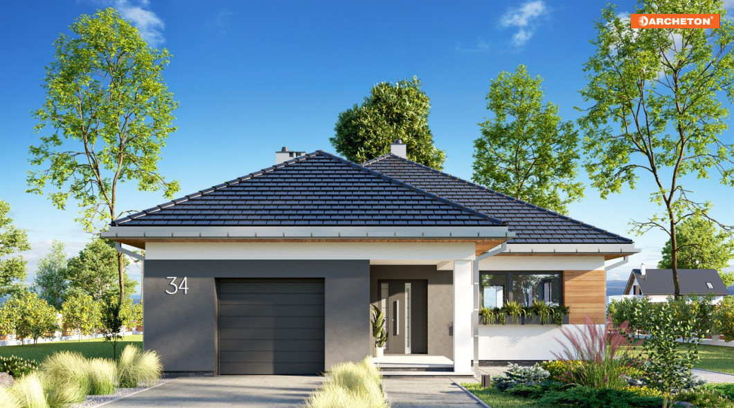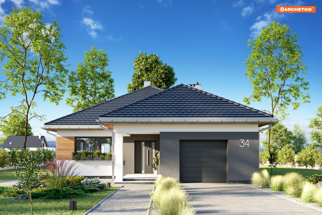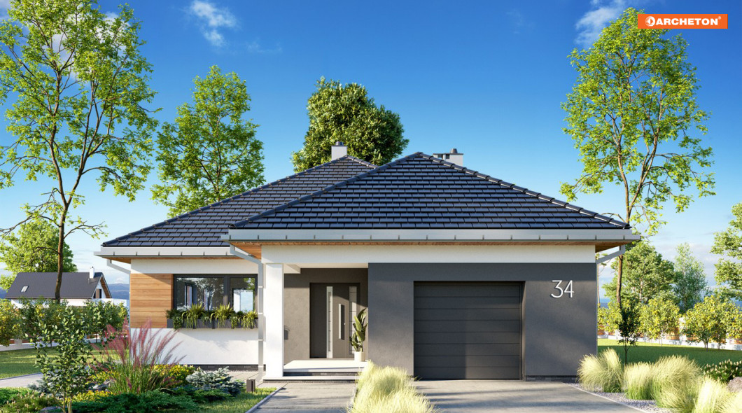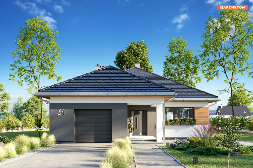 Projekt domu Koniczynka Rex jest średnim wariantem, podobnie, jak Koniczynka G2 ale, w przeciwieństwie do niej, ma garaż jednostanowiskowy. Jej kuchnia jest najwyraźniej wydzielona ze strefy dziennej. Rzut sięga najdalej w głąb działki i jest przy tym najmniej rozbudowany, dlatego wydłużona do niemal 20m, jednolita elewacja boczna wymaga optycznej korekty. W wizualizacji zaproponowano wydzielenie części garażowej i mieszkalnej kolorystycznym kontrastem wykończenia ścian.