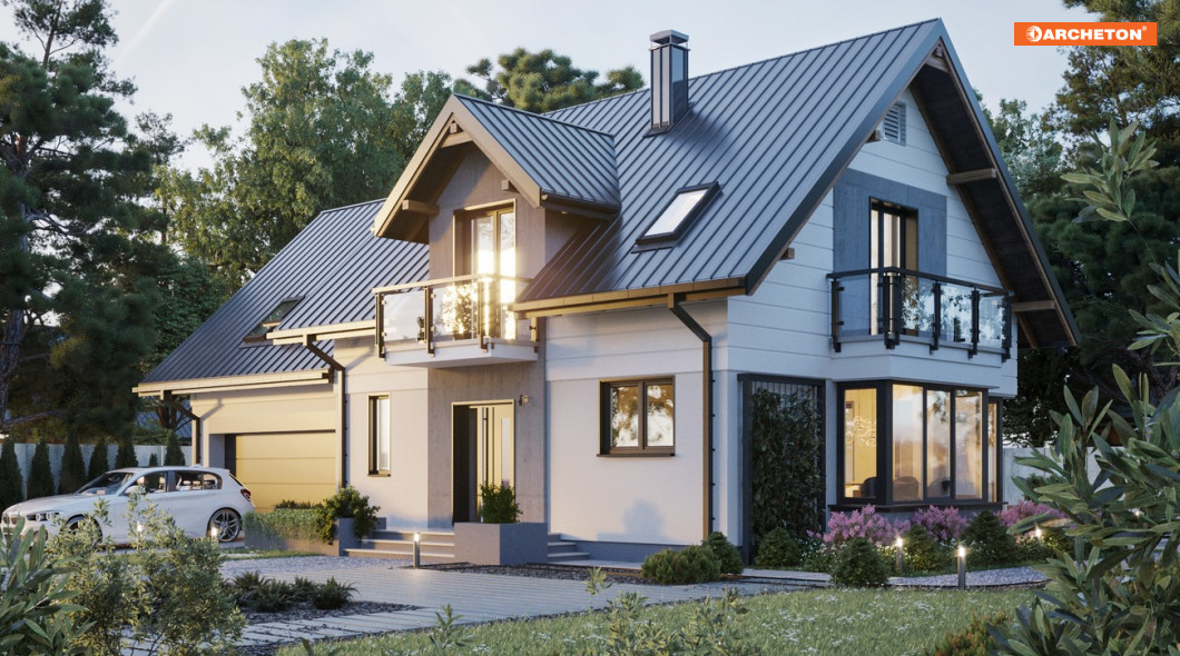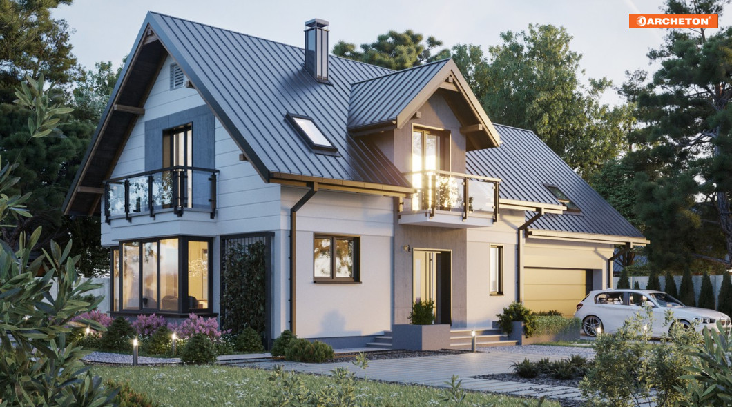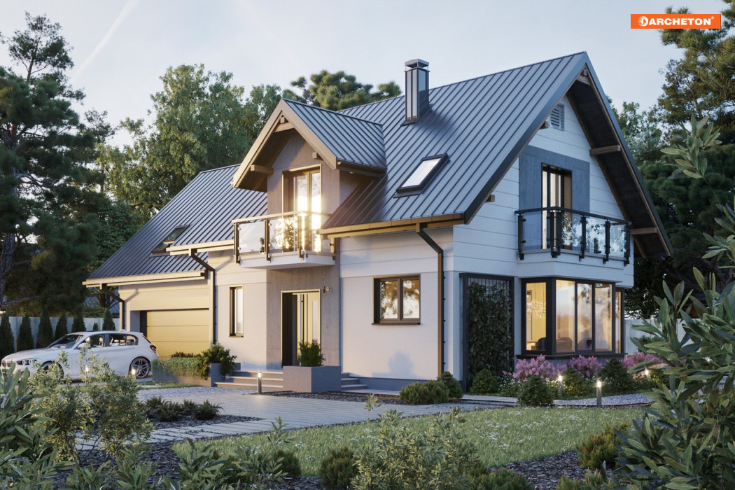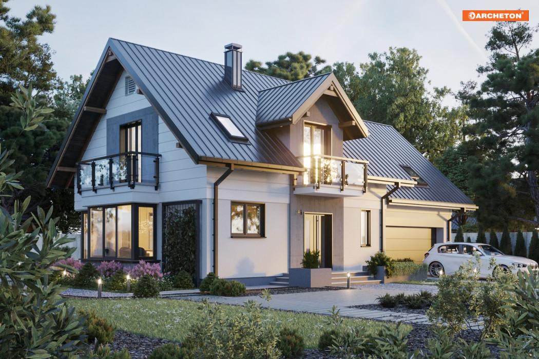Projekt średniej wielkości domu Axel Atu ma ekonomiczną bryłę łączącą mieszkanie i garaż z kotłownią. W przeciwieństwie do innych rozwiązań z rodziny Axla, w wersji Atu przewidziano osobne przekrycia dla obu części i dwustanowiskowy garaż. Dom mieści na parterze strefę dzienną z dodatkowym pokojem i część nocną pod dwuspadowymi dachami z lukarnami. Układ parteru z kominkiem jest otwarty, ale kuchnię wyraźnie oddzielono od salonu i otwarto z sieni przez spiżarnię. Zdecydowanie odmiennie rozwiązano także strefę wejścia: duży przedsionek z przejściem do garażu prowadzi wprost do salonu. Tu znajdują się wejścia do dodatkowego pokoju i na poddasze. Schody do strefy prywatnej są, przeciwnie niż w innych wersjach, proste. Główna sypialnia nad garażem, dostępna z wygodnego spocznika z pralnią, została wyróżniona nie tylko ustronnym położeniem ale też własną łazienką i garderobą. Na poddaszu, nad częścią mieszkalną, jest miejsce na trzy duże pokoje i komfortową, ogólnie dostępną łazienkę. Charakterystycznym detalem, który wyróżnia projekt domu Axel Atu, jest ryzalit na prostokątnym rzucie jadalni, zwieńczony w ścianie szczytowej jednym z czterech balkonów.