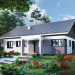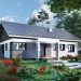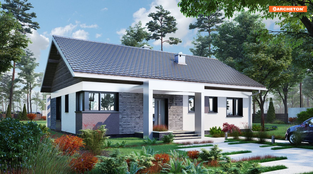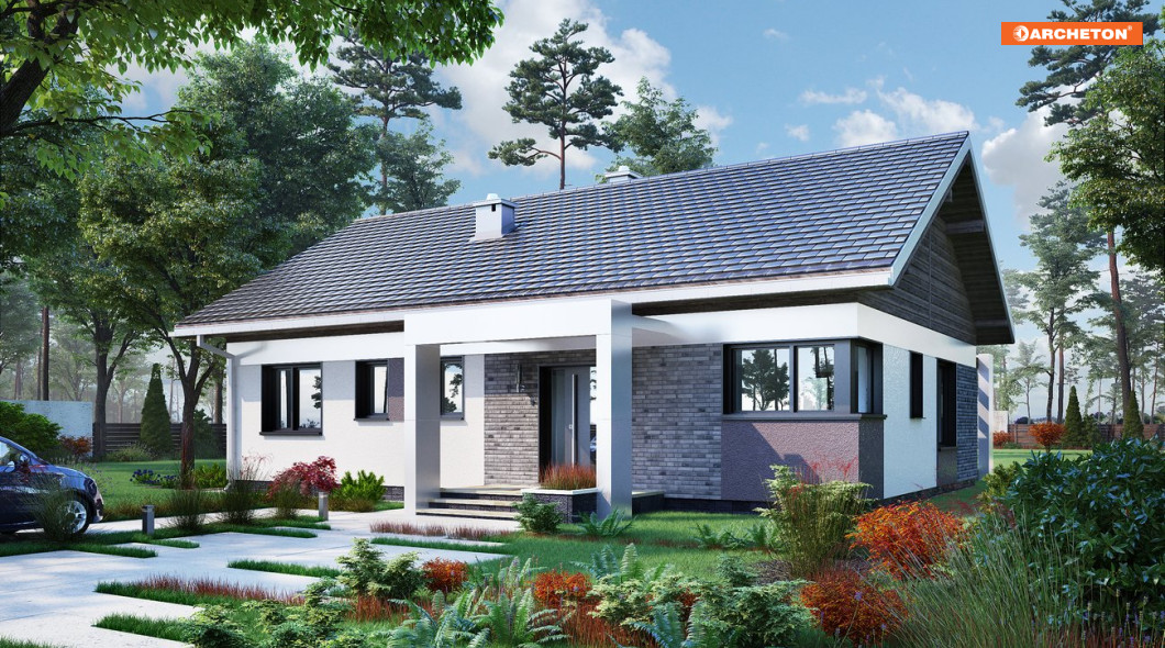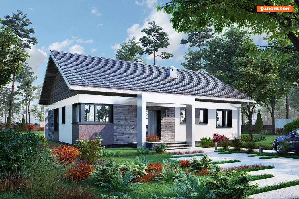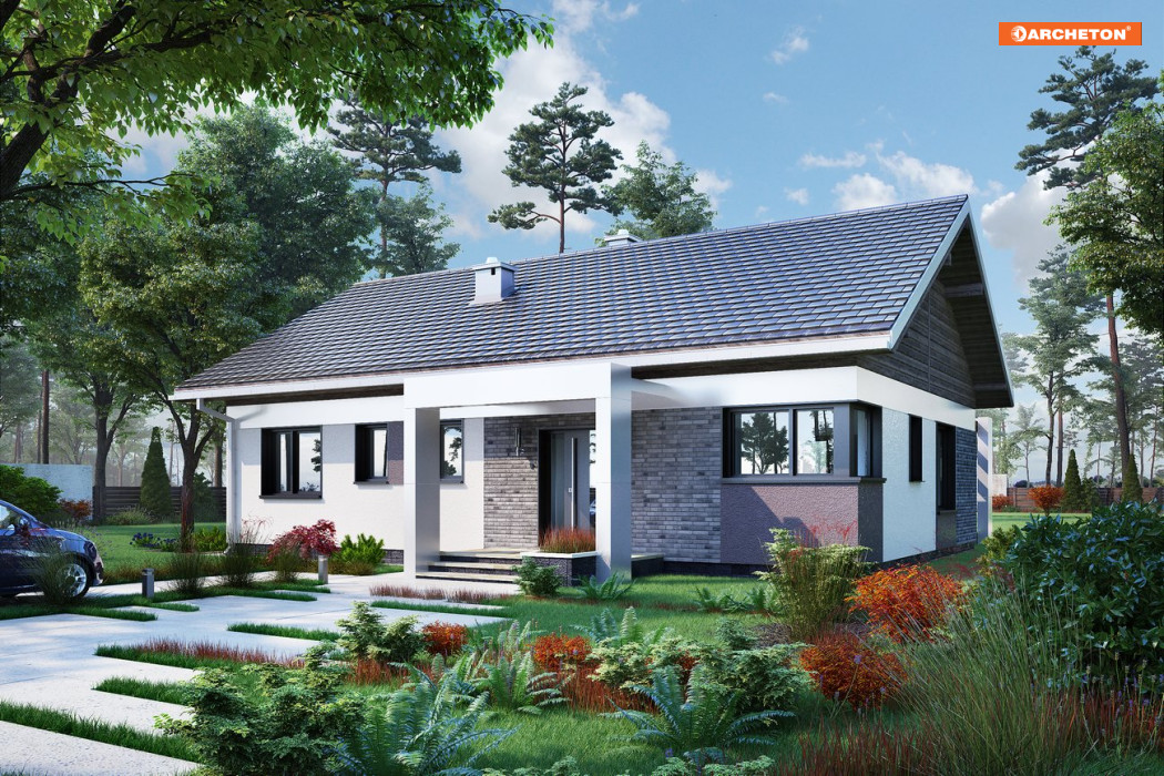 Wydłużony, prostokątny rzut i ekonomiczny dwuspadowy dach wyróżniają projekt domu Liwia w grupie rozwiązań parterowych, bez garażu, o powierzchni użytkowej ok. 100m2. Liwia jest nieco węższa od podobnej sylwetką, wielkością i lokalizacją wejścia (w dłuższej elewacji) Asterii. Czteroosobowa rodzina znajdzie tu, w zwartej bryle, wygodne mieszkanie. Wejście frontowe prowadzi wprost do obszernego salonu z otwartą kuchnią. Z holu, przez korytarz dostępne są też trzy sypialnie, oddzielone od części dziennej zespołem pomieszczeń sanitarnych z kotłownią. Pomyślano go tak, aby racjonalnie zblokować instalacje, a przy tym wydzielić osobne łazienki dla różnych części domu. Duża sąsiaduje z sypialniami, mniejsza znajduje się bliżej pokoju dziennego. Spiżarnia przy kuchni, sporo miejsca na szafę ubraniową w wygodnym holu i niemała kotłownia dopełniają komfortu mieszkania. Tak prosty, a jednocześnie tradycyjny budynek wykończyć można na różne sposoby i uzyskać dowolny efekt stylistyczny. Wizualizacja gotowego projektu domu Liwia proponuje nowoczesne geometryczne podziały elewacji i pergole akcentujące tarasy od frontu i ogrodu.
