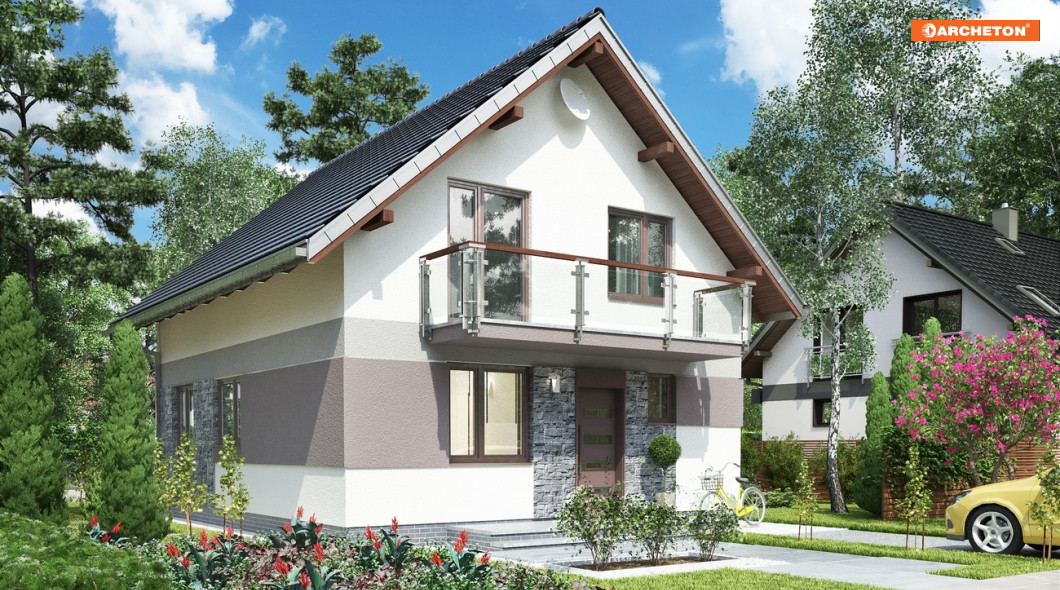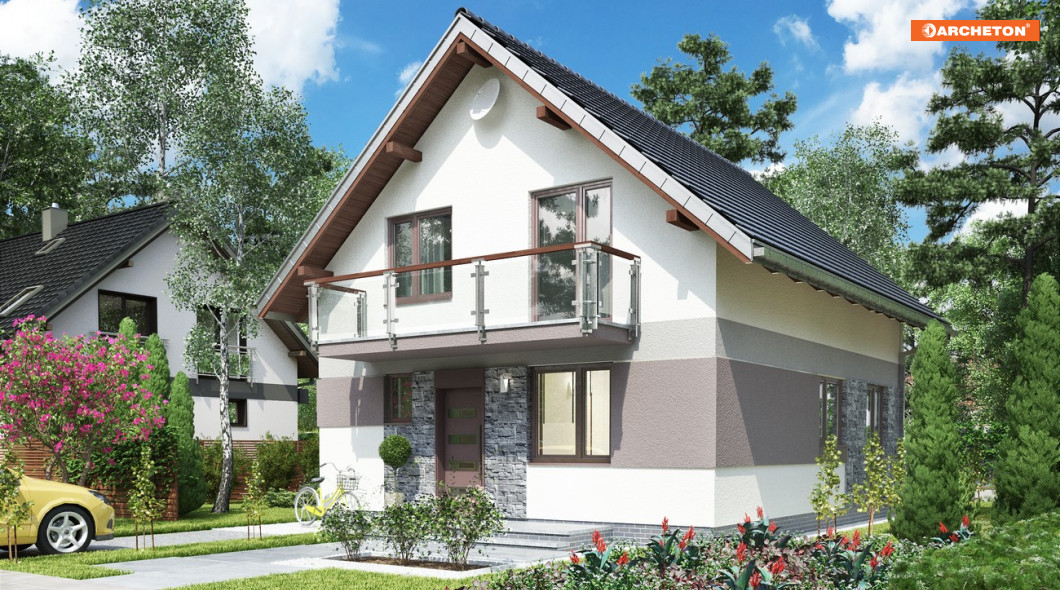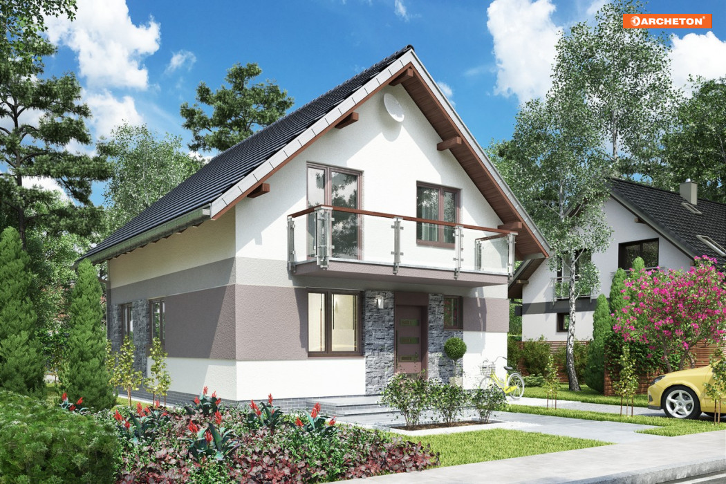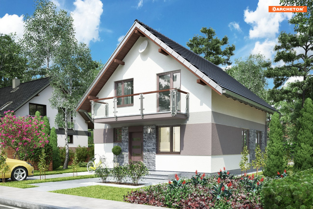 Jeśli ktoś planuje budowę małego domu jednorodzinnego z użytkowym poddaszem bez garażu, ale z dodatkowym pokojem na parterze, a ściana szczytowa ma być zwrócona do wjazdu na posesję, może wybrać z co najmniej trzech propozycji. Są nimi w ofercie Archetonu: Gutek, Promyk i Aldona - wszystkie o powierzchni ok 90-95m2 p.u. Projekt domu Promyk, będący NOWOŚCIĄ 2017, ma nieco większą, a przy tym bardziej zamkniętą kuchnię i prostszą bryłę niż Aldona (która proponuje niewielki ryzalit pod okapem). Od Gutka odróżnia go brak osobnej kotłowni, bo kocioł gazowy umieszczono w stosunkowo obszernej łazience przy wejściu do budynku. Ponadto dodatkowy pokój na parterze w Promyku jest największy. Na poddaszu rozmieszczono dalsze trzy sypialnie i kolejną, bardzo wygodną łazienkę. Pokój dzienny Promyka jest nieco mniejszy niż w Gutku i Aldonie ale został zręcznie podzielony na część z jadalnią, przy kuchni, oraz na salon z narożną kanapą i kominkiem. Architektura w projekcie domu Promyk jest prosta, urozmaicona pasami z różnych materiałów wykończeniowych. Front i wyjście do ogrodu osłaniają od deszczu i słońca, a przy tym akcentują w bryle, balkony.