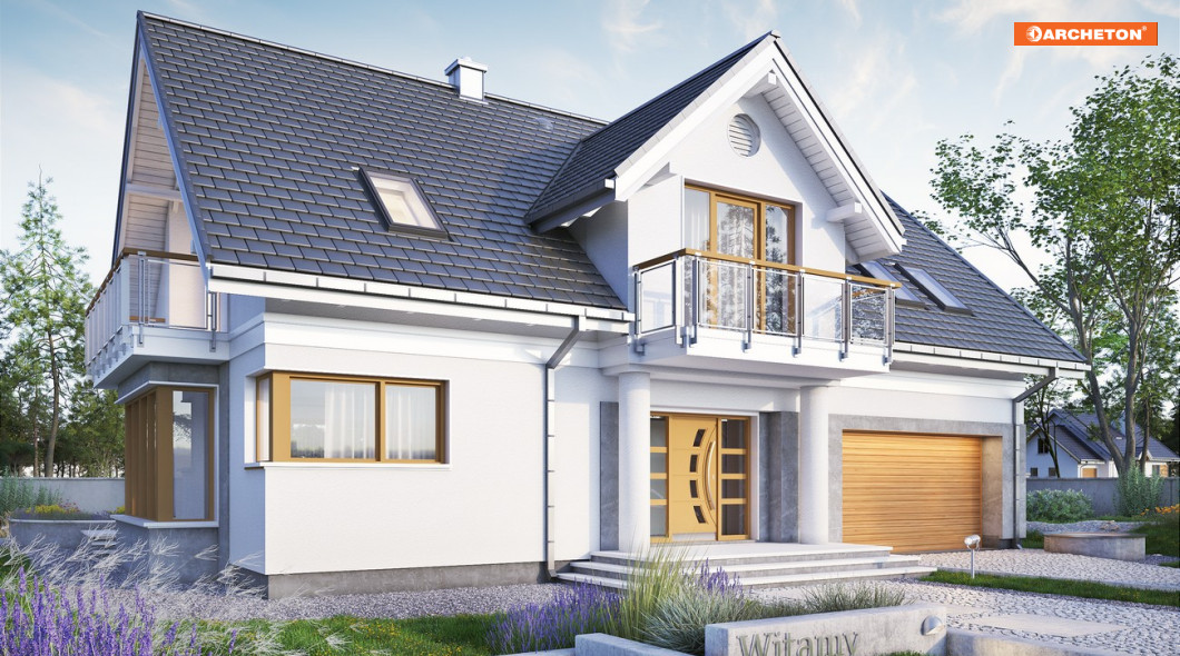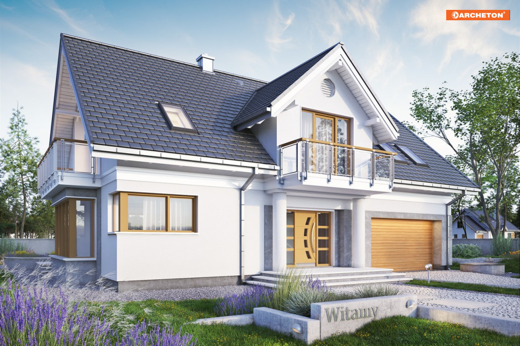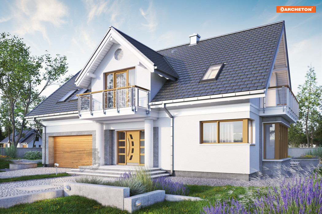 Tak jak Heliodor i Modesta, Lazuryt należy do projektów dużych domów na planie prostokąta, z dobudowanym garażem i dwuspadowymi dachami nad obiema częściami bryły. Projekt domu Lazuryt wyróżnia większa dyscyplina w kompozycji sylwetki. We wnętrzu parteru główną rolę powierzono centralnie położonemu kominkowi, który oddziela hol i tworzy z jadalnią główną oś - równoległą do kalenicy i zaznaczoną w elewacjach bocznych balkonami. We wnętrzu rysuje się wyraźnie część frontowa - z dużą kuchnią oraz ogrodowa - z dużym pokojem dziennym i z gabinetem. Projekt domu Lazuryt As zachowując te cechy proponuje nieco mniejszą powierzchnię oraz prostokątny, zamiast półkolistego, zarys przeszklenia jadalni i balkonu nad wejściem. Ma na poddaszu trzy obszerne pokoje oraz, nad dwustanowiskowym garażem, prywatny zespół głównej sypialni z dużą łazienką i z garderobą. Lukarny dachu osadzone od frontu na słupach, a w ogrodzie na ryzalicie gabinetu, wyznaczają drugą, prostopadłą oś budynku. Alternatywna w stosunku do rozwiązań większego Lazuryta jest propozycja nieco obszerniejszej kotłowni oraz mniejszego podcienia wejściowego, bez zadaszenia wjazdu do garażu.