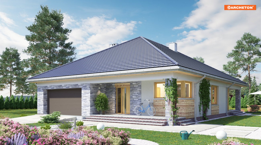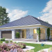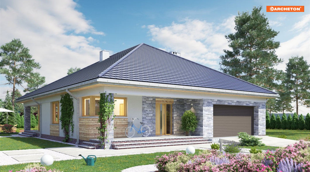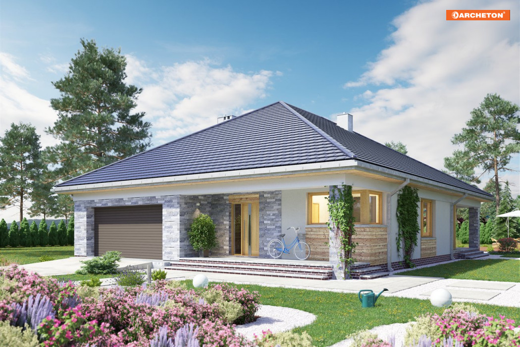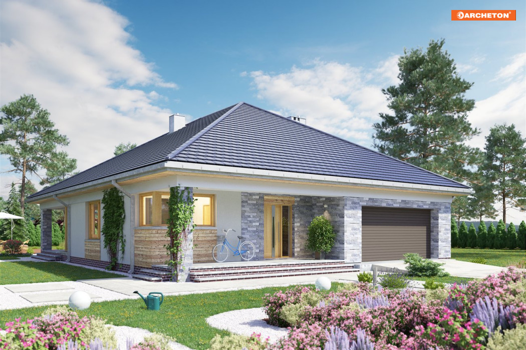 Dwustanowiskowy garaż w domu parterowym z czterospadowym dachem znaleźć można w projektach domów Karol czy Ksenia. Projekt domu Kordian jest zbliżony ale ma pośrednią powierzchnię i wydłużony zarys oraz dach z kalenicą. Jest to kolejna, obok jeszcze Ajaksa, Bratka czy Kseni propozycja jednolitej konstrukcji dachu nad dość rozbudowanym planem. Takie zestawienie form jest nie tylko ekonomicznym rozwiązaniem dla zamknięcia wnętrza mieszkania ale zapewnia jednocześnie stałą osłonę tarasom. Frontowy wprowadza do sieni i rozszerza widok z dużego kuchennego okna. Taras ogrodowy otwiera się z jednoprzestrzennego pokoju dziennego i głównej sypialni na tyłach domu. Oprócz niej, projekt domu Kordian oferuje jeszcze trzy mniejsze pokoje z możliwością rezygnacji z jednego z nich na rzecz większej kotłowni. Zespół dwóch łazienek zajmuje środek rzutu zapewniając optymalną dostępność i wykorzystanie miejsca bez kontaktu ze ścianą zewnętrzną (zastosować można świetlik tunelowy w dachu). Stosunkowo duże nachylenie połaci, żelbetowy strop oraz krokwiowe wiązary ułatwiają ewentualne wykorzystanie poddasza.