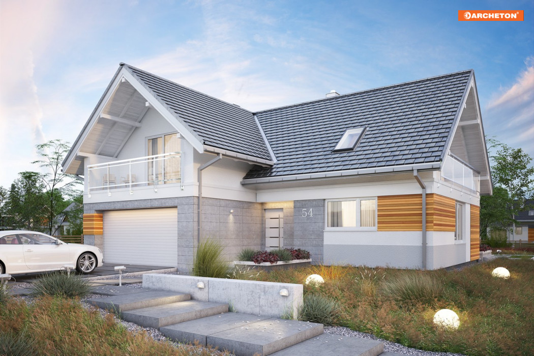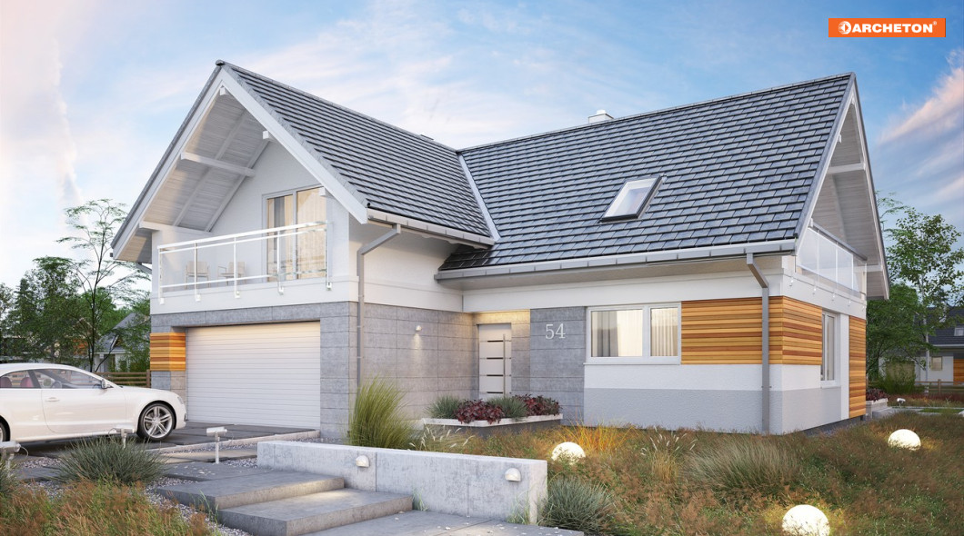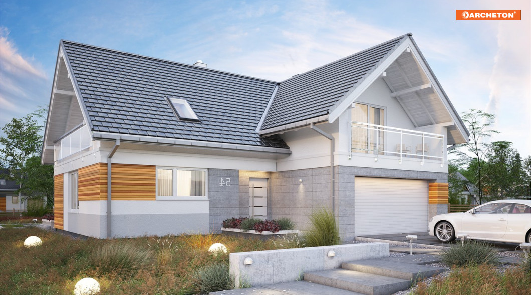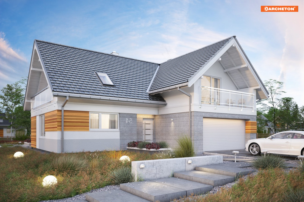 W grupie projektów domów parterowych z użytkowym poddaszem, podwójnym garażem, o p.u. ok 140m2 projekt domu Tobiasz wyróżnia niezwykle konsekwentna konstrukcja na planie litery T. Dwuspadowe dachy o identycznej wysokości i rozpiętości przenikają się podkreślając podział budynku na trzy skrzydła. W poziomie parteru każde z nich pełni odrębną funkcję. Ku wjazdowi na posesję wysuwa się obszerny garaż, głębiej znajduje się główna część mieszkalna z przestronną, otwartą strefą dzienną. Duża sypialnia z własną wygodną łazienką i wyjściem na taras położona jest ustronnie na tyłach ogrodu. Dzięki niej Tobiasz może nie tylko zaoferować niekrępujący pokój gościnny ale także sprawdzić się w roli domu wielopokoleniowego. Na poddaszu wszystkie skrzydła zajmuje wygodna strefa nocna dla 5 osób, a obie kondygnacje łączą centralnie położone schody z pomieszczeniami kotłowni i łazienek Elegancja architektury w projekcie domu Tobiasz to nie tylko zasługa prostej i czytelnej kompozycji bryły. Specyficznego uroku przydają budynkowi głębokie loggie w każdej z trzech ścian szczytowych, dostępne z sypialni poddasza.