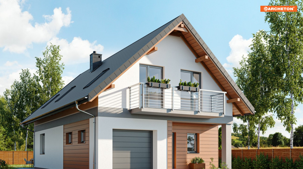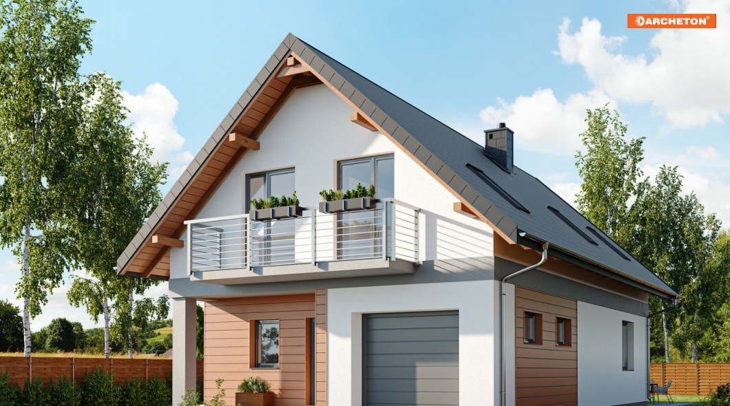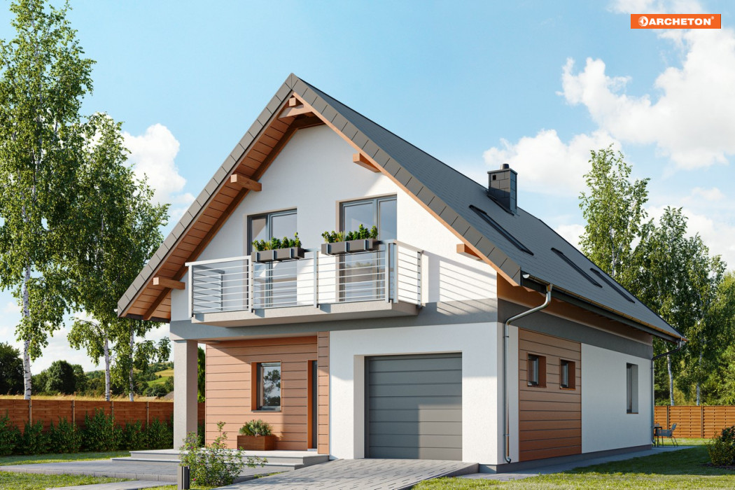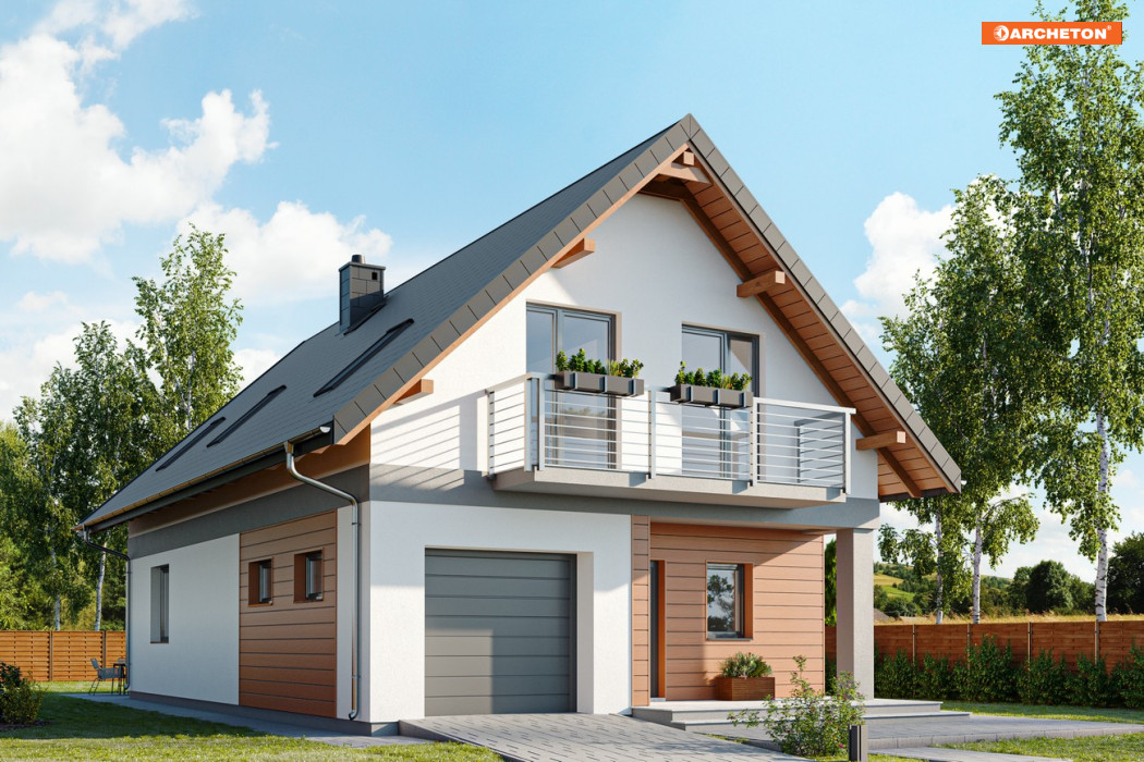 Projekt domu parterowego Lobelia Prima, podobnie jak mniejsza Lobelia, powstał z myślą o wąskiej działce. Budynek ustawiono szczytem dachu do wjazdu na parcelę. Plan tego niewielkiego domu z użytkowym poddaszem i z wbudowanym garażem, w wersji Prima, nieco wydłużono. Zachowano szerokość, a także rozkład pomieszczeń: garaż połączony sienią z holem i dalej otwarty pokój dzienny. Oddzielono jednak łazienkę od dużej kotłowni znajdującej się przy wejściu. Jasny salon z wydzieloną jadalnią są wyjątkowo dobrze nasłonecznione z trzech stron świata. Okno w dłuższej ze ścian kuchni doskonale oświetla blaty. Architekt zaprojektował ściany nośne tak, że kuchnię można zamknąć lub włączyć we wspólną przestrzeń parteru. Oprócz wygodnej wnękowej szafy w holu, pod schodami przewidział dwa praktyczne schowki. Pod dwuspadowym dachem jest miejsce na cztery sypialnie i drugą, przestronną łazienkę z dużym oknem w lukarnie. Prostą, energooszczędną bryłę domu Lobelia Prima urozmaicają także podcienie: od frontu i od ogrodu. Dodatkową osłonę przed słońcem i opadami dają długie balkony otwierane z sypialni. Zbliżony wygląd i rozkład mają większe domy w Rodzinie Dominika.