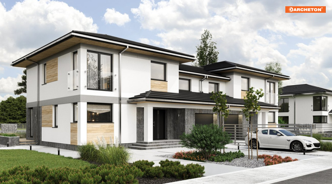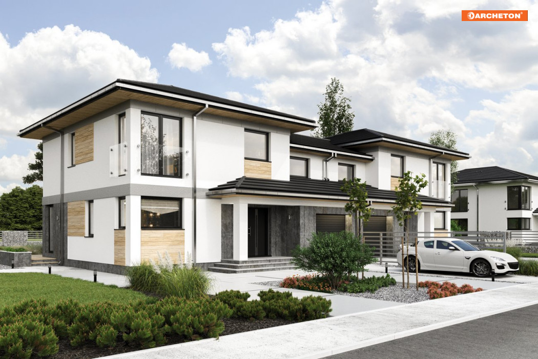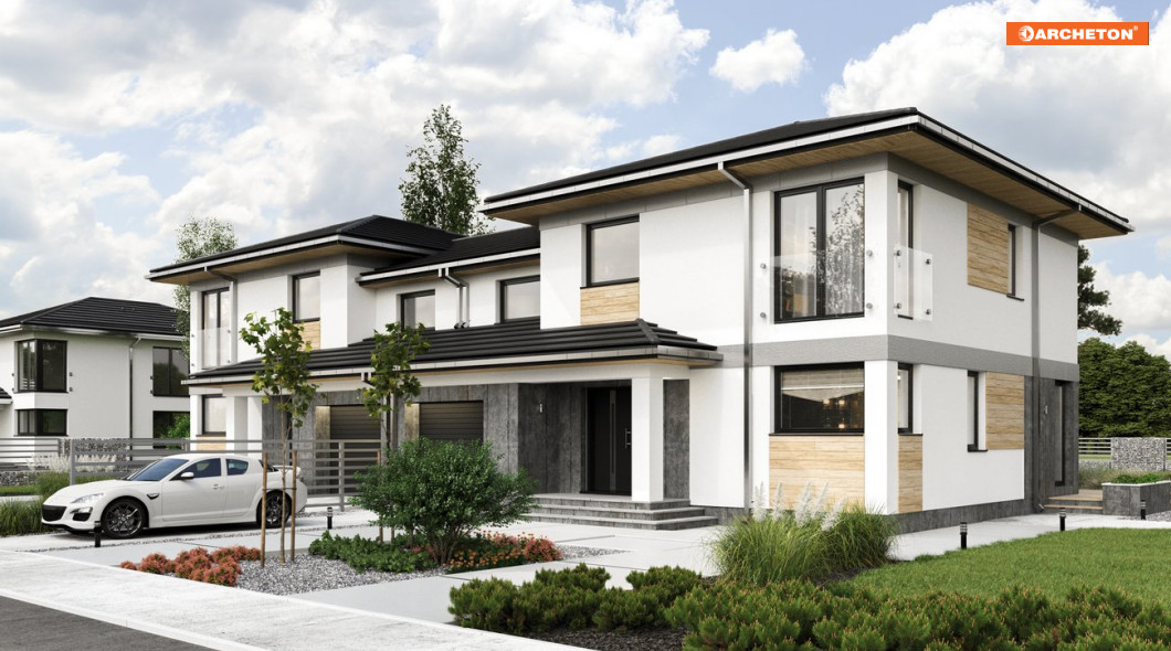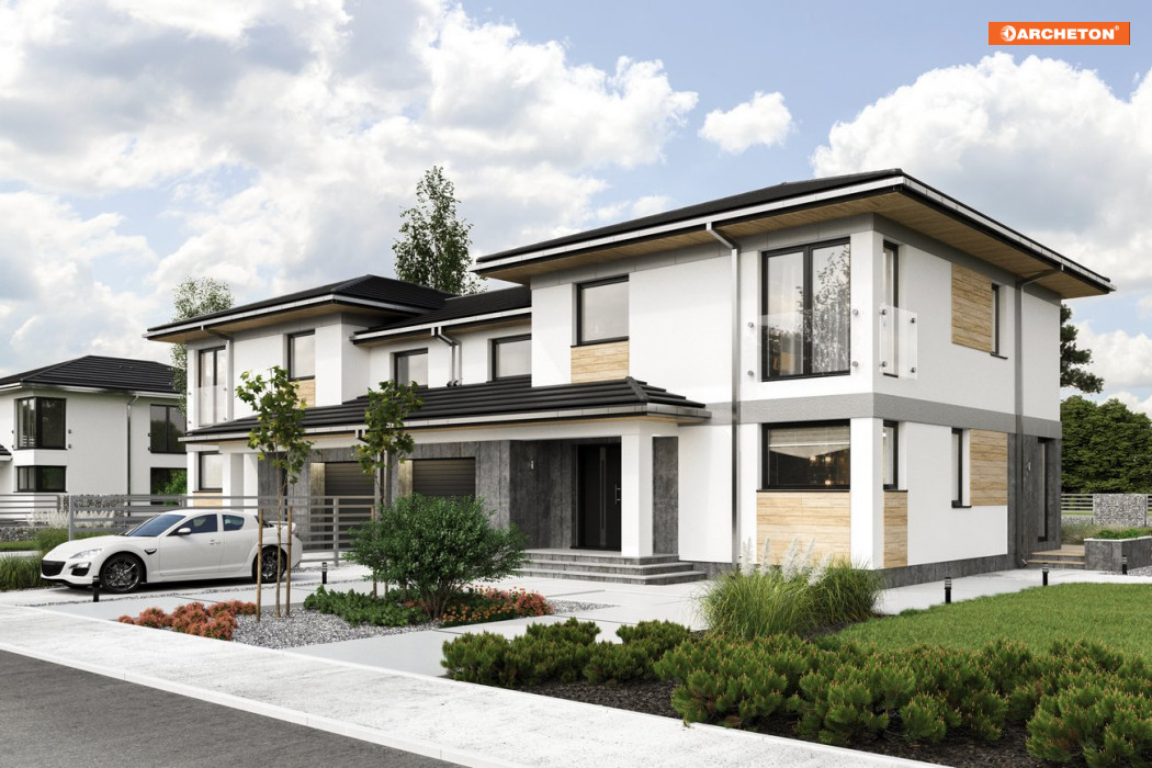 Dwa wygodne lokale mieszkalne proponuje projekt piętrowego domu jednorodzinnego Igor Duolit. Rozplanowano je tak, jak w wariancie do zabudowy bliźniaczej - w projekcie domu Igor Duo. Do części mieszkalnej dostawiono, przesunięty ku frontowi, garaż z kotłownią. Na parterze, oprócz przedsionka i WC, zamknięto tylko przestrzeń pod częścią klatki schodowej. Pokój dzienny jest dzięki temu niezwykle przestronny, oświetlony z trzech stron świata. Duża kuchnia ma sporą spiżarnię i ergonomiczny układ sprzętów. W centrum znalazł się tu barek na szybką poranną kawę. Podział schodów na biegi różnej długości wydzielił na osobnych poziomach pokój z łazienką i pralnię oraz wyżej - główną część nocną z trzema sypialniami. Zdyscyplinowane prostopadłościany bryły Igora mają czterospadowe, niezbyt strome dachy z krótką kalenicą. Wejścia główne są oddzielone garażami i akcentowane daszkiem na słupie. Również narożne okna salonu i kuchni dają poczucie prywatności. Nowoczesny styl podkreślają narożne okna salonu i kuchni oraz przeszklenia z barierką zamiast balkonów. Wszystko to decyduje o willowym, reprezentacyjnym wyglądzie.