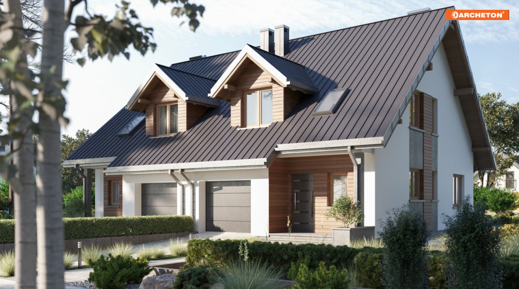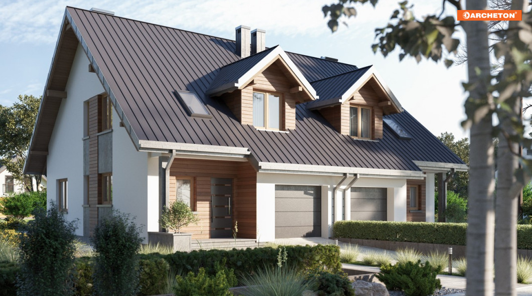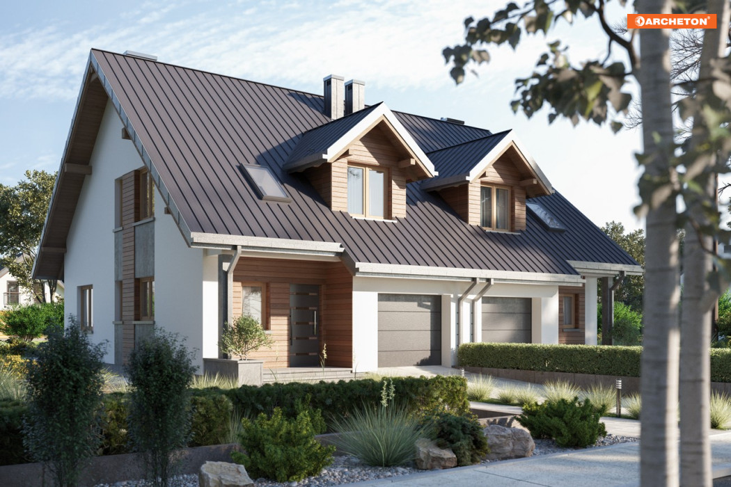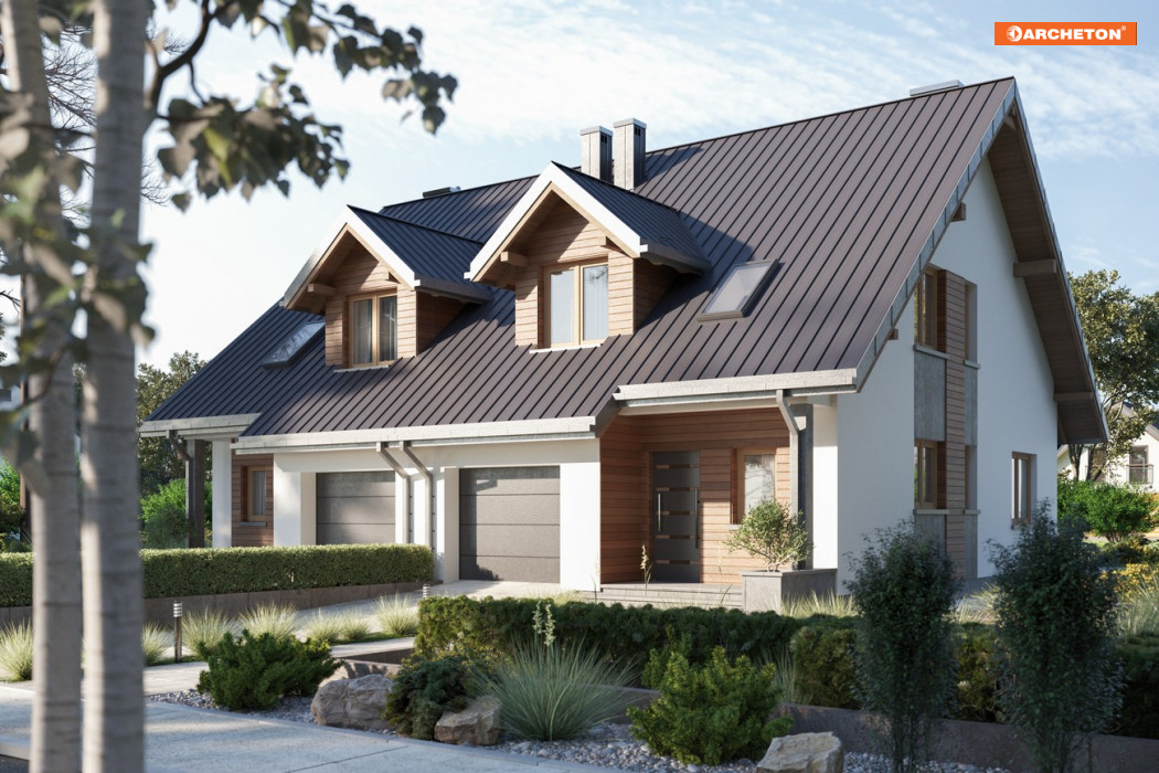 Jeśli w planach jest budowa domu jednorodzinnego z dwoma lokalami, to na niezbyt szerokiej działce sprawdzi się projekt domu Ariel Duolit. Jego bryła z użytkowym poddaszem sięga daleko w głąb parceli. Wąski front ma wysunięte wbudowane garaże z obniżonym okapem. Powstałe w narożnikach wnęki ze słupami akcentują samodzielne wejścia do mieszkań. Tu, z holu, tylko krok z zakupami do otwartej, dobrze oświetlonej kuchni z miejscem do jedzenia. Część blatów została zasłonięta sienią. Dalej, pomiędzy wc z kotłem kondensacyjnym i schodami ze schowkiem otwiera się duży salon z kominkiem i jadalnią. Widok na ogród dociera stąd aż do kuchennego stołu dzięki szerokiemu oknu balkonowemu. Pod dwuspadowym dachem, na drugim poziomie, rozplanowano trzy sypialnie z dużą, jasną, pięknie zaaranżowaną, łazienką. Projekt domu Ariel Duolit ma zwartą, ekonomiczną bryłę z lukarnami w dachu. W większej, głównej sypialni z wygodną garderobą, lukarna ma wyjście na balkon. Razem z równie głębokim okapem osłania on szczelnie przed słońcem, wiatrem i deszczem taras znajdujący się poniżej. Latem wystarczy rozpiąć nad ogrodowym fotelem lekki, płócienny żagiel by korzystać tu z relaksu.