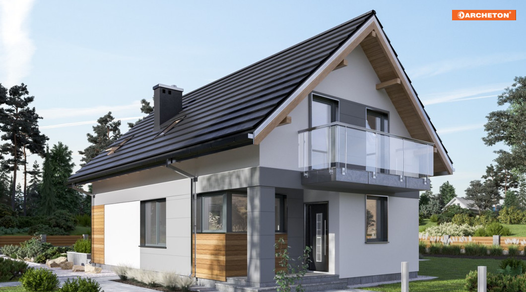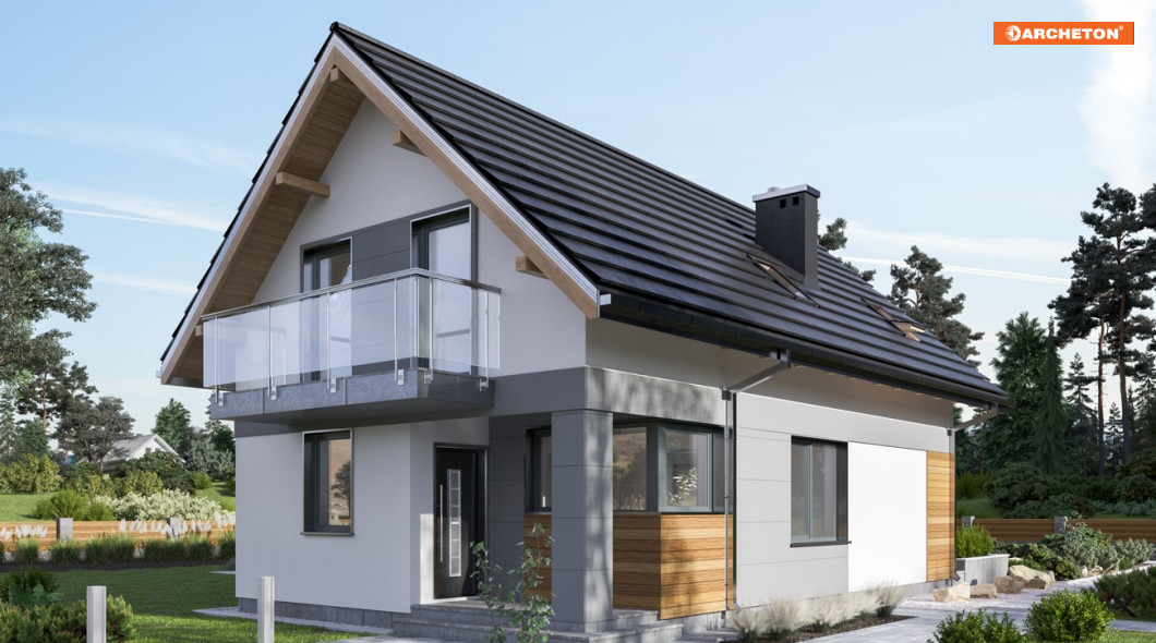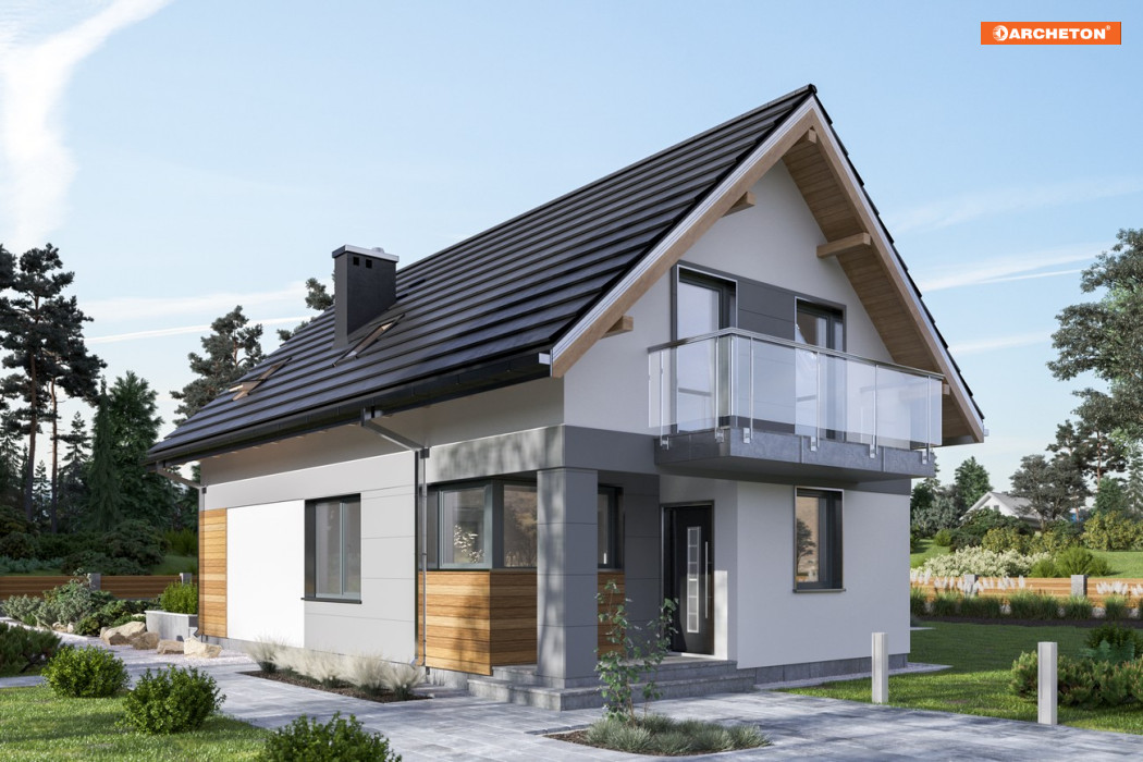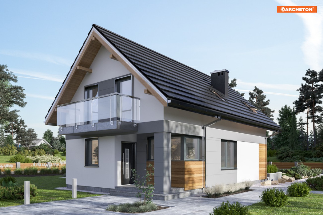 Smukły jak mrówka musi dom na parcelę nie szerszą niż 16m. Jeśli budynek ma stanąć szczytem dachu do drogi, być bez garażu i mieć ok. 100-110m2 p.u,, to można wybrać spośród kilku projektów parterowych domów z użytkowym poddaszem Archetonu. Projekt domu Mrówka jest jednym z nich ale nie przewiduje piwnic, jak Alfred. Tak jak on ma wejście główne w krótszej ścianie, dzięki czemu, inaczej niż w Longinusie, front czytelnie wskazuje dostęp do budynku. Akcentuje to także narożna wnęka prowadząca przez wygodną sień do mieszkania. Parter wyraźnie podzielono na związany z ogrodem salon oraz na otwartą część komunikacyjną przy wejściu. Jasna jadalnia stanowi jej centrum i jednocześnie jest aneksem kuchni. Na poddaszu architekt przewidział miejsce na cztery niewielkie ale przemyślane w układzie pokoje i sporą łazienkę. Projekt domu Mrówka ma gładki dach bez lukarn. Dlatego okna sypialni w ścianach szczytowych są duże, z wyjściami na balkony osłaniające tarasy. Przeszklone narożniki budynku umożliwiają wygodny wgląd na posesję, jasno oświetlają miejsce pracy w kuchni i sprzyjają relaksowi w salonie. Duża powierzchnia otworów podkreśla delikatne proporcje bryły.