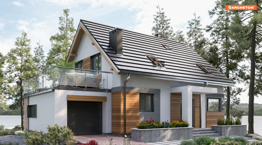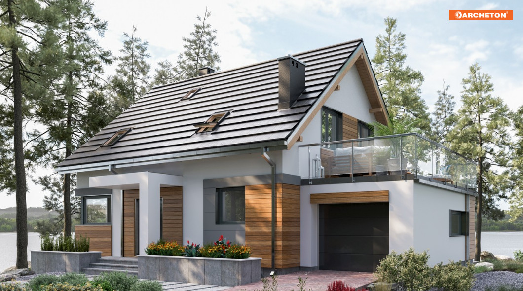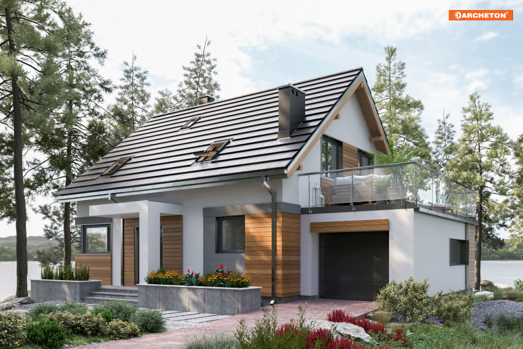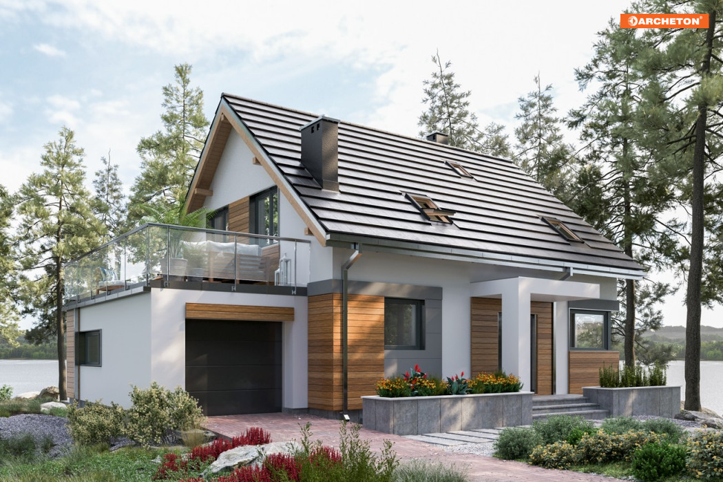 Ryzalit jest detalem często używanym do urozmaicania formy prostych, ekonomicznych projektów domów. W rodzinie Figi zaproponowano go jako przeszklony element salonu od strony ogrodu. Projekt domu Figa jest średnim wariantem wśród kilku pokrewnych, niewielkich koncepcji z użytkowym poddaszem i z dodatkowym pokojem na parterze. Wszystkie wersje powstały na planie prostokąta o proporcjach kwadratu. Podzielono go na dwie połowy wzdłuż kalenicy dwuspadowego dachu bez lukarn. Ściana nośna decyduje o tradycyjnym, zamkniętym charakterze pomieszczeń. Część frontowa, z kuchnią oświetloną narożnym oknem, ma przeznaczenie gospodarcze. Duży hol rozprowadza także do sieni, łazienki oraz do kotłowni wykorzystującej przestrzeń pod schodami na poddasze i łączącej mieszkanie z dostawionym do ściany bocznej garażem z pulpitowym dachem. Od ogrodu znajduje się salon i pokój, które łatwo połączyć w jedną, większą przestrzeń. Projekt domu Figa ma na poddaszu trzy wygodne sypialnie dla 4 osób z piękną łazienką. Szerokie wyjścia na balkon i taras w ścianach bocznych oraz płyta z słupem akcentująca front dodatkowo wzbogacają zwartą bryłę.