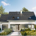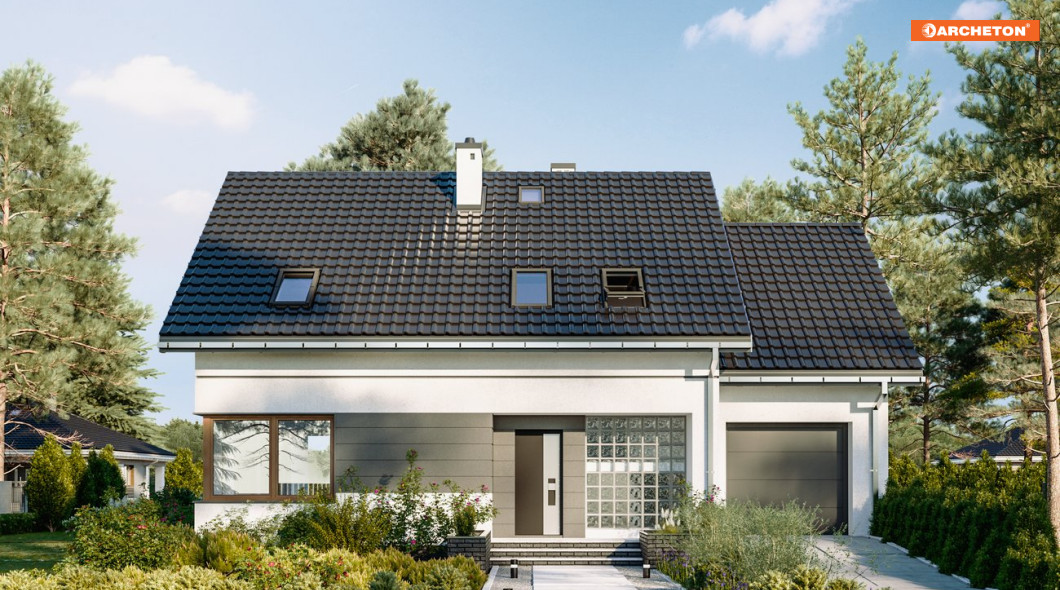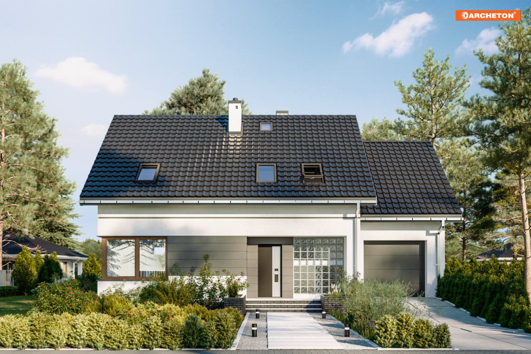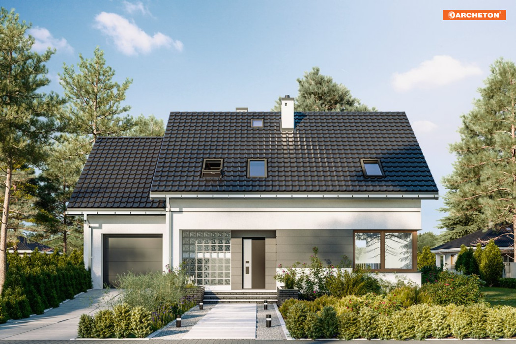 Południowy wjazd i prostą bryłę znajdą w projekcie domu Bartek inwestorzy planujący budowę niewielkiego lokum z garażem. Zainteresowane będą osoby preferujące oddzielną, dużą kuchnię ze spiżarnią, bo choć parter jest otwarty, to salon stanowi osobno zarysowaną przestrzeń. Także ruch parter-poddasze odseparowano wyraźniej niż w innych rozwiązaniach. Schody ulokowano na uboczu holu, dzięki czemu trzy duże sypialnie z łazienką zapewniają na górze sprzyjającą relaksowi ciszę. Wyjątkowo długi jest garaż, bo miejsce na piec gazowy przewidziano w projekcie domu Barek na poddaszu, w sporej pralni ze schowkiem. Część garażowa ma przeznaczenie gospodarcze i jest niższa od mieszkalnej. W tradycyjnej bryle z dwuspadowymi dachami wyróżnia się kilka nowoczesnych detali. Od frontu, odblaskami pustaków szklanych migocze ściana schowka pod schodami. Ogrodowy narożnik został w całości przeszklony i bez szkody dla oświetlenia wnętrza ustąpił miejsca w obrysie pokoju dziennego na cienistą wnękę tarasu.