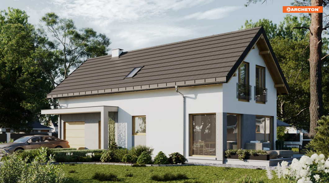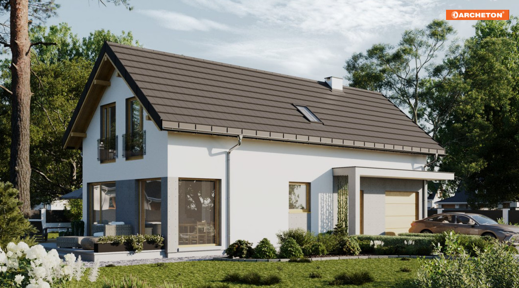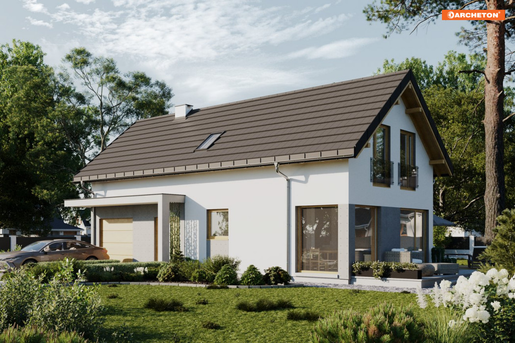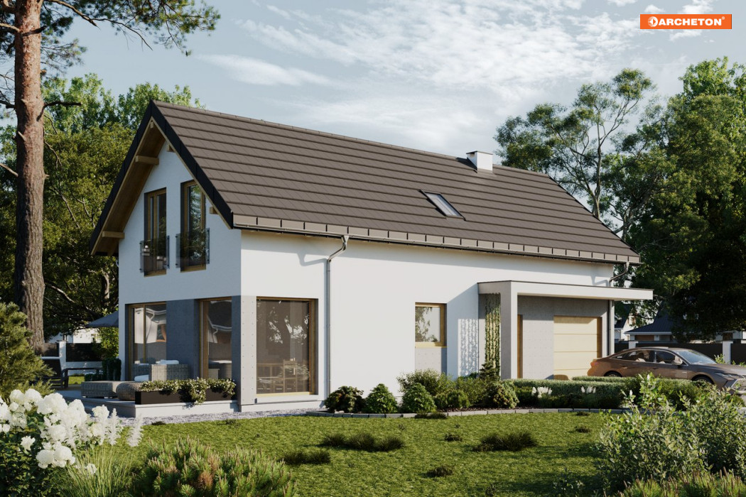 Gotowe projekty domów na trudniejsze działki to rzadkość. Projekt niewielkiego domu Liana z użytkowym poddaszem i garażem to coś dla posiadaczy płytkich, szerokich parceli. Wąskim rzutem przypomina Longinusa, który jednak, zamiast garażu, proponuje na parterze dodatkowy pokój. W Lianie czwarta sypialnia znalazła się na poddaszu, razem z główną - wyposażoną we własną łazienkę. Kuchnia i otwarte schody wpisują się w jednoprzestrzenny układ parteru w sposób, który poszerza optycznie szczupły plan domu. Zarówno projekt domu Liana jak i rodzina Longinusa sprawdzą się na działce z wjazdem od południa. Ogrodowa ściana nie ma otworów, a jedynie doświetlenie schodów z pustaków szklanych. Pozwala to przysunąć budynek do granicy na tyłach działki na odległość do 3m. Duże, frontowe przeszklenie salonu i narożne okno jadalni rekompensują z nawiązką ilość światła dziennego we wnętrzu. Razem ze smukłą sylwetką, podkreśloną jeszcze dwuspadowym, strzelistym dachem, tworzą nowoczesny wizerunek Liany.