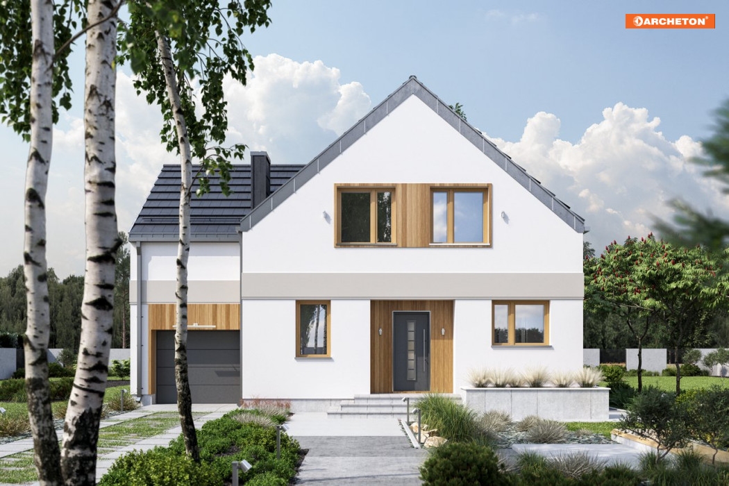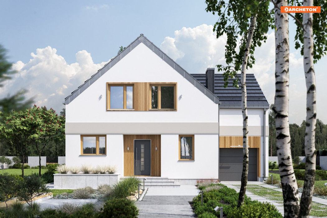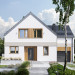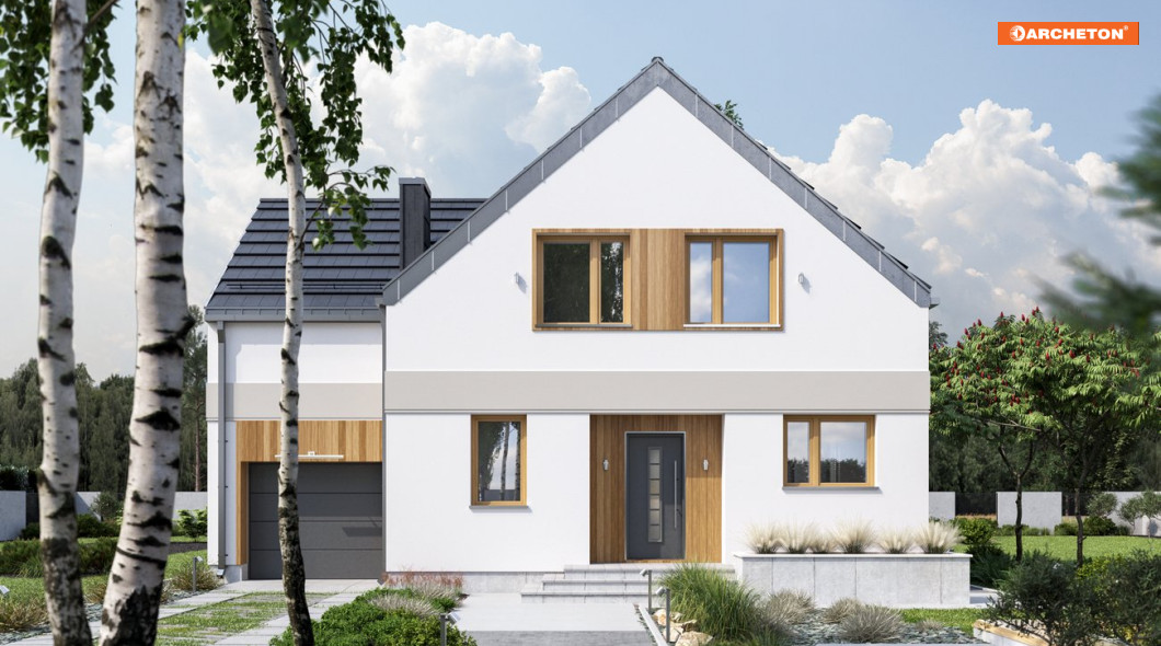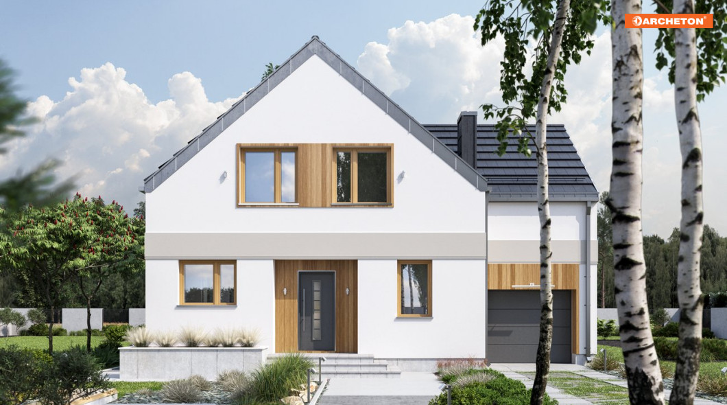 W naszej ofercie prostych domów z pojedynczym garażem i dwuspadowym dachem, o powierzchni użytkowej ok. 130m2 tylko projekt domu Borówka ma plan o schemacie litery T. Różnej wysokości dwuspadowe dachy przenikają się na styku części garażowej i mieszkalnej. Mają zredukowane (w stylu „nowoczesnej stodoły”) okapy. Na parterze, oprócz otwartego pokoju dziennego i łazienki z kotłownią, przewidziano dodatkowy pokój. Układ pełnego mieszkania na parterze jest idealny do etapowego wykańczania budynku. Klatka schodowa (z przejściem do garażu) umieszczona została na osi symetrii planu i wraz z dużym oknem nad stołem jadalni czytelnie porządkuje centrum otwartego wnętrza. Na dwupoziomowym poddaszu 6-osobowa rodzina ma do dyspozycji 5 zgrabnych sypialni i dwie łazienki. Gładkie, ascetyczne elewacje w projekcie domu Borówka to propozycja energooszczędna i ekonomiczna. Brak balkonów usatysfakcjonuje osoby, które wolą zainwestować w urządzenie ogrodu i relaks na otwartej przestrzeni.