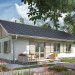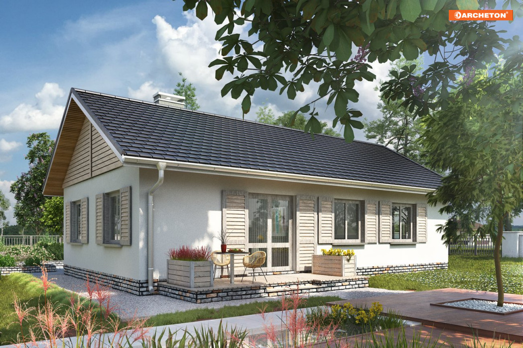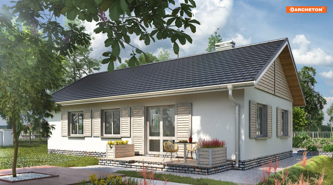 Projekt domu Żuczek-2 jest mniejszym wariantem w Rodzinie Żuczka, powstałej z myślą o działkach z wjazdem od południa. Niewielkie domy parterowe i garaż połączono w niej wspólnym przedsionkiem z dużą kotłownią. Obie części budynku utworzyły bryłę na planie litery T, przekrytą dwuspadowymi, przenikającymi się dachami. Część mieszkalna, nieco wyższa, wysuwa się ku fontowi, zwrócona do niego ścianą szczytową. Dzięki temu z tarasu wejściowego powstało praktyczne patio częściowo osłonięte podcieniem na słupach, a strefa rekreacyjna ogrodu oddzielona została od wjazdu. Mieszkanie, we wszystkich wariantach Żuczka, to wygodne lokum dla 3-4 osobowej rodziny. Tradycyjnie podzieloną strefę dzienną (salon + kuchnia ze spiżarnią) z wyjściem na taras odseparowano od położonej w głębi posesji części prywatnej z trzema sypialniami i łazienką przy pomocy holu z dużą szafą i z wc Projekt domu Żuczek-2 jest o kilka m2 mniejszy od Żuczka Sto. Bardziej zwarty zarys ścian zewnętrznych salonu oraz typowe w układzie i wysokości okna tej wersji sprzyjają tradycyjnemu wykończeniu elewacji.