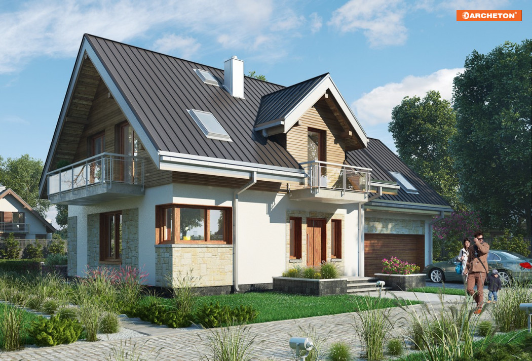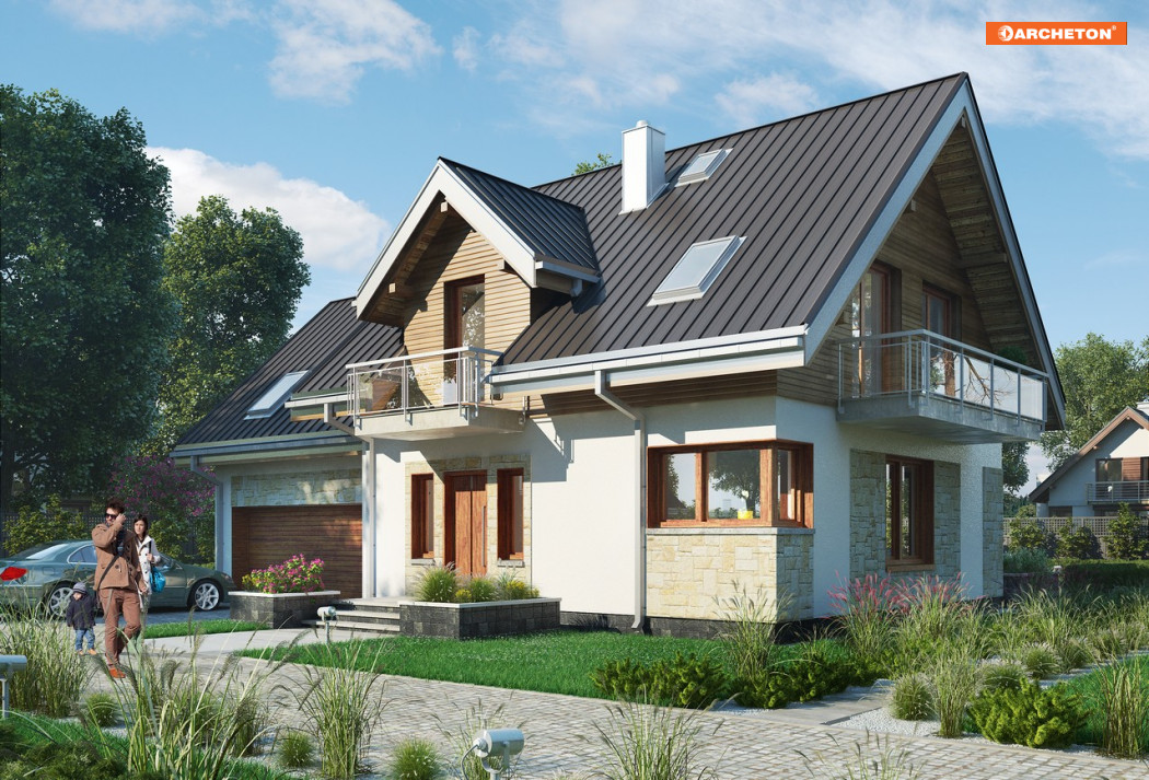 Koncepcje Zofii, do których należy projekt domu Zofia G2, to kilkanaście wersji domu parterowego z użytkowym poddaszem w różnych technologiach muru, z alternatywnymi powierzchniami pomieszczeń i położeniem kuchni oraz z różną ilością miejsc garażowych. Domy mają powierzchnię od 110 do 154 m2 i proponują lokum dla 4-5 osób, rozplanowane na parterze i dwupoziomowym poddaszu. Średnia wśród nich Zofia G2 należy do tej części rodziny, w której bryłę mieszkalną i garażową przekrywają dwa osobne dwuspadowe dachy. Obie łączy przejście z holu, powiązane z różnicą poziomów i konstrukcją klatki schodowej. W przeciwieństwie do pokrewnej Zoi, kominek usytuowany jest w Zofii zawsze w centrum parteru. Brak spiżarni rekompensuje w Zofii G2 większa powierzchnia kuchni oraz wygodne otwarcie na salon. Główna sypialnia nad garażem wyróżnia się zawsze wielkością i ustronnym usytuowaniem. W projekcie domu Zofia G2 zaproponowano tu dodatkowo pralnię dostępną z półpiętra. O eleganckiej stylistyce Zofii decydują proporcje bryły oraz lukarna z balkonem urozmaicająca front. Narożne kuchenne okno oraz brak ryzalitu w ścianie bocznej to ukłon w stronę nowoczesności i prostoty.