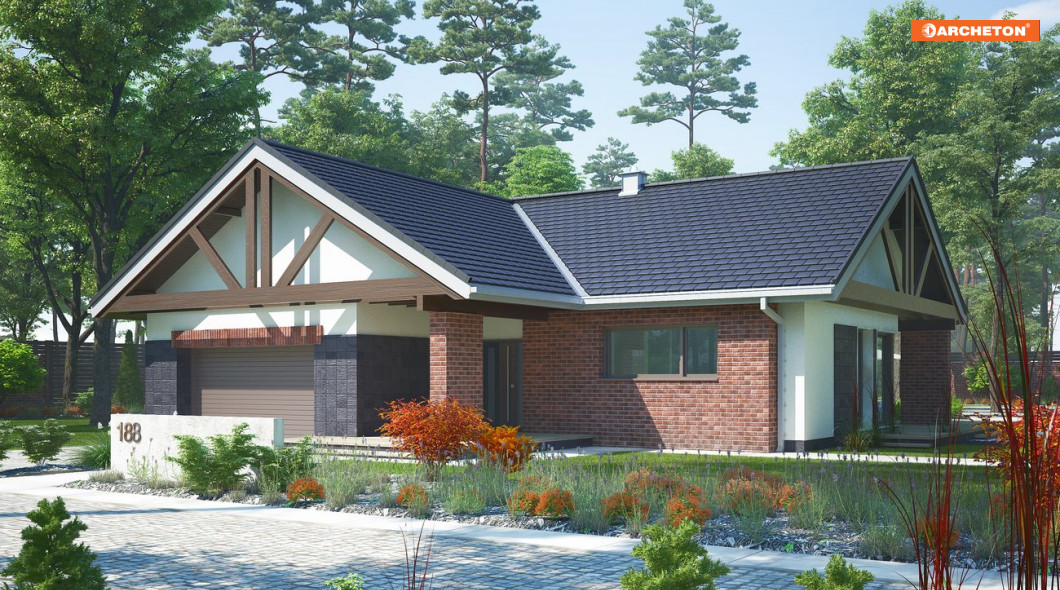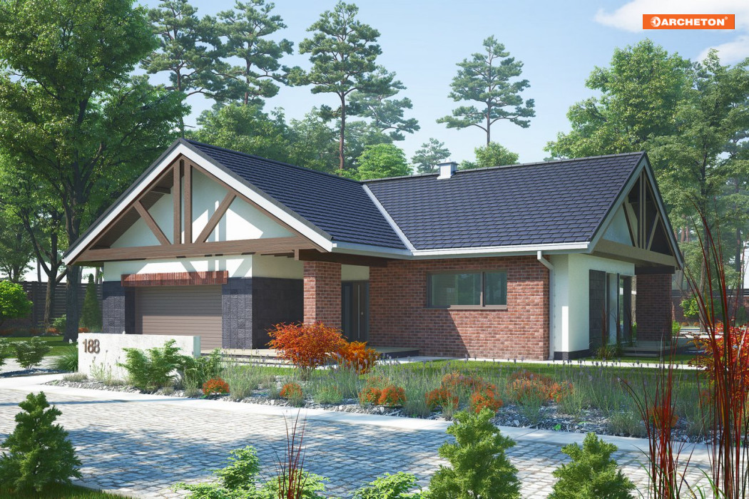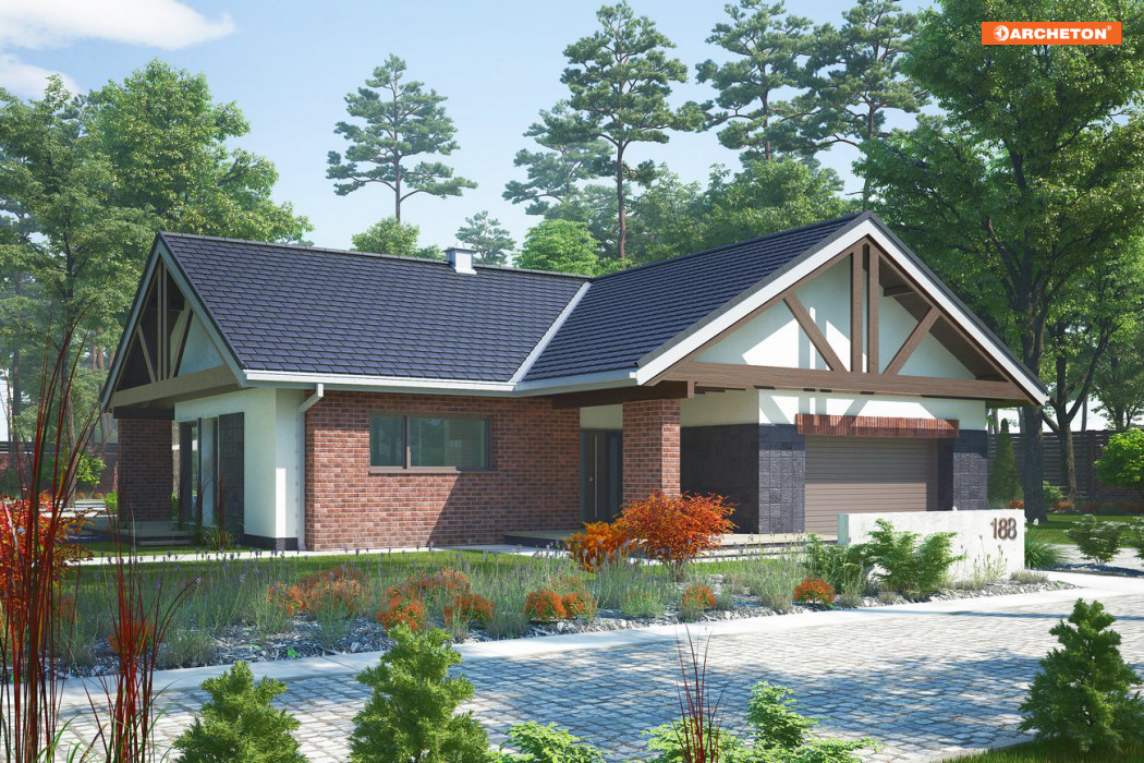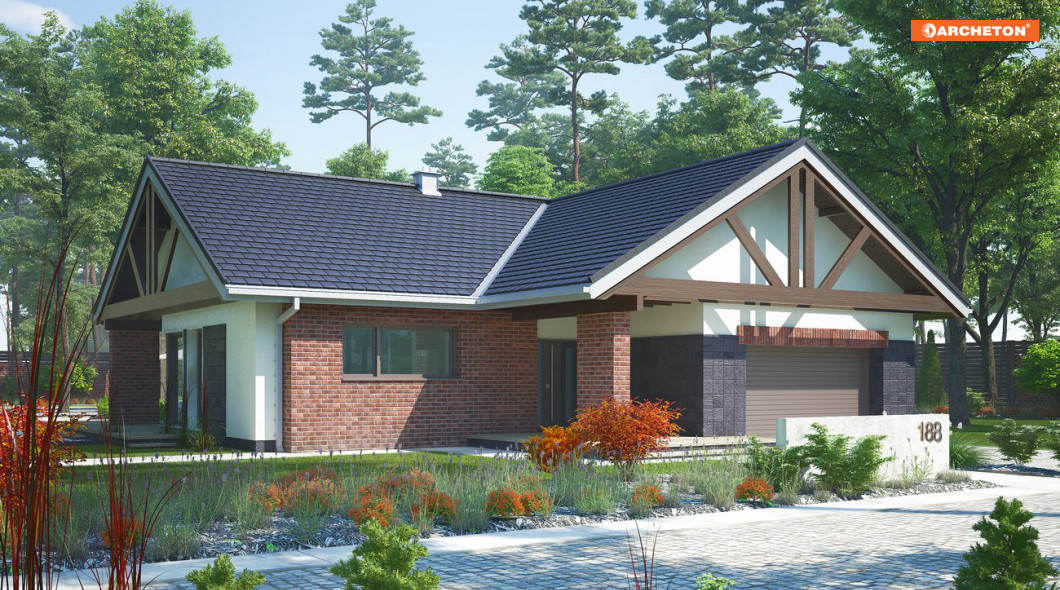 Projekt domu Artemida jest największym parterowym założeniem z garażem dwustanowiskowym Archetonu. Przy powierzchni użytkowej ponad 160m2 projektant wybrał dwuspadowy dach. Ten typ przekrycia, nad rzutem w kształcie litery T, nadaje nowoczesny charakter architekturze ale podkreśla długość dwuskrzydłowej elewacji. Znalazły się w niej okna łazienek i pomieszczeń gospodarczych, co najlepiej sprawdzi się na działce, gdzie sąsiedztwo od jednej z granic nie jest atrakcyjne i należałoby się od niego odseparować. Strefę dzienną i sypialnie otworzyć można wówczas na pozostałą część parceli urozmaiconym przebiegiem ścian, wnęk i tarasów. Artemida ma w tej części efektowny układ pokoju dziennego i dużą kuchnię ze spiżarnią oraz miejscem na wyspę. Długi stół i kominek oddzielają ją od reprezentacyjnej części przestronnego salonu. Skrzydło z czterema sypialniami wsunięto w głąb ogrodu i oddzielono cichym przedpokojem. Front akcentuje ramię garażowe z wejściem głównym w podcieniu. Wykończenie szczytów drewnianymi elementami, kamień i klinkier w projekcie domu Artemida nawiązują do stylistyki rustykalnej i klimatów dawnych zabudowań stadnin.