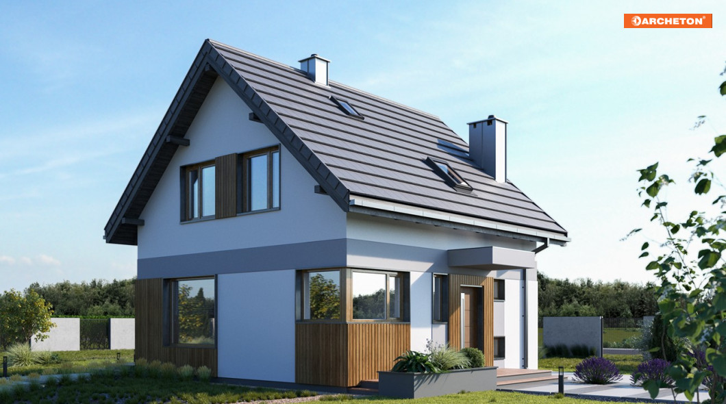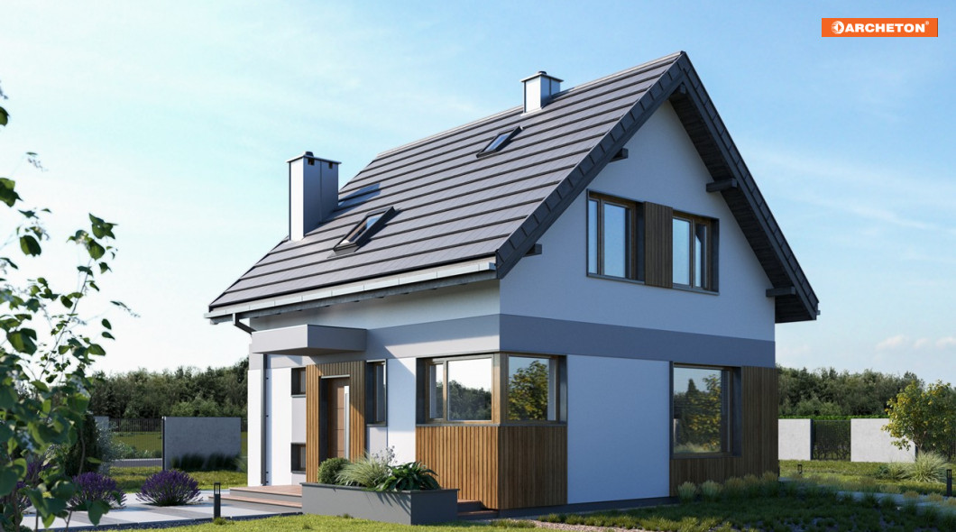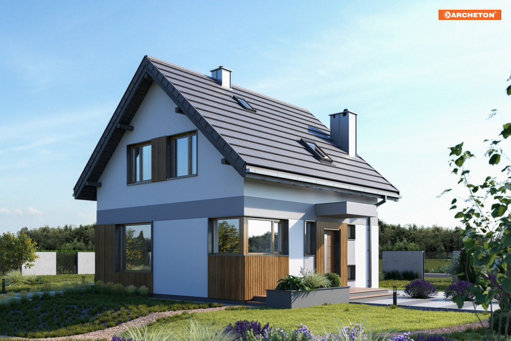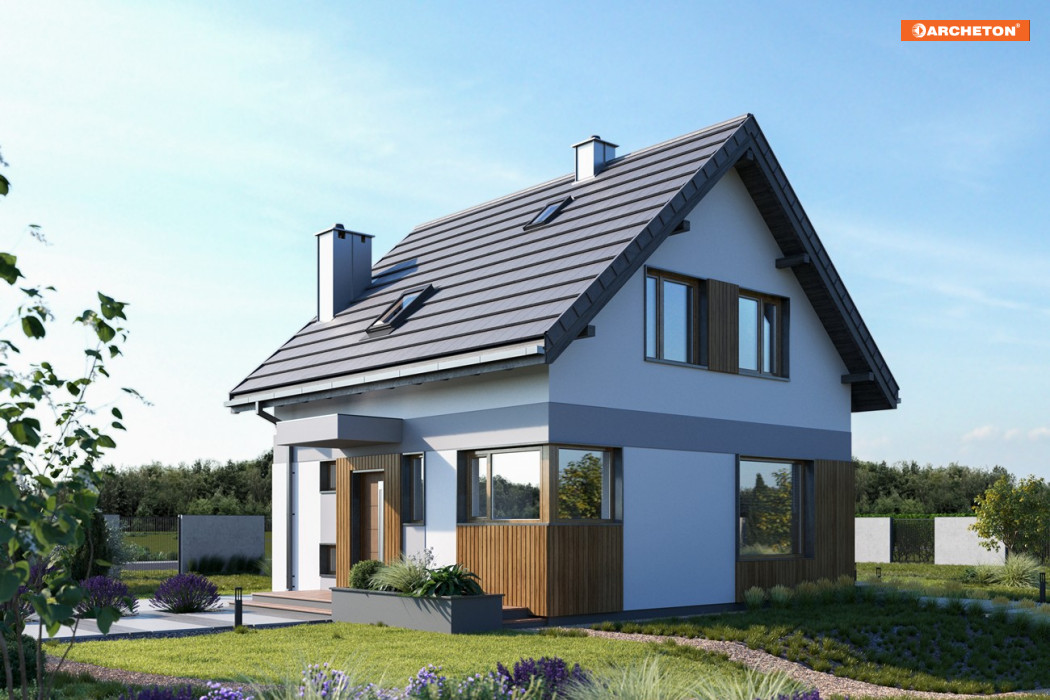 Smyk Solo to mały dom dla 4-osobowej rodziny, który – choć wydawać się może na wskroś klasyczny (dwuspadowy dach, rzut zbliżony do kwadratu, kalenica równoległa do drogi dojazdowej) – ma też wiele cech nowoczesnego budownictwa. Niewielki daszek nad wejściem frontowym czy rezygnacja z osłon tarasu sprawiają, że prostej bryły nie zakłóca żaden architektoniczny naddatek. Jednocześnie budynek ma intrygującą elewację, w której białe tynki połączono ze wstawkami w odcieniu szarym (zbliżonym do pokrycia dachowego) oraz z akcentami w kolorach ciepłego drewna.