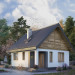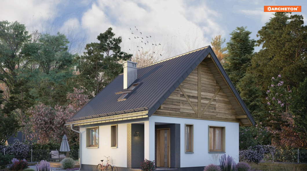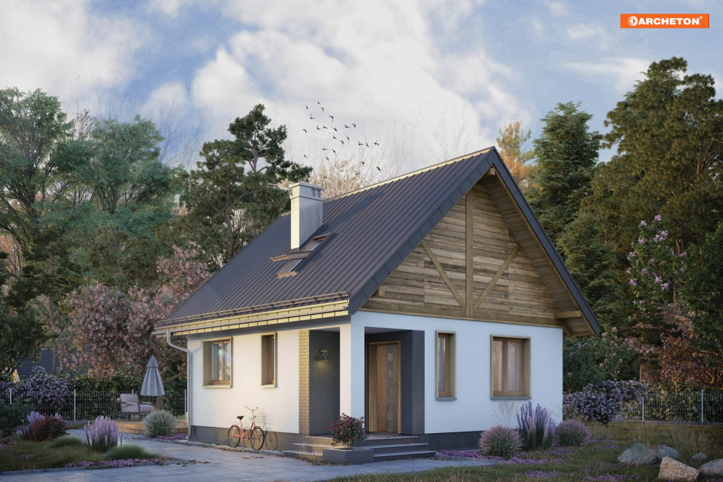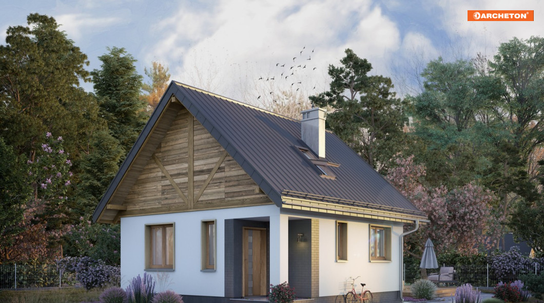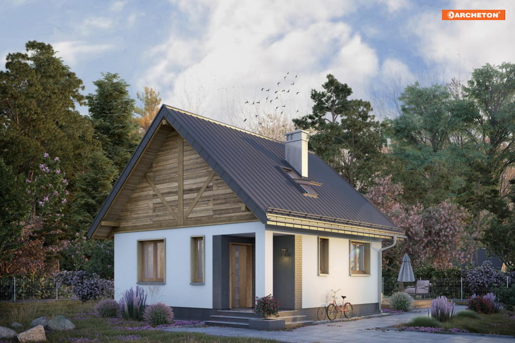 Najmniejsze domy dla 1-2 osób w kolekcji Archetonu mają ok 40 m² p.u. i rzut zbliżony do kwadratu. Jednym z najskromniejszych jest projekt domu Ziarko reprezentujący propozycje z dwuspadowym, dość stromym dachem. Jest minimalnie większy od Malucha ale wystarczyły już 2 dodatkowe m2 aby wydzielić drugie pomieszczenia mieszkalne. Oprócz pokoju dziennego z aneksem kuchni powstała spora sypialnia. Łazienka jest mniejsza niż w Maluchu ale zaproponowano wygodniejszą sień z szafą. Jeszcze większy pokój dzienny, łazienka lub osobna kotłownia wymaga dodatkowej przestrzeni - znaleźć ją można w projektach domów Gucio lub Na Kwadracie z czterospadowym dachem. W podobnych wielkością i tradycyjnych w formie rozwiązaniach, o efekcie plastycznym decyduje zaakcentowanie jednego, wybranego detalu. W projekcie domu Ziarko zaproponowano, aby była nim narożna wnęka wejściowa ze słupem, zaakcentowana innym wykończeniem ścian zewnętrznych i zapraszającym układem stopni z dekoracyjną donicą.