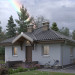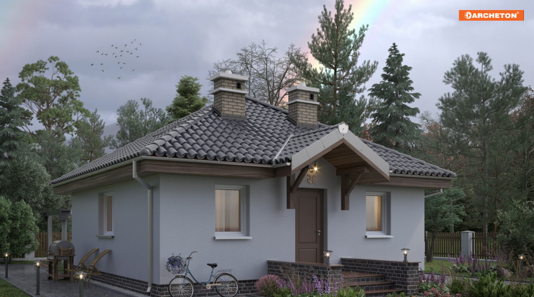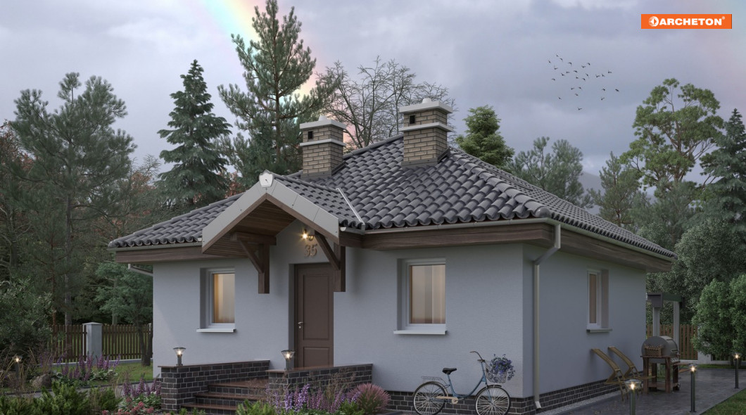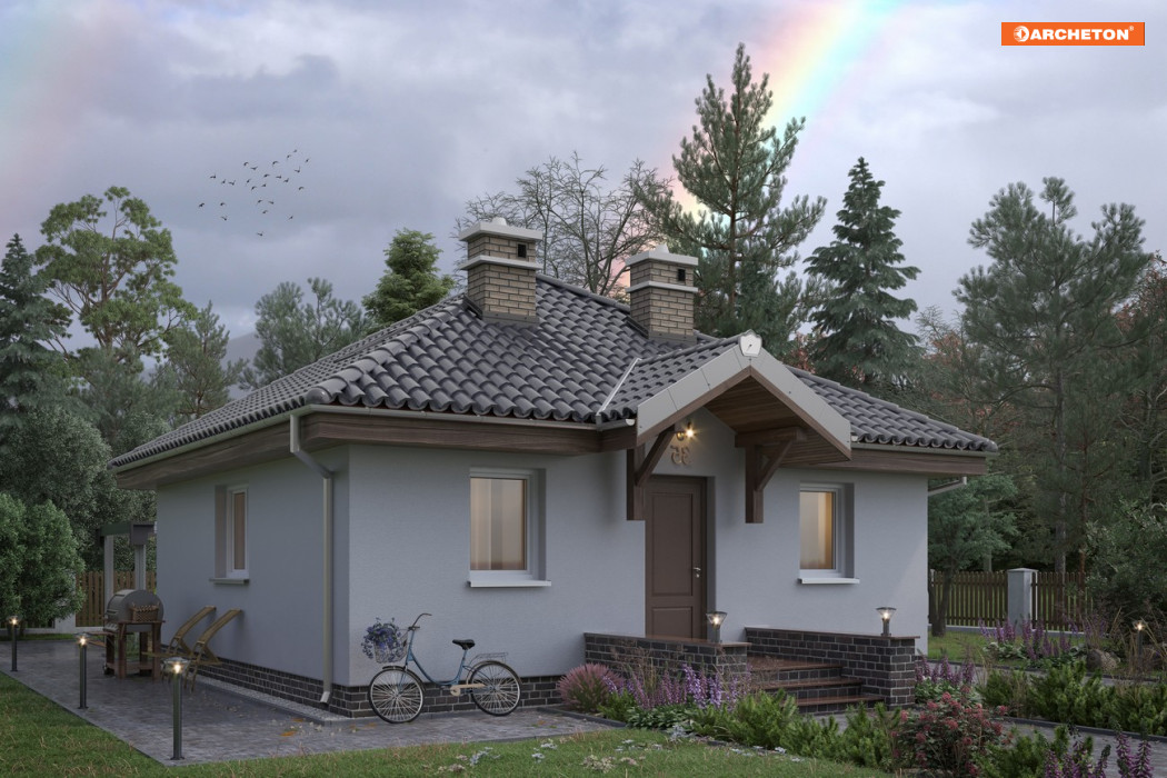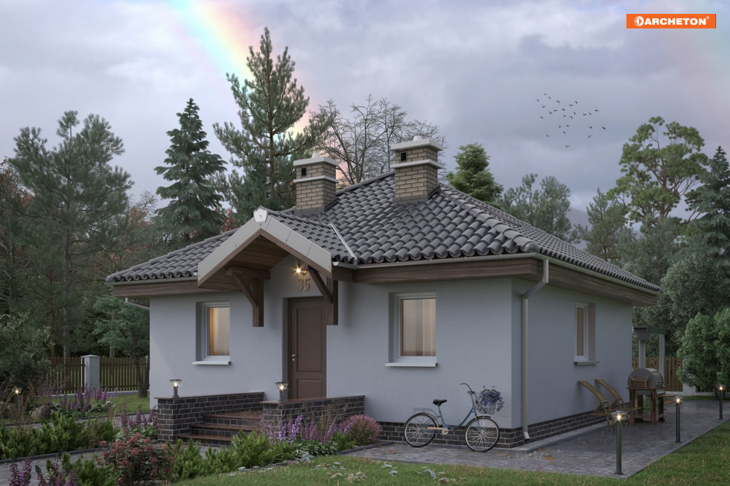 Wejście przez sień do holu otwartego na pokój dzienny z kuchnią. Z holu dostępny pokój sypialny i łazienka, sień bezpośrednio sąsiaduje z wygodnym schowkiem. Powierzchnia użytkowa 45-50 m2 pozwala już zaprojektować całkiem wygodną strefę dzienną i co najmniej jedną, dwuosobową sypialnię. Na kwadratowym planie rozwiązują to w różny sposób projekty parterowych domów Na kwadracie, Gucio i Miniatura. Projekt domu Na Kwadracie jest najmniejszy z nich. Wyróżnia go czterospadowy dach i osobne pomieszczenie kotłowni w miejscu przy wejściu, gdzie nieco większa Miniatura oferuje drugą, mniejszą sypialnię. Inaczej niż w Guciu. otwarty układ kuchnia-salon zaplanowany został między frontem i ogrodem, bez dodatkowego wyjścia z salonu. Działka wymaga foremnego kształtu bo mieszkanie doświetlono ze wszystkich stron świata. Jedynym akcentem w prostej bryle jest daszek nad tarasikiem wejściowym wsparty na eksponowanych wspornikach nad drzwiami.