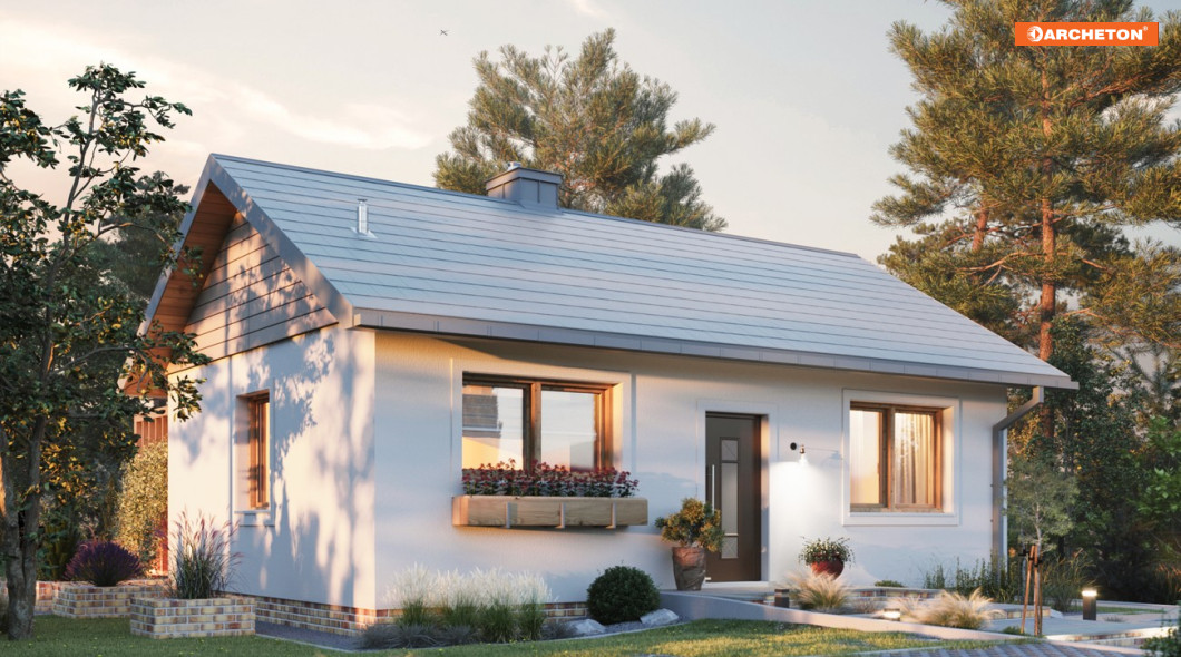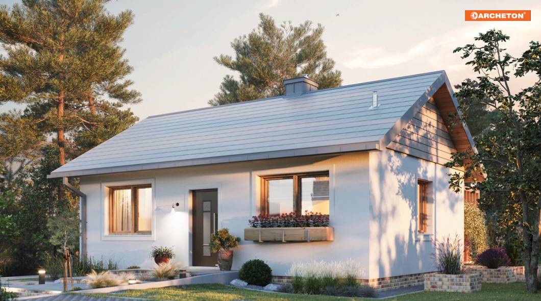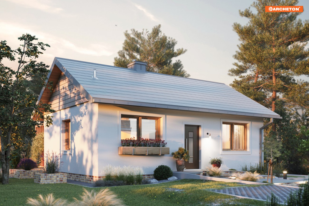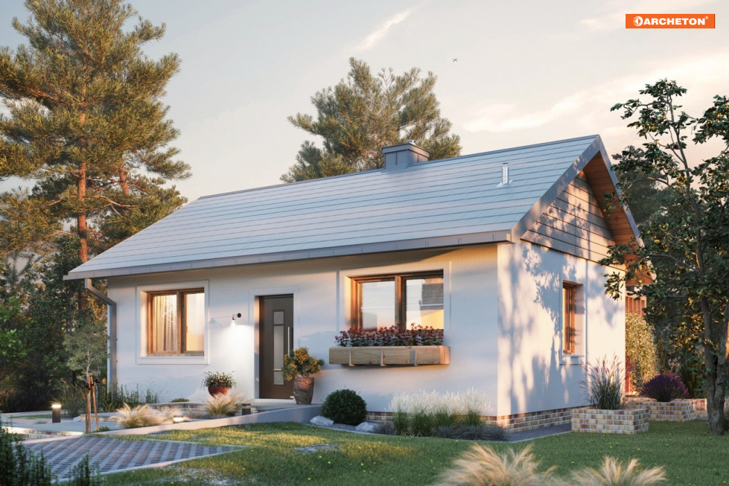 Mały dom parterowy z dachem dwuspadowym Martin ma relatywnie niewielki metraż – 53 m², który świetnie sprawdzi się w przypadku rodzin 2+1. Do ich dyspozycji są dwa pokoje oraz salon z kuchnią. W miesiącach letnich przestrzeń ta dodatkowo powiększa się o taras, na który wychodzi się bezpośrednio z salonu.