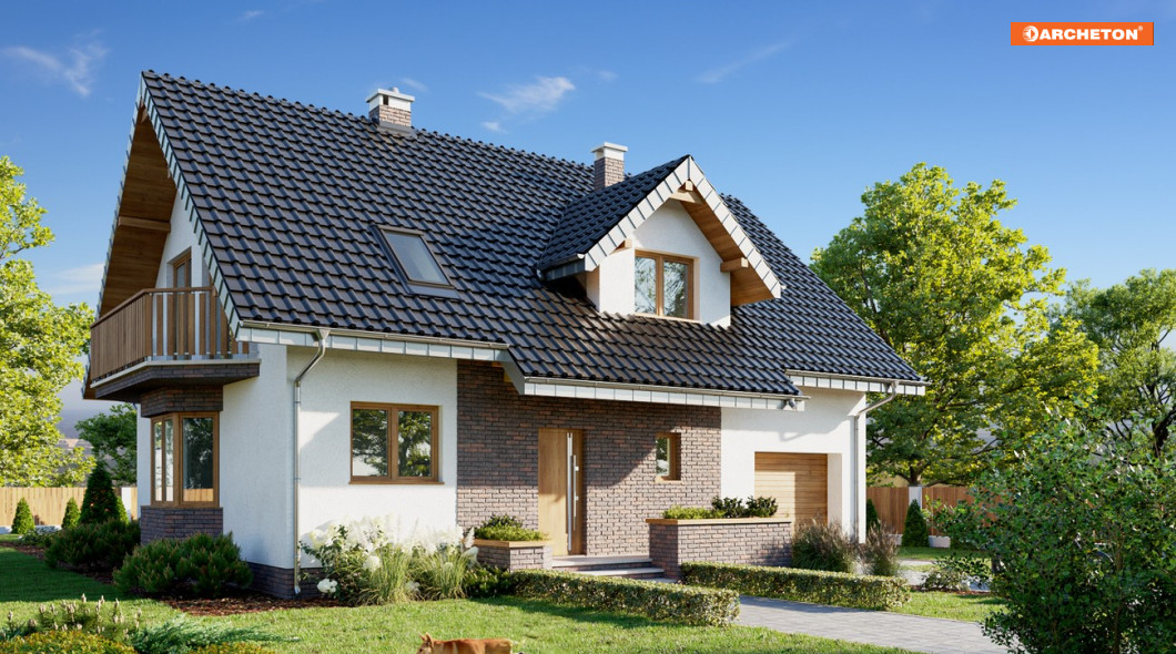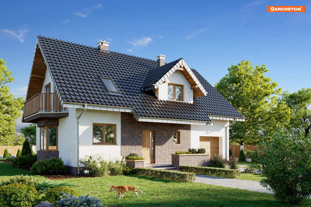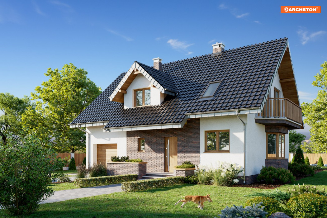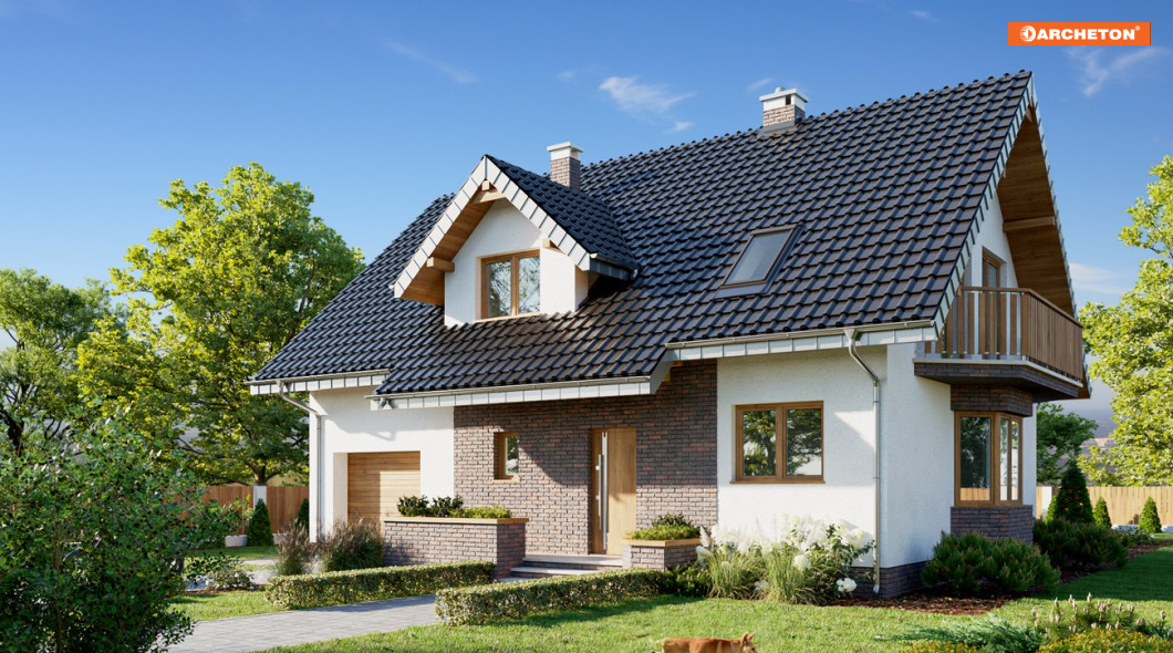 Parterowy dom z użytkowym poddaszem i z częścią gospodarczą przy ściany bocznej to ekonomiczne rozwiązanie dla indywidualnego budownictwa mieszkaniowego. Taki jest projekt domu Zoja Lux Solis oraz zbliżone do niego propozycje z rodzin: Zoi, Zofii i Heleny z balkonem na ryzalicie w ścianie szczytowej. Wykorzystują miejsce pod dwuspadowym dachem (z kalenica równoległą do drogi dojazdowej) nad całym budynkiem, proponując alternatywne rozwiązania i różne wielkości. Obrys ścian zewnętrznych jest zwarty co umożliwia oszczędne ogrzewanie. Na parterze, oprócz otwartego salonu, kuchni i dużej łazienki, znajduje się dodatkowy pokój – w sumie: wygodne mieszkanie dla dwojga, oraz przejście pod schodami do garażu. Projekt domu Zoja Lux Solis ma średnią wielkość i 4 pokoje na poddaszu (do wykończenia np. w drugim etapie). Wyróżnia go usytuowanie kuchni – od ogrodu. Tak, jak we wszystkich wariantach z pojedynczym garażem, część gospodarcza i mieszkalna mają wspólny dach. Niesymetryczny układ lukarny z obniżonym daszkiem od frontu i położenie kominka odróżnia Zoje od Zofii i Heleny. Zoje i Zofie mają na parterze łazienkę przy sieni z oknem i bardziej zamkniętą kuchnię.