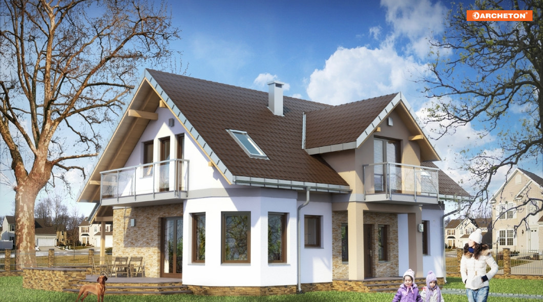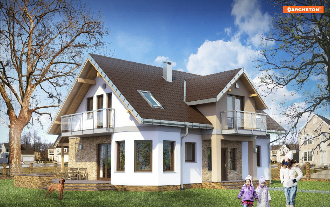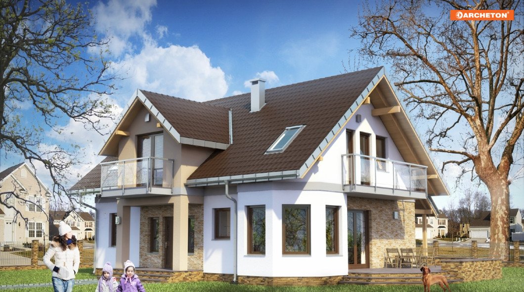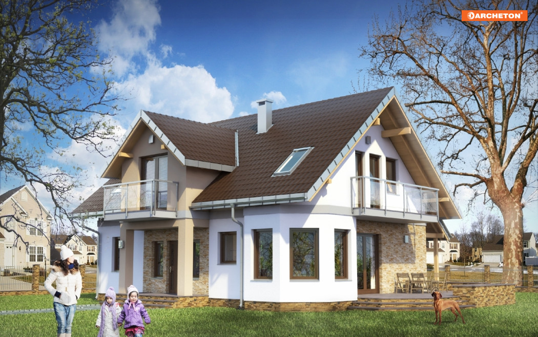 Ośmioboczny, fantazyjny, narożny ryzalit z jadalnią przy kuchni był wielokrotnie wykorzystany w ofercie Archetonu (np. w Rodzinie Mai) jako urozmaicenie bryły domu parterowego z użytkowym poddaszem. Projekt domu Maryla jest jednym z takich rozwiązań ale jedynym w grupie propozycji o powierzchni użytkowej ok. 140m2 bez garażu. Są to domy średniej wielkości i każdy, także Maryla, oprócz przestronnej części wspólnej, ma na parterze kotłownię i dodatkowy pokój. Ten w Maryli jest ustronnie położony za zabiegowymi schodami, w pobliżu łazienki, tworząc dogodne warunki mieszkania dla gościa lub seniora rodu. Otwarty pokój dzienny ciekawie zespolono z holem przez aneks kominkowy. Każda z czterech sypialni poddasza ma indywidualny charakter i wyjście na balkon, a główna także miejsce na garderobę. Frontowy balkon, wsparty jest na słupach wejściowego podcienia i, razem z wysuniętą z dwuspadowego dachu lukarną, tworzy kolejny bardzo dekoracyjny element projektu domu Maryla. Przypomina detal podobnego wielkością projektu domu Zofia Portyk z wbudowanym garażem.
