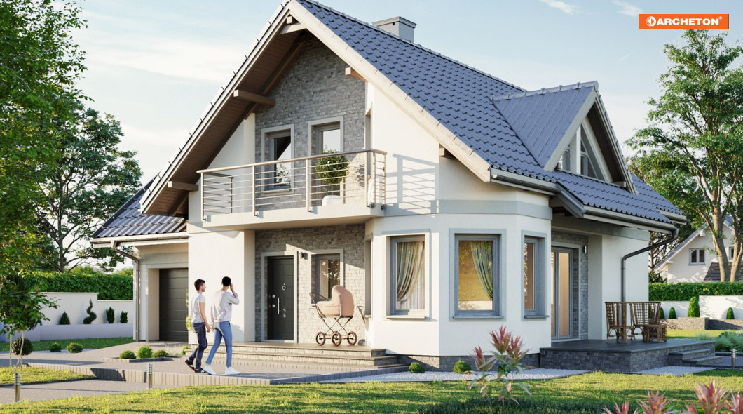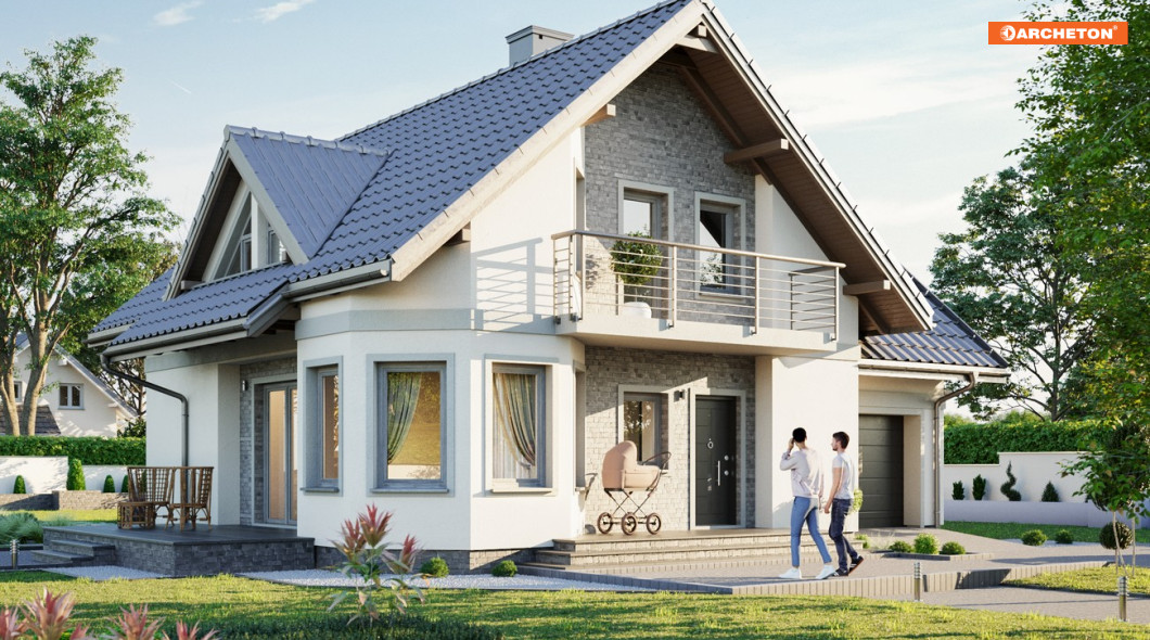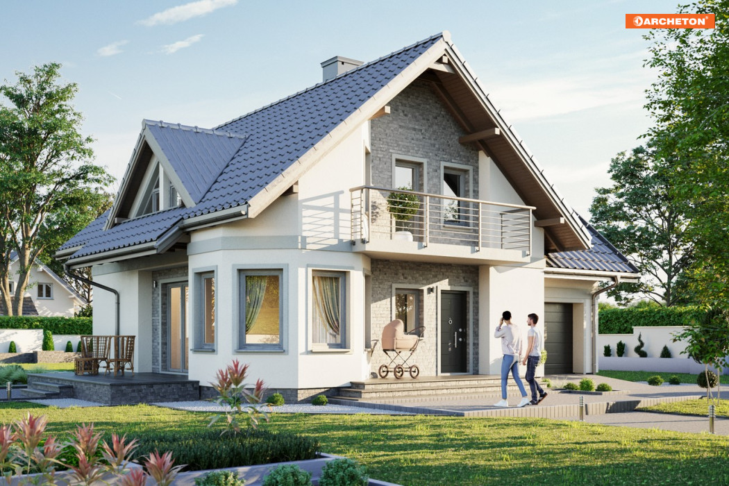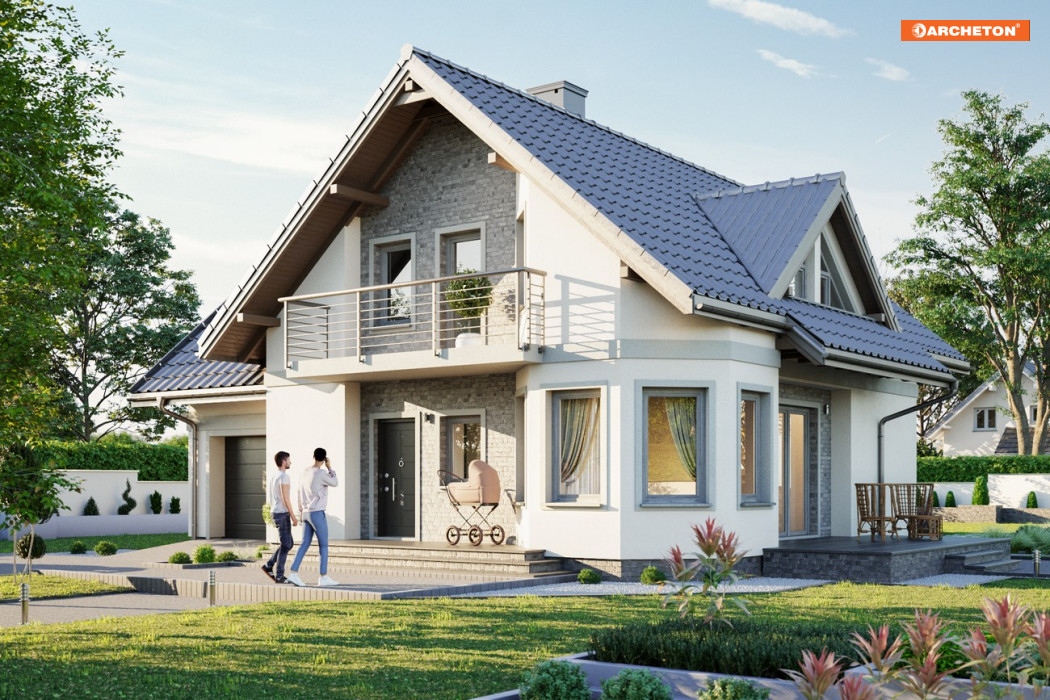 Od projektu domu Majka Tytan, w Rodzinie Majki większa jest tylko wersja Tytan G2, w której dobudowany garaż jest większy - dwustanowiskowy. Wszystkie warianty, wśród małych i średnich domów wyróżnia fantazyjna sylwetka z narożnym ośmio graniastym ryzalitem, podobnie jak w w Rodzinie Mai. Przełamanie geometrii kąta prostego kształtuje zadaszoną wnękę wejścia i taras dostępny z salonu. Otwarty pokój dzienny urozmaica ośmiokątna jadalnia przy kuchni i widok na trójbiegowe schody w holu. Strefa nocna na poddaszu pozwala na indywidualną aranżację prywatnej przestrzeni dla domowników, bo każdy z czterech pokoi ma inny kształt i sposób doświetlenia. W projekcie domu Majka Tytan, jako w jednym z kilku w rodzinie, obrócono dwuspadowy dach nad częścią mieszkalną, tworząc z zadaszeniem garażu układ prostopadły i bryłę na rzucie litery T. Front akcentuje ściana szczytowa z balkonem, a trójkątna lukarna, charakterystyczna dla całej rodziny, znajduje się nad tarasem przy ścianie bocznej. Wielkość tego wariantu sprawia, że przy salonie mógł powstać dodatkowy pokój, a kotłownia, inaczej niż w mniejszych wersjach, znajduje się w części gospodarczej bryły, za garażem.