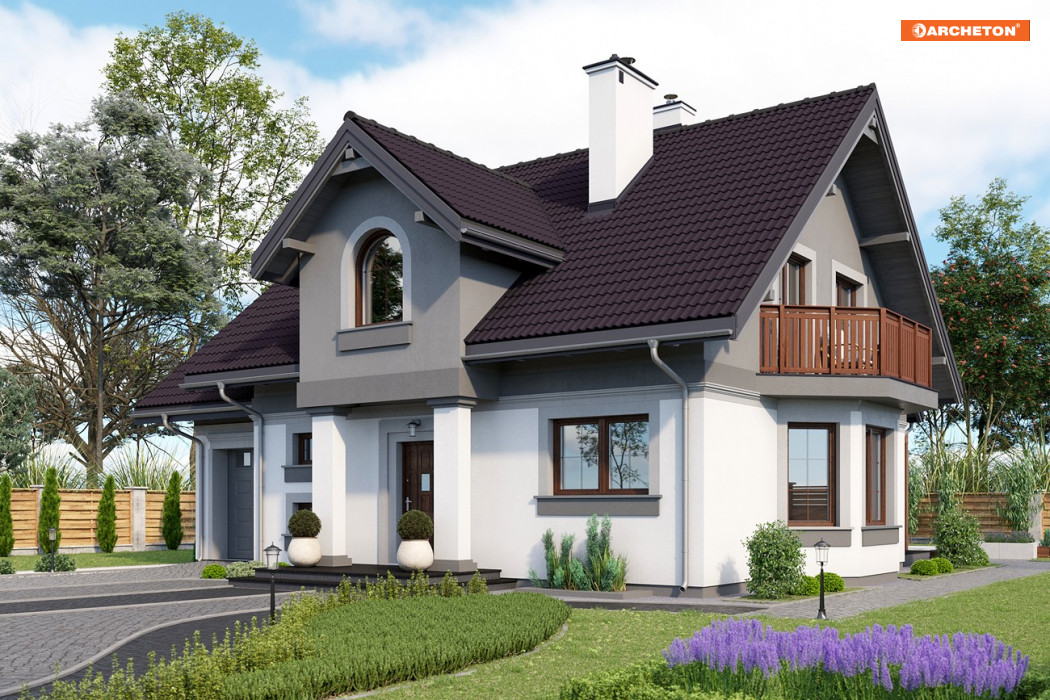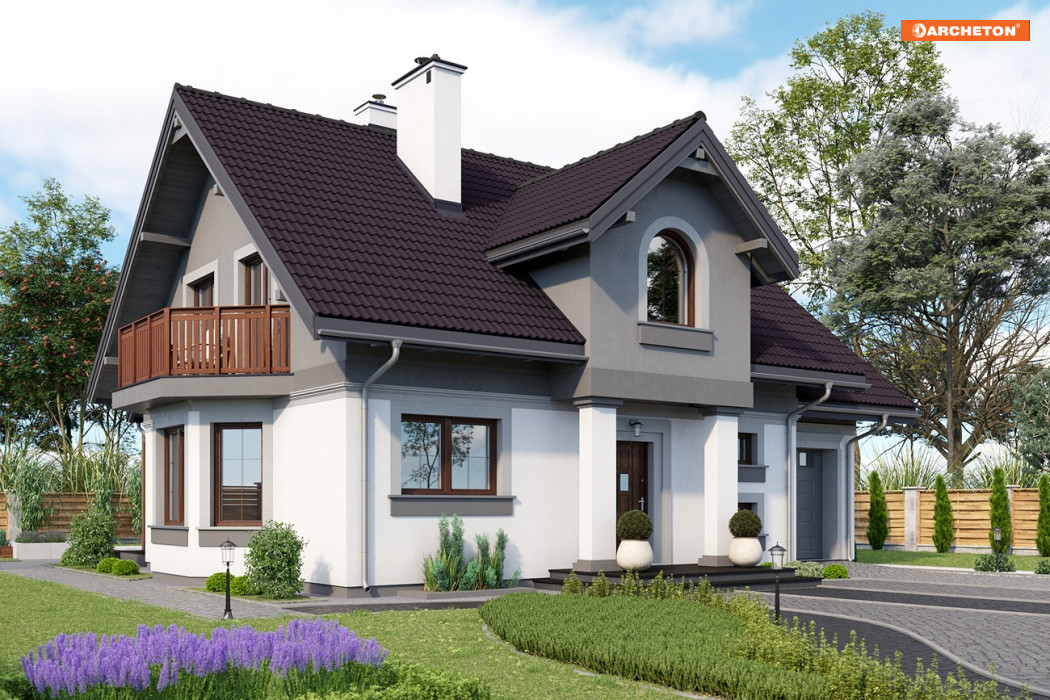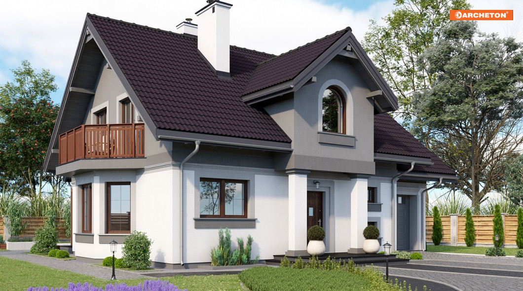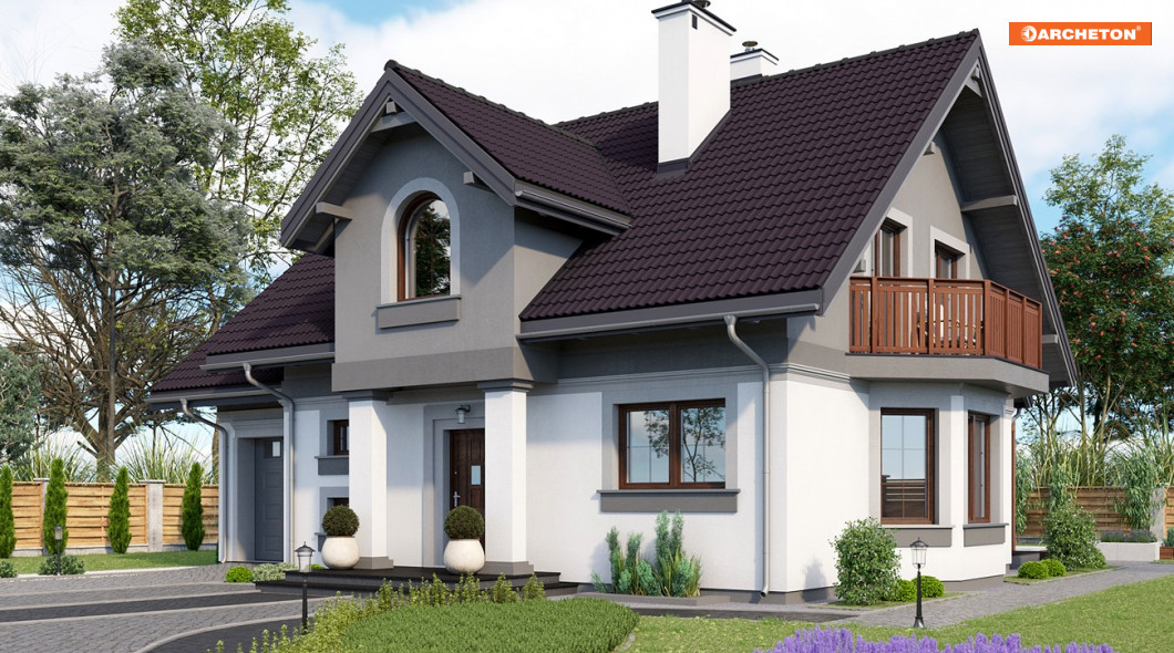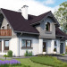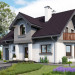 W rodzinie Chabra znalazły się projekty domów z użytkowym poddaszem z zakresu powierzchni 100-150m2, z dobudowanym garażem, z dodatkowym pokojem na parterze, a przy tym z podpiwniczeniem o różnym zakresie. Projekt domu Chaber Polo to jedna z większych, bardziej dekoracyjnych z pokrewnych wersji. We wszystkich, środkiem zwartego rzutu części mieszkalnej biegnie ściana nośna tworząc na parterze strefy: wejściową ze schodami i z otwartą kuchnią oraz ogrodową z dwoma pokojami. Kuchnię łączy z salonem jadalnia w ryzalicie ściany bocznej zwieńczonym balkonem. Układ konstrukcyjny dzieli na dwie części także piwnice, ułatwiając indywidualne ustalenie jej zasięgu. Podobnie na poddaszu: ścianka pod kalenicą dwuspadowego dachu zamyka na połowach planu dwie większe sypialnie oraz komunikację z dużą łazienką i małym pokojem. Wymagając głębszego traktu, garaż nie znalazł się w podziemiu lecz w dobudowanej części przyziemia, przy ścianie bocznej bryły głównej. W projekcie domu Chaber Polo przekryty jest własnym dwuspadowym dachem z czwartą sypialnią na poddaszu. Wariant ten wyróżnia frontowa lukarna na słupach z półkolistym oknem pokoju kąpielowego poddasza