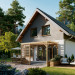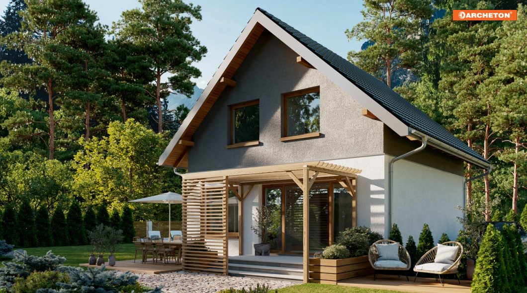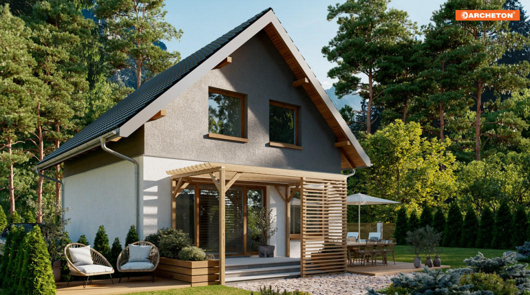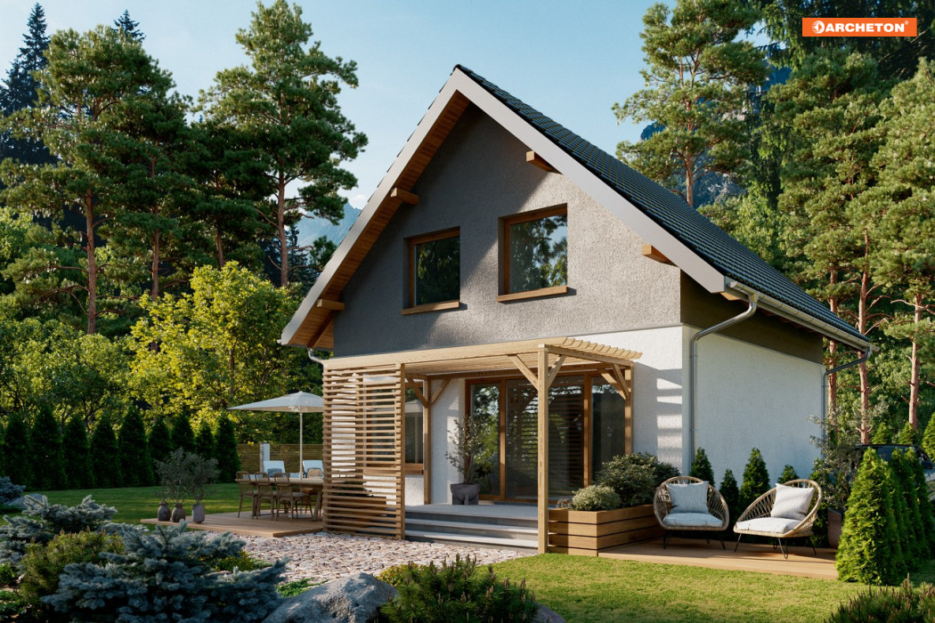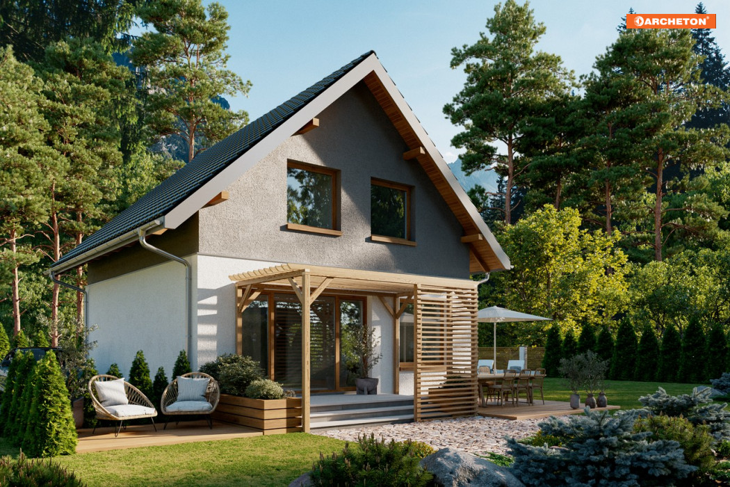 Projekt małego, energooszczędnego domu parterowego z użytkowym poddaszem ma ograniczone możliwości rozwiązań funkcjonalnych. Powierzchnia nieco ponad 90m2 i prostokątny, zwarty rzut decydują o tym, że na parterze, oprócz strefy dziennej, wc i przestrzeni komunikacji, pozostaje już niewiele miejsca. Projekt domu Gutek, należący do tej kategorii rozwiązań, proponuje, aby wykorzystać je na dodatkowy pokój przy wejściu oraz na wygodną łazienkę z kotłem gazowym. Jest to jedna z trzech podobnych koncepcji prostego, taniego budynku z dwuspadowym dachem zwróconego do wjazdu na działkę ścianą szczytową z balkonem. Pozostałe to: projekt domu Dorian z dużą kotłownią i projekt domu Gawra – z wyjątkowo dużym pokojem dziennym, z dużą kuchnią i wygodną łazienką. Projekt domu Gutek wyróżnia się wśród nich oryginalnym wnętrzem salonu ze schodami na poddasze. Brak otworów w ścianach bocznych i połaciach dachu pozwala zrealizować go na wyjątkowo wąskiej działce – tylko 14,1m! Okna w ścianach szczytowych, zwłaszcza od ogrodu są duże i kompensują doświetlenie strefy dziennej.