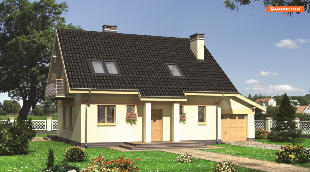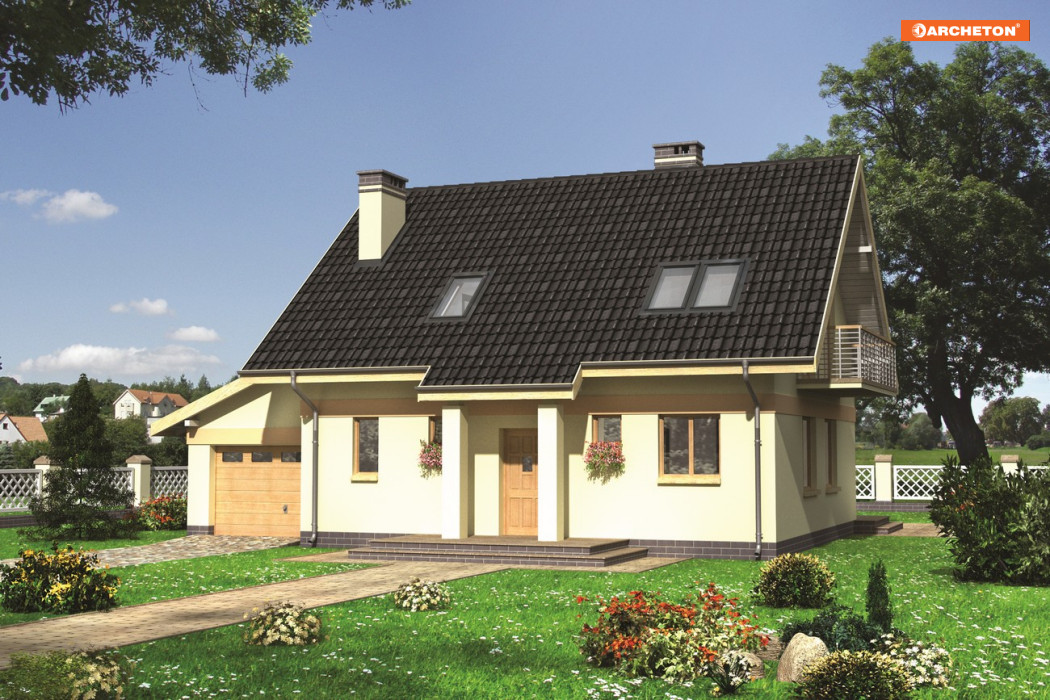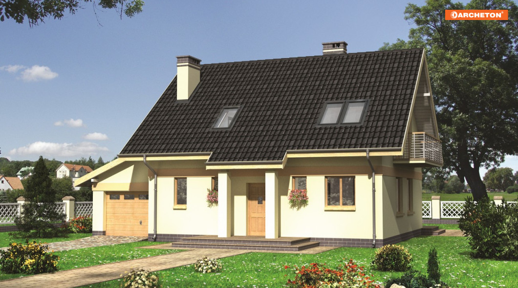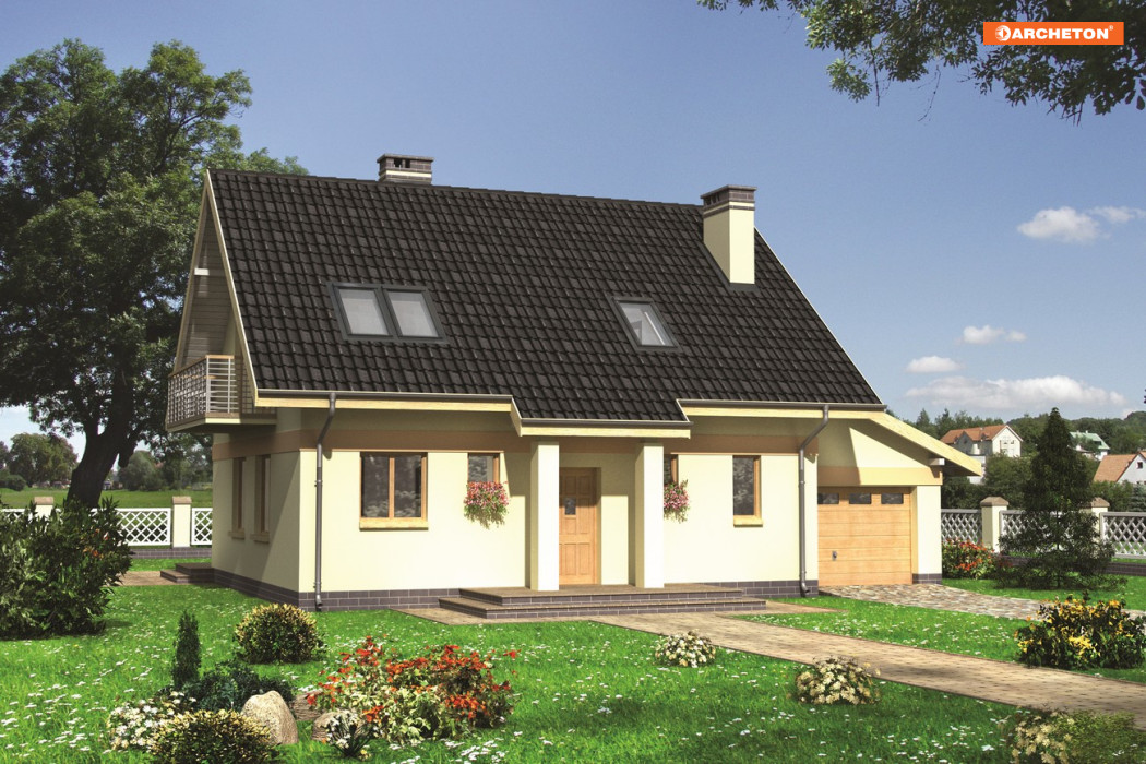 Funkcjonalny dom dla 3-6 osobowej rodziny. Na parterze znajduje się duża kuchnia ze spiżarnią, salon, pokój gościnny, łazienka, kotłownia oraz garaż. Na poddaszu są 3 wygodne sypialnie i łazienka. Ryzalit oparty na rzucie ośmiokąta jest detalem często używanym do urozmaicania formy prostych, tanich w realizacji projektów domów. W rodzinie Figi zaproponowano go jako przeszklony element salonu od strony ogrodu. Projekt domu Figa jest średnim wariantem wśród kilku pokrewnych, niewielkich koncepcji parterowych z użytkowym poddaszem i z dodatkowym pokojem na parterze. Wszystkie wersje Figi powstały na planie prostokąta o proporcjach kwadratu. Podzielono go konstrukcyjnie na dwie połowy wzdłuż kalenicy dwuspadowego dachu bez lukarn. Część frontowa, z dużą kuchnią, ma charakter gospodarczy. Hol rozprowadza do sieni, łazienki oraz do kotłowni wykorzystującej przestrzeń pod schodami na poddasze i łączącej mieszkanie z dostawionym do ściany bocznej garażem z pulpitowym dachem. Od ogrodu znajduje się salon i pokój, które łatwo połączyć w jedną, większą przestrzeń. Projekt domu Figa ma na poddaszu trzy wygodne sypialnie dla 4 osób z piękną, dużą łazienką. Szerokie wyjścia na balkon w jednej ze ścian szczytowych, oraz opuszczone okapy dwuspadowego dachu nad ryzalitem i wejściem do domu, stanowią jedyne wzbogacenie zwartej bryły.