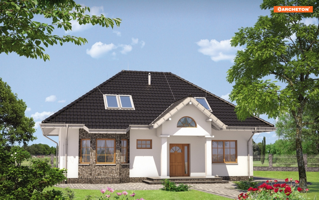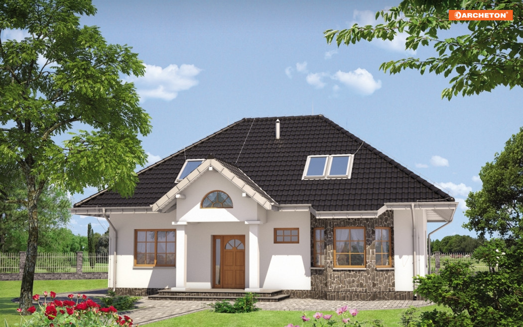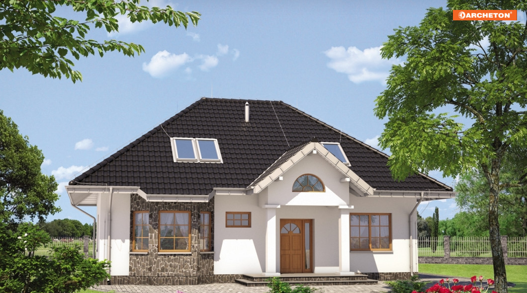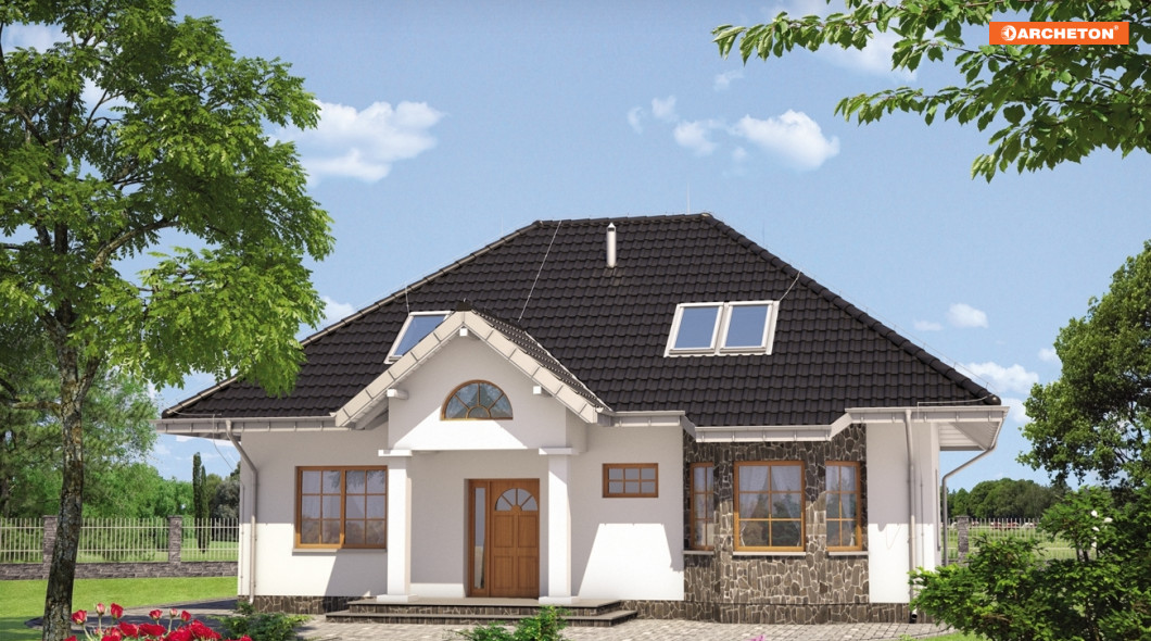 Na parterze znajduje się pokój dzienny, kuchnia z jadalnią, w.c., sypialnia z łazienką oraz kotłownia dostępna od środka i z zewnątrz. Na poddaszu zaprojektowano 4 wygodne sypialnie i łazienkę. Dom o charakterze dworkowym. Bryła domu oparta na rzucie prostokąta, nakryta dachem wielospadowym o kącie nachylenia połaci 38°. Elewację frontową urozmaica ryzalit doświetlający jadalnię.