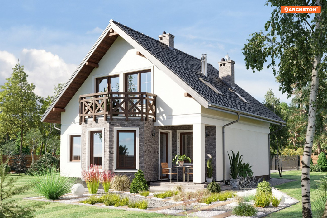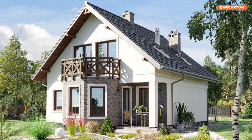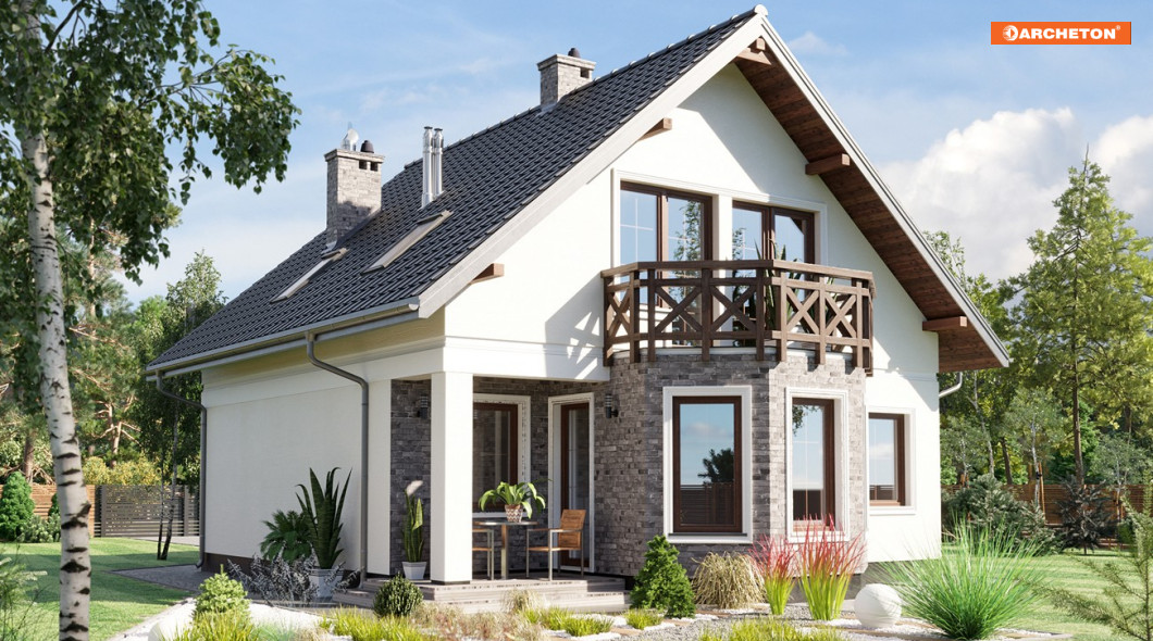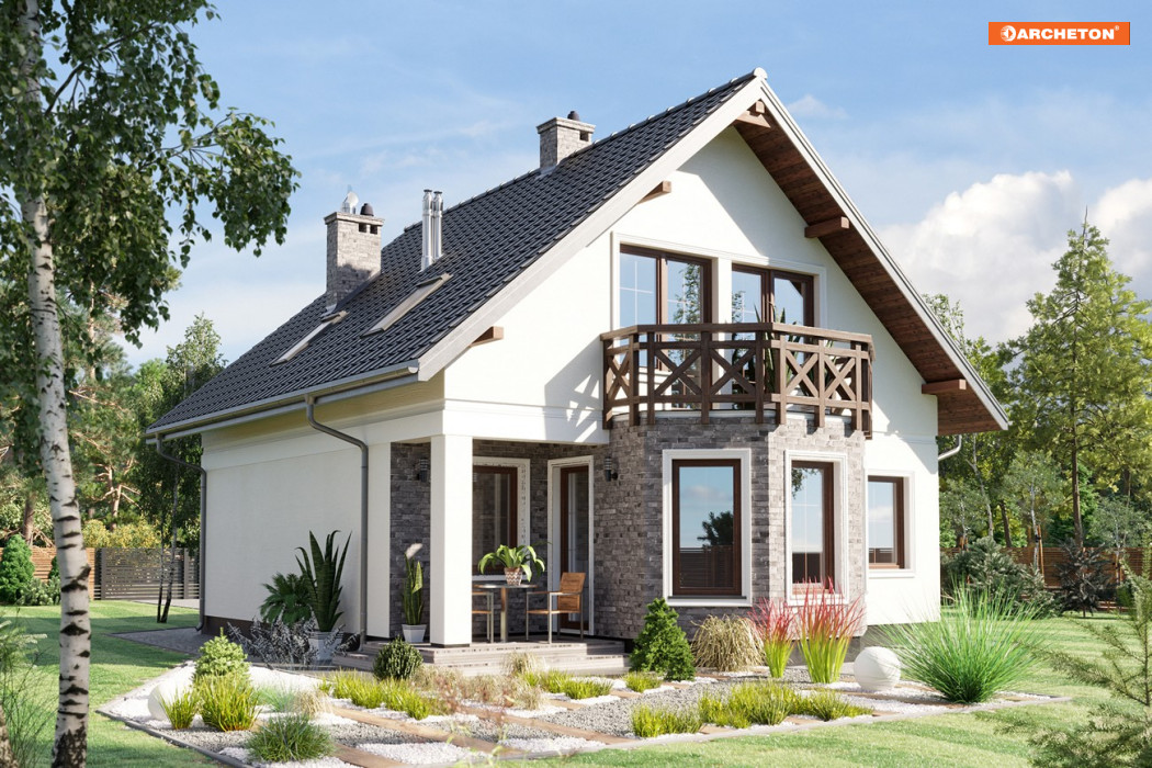 Na niewielką działkę, zwłaszcza taką, która wymaga zabudowy szczytem w kierunku drogi dojazdowej, nadaje się doskonale projekt małego domu Maranta - z użytkowym poddaszem i bez garażu. W grupie podobnych propozycji o powierzchni ok.100-110m2 Maranta ma najmniej wydłużony plan, a przy tym bardzo efektowny detal w elewacji ogrodowej. Jest nim wyraziście zarysowany, duży ryzalit zwieńczony tarasem. Mieści się w nim jadalnia zamykająca oś symetrii parteru, wyznaczona frontowym wejściem zaakcentowanym wielospadowym daszkiem i dalej centralnie ulokowaną bryłą kominka. Kominek oddziela hol od pokoju dziennego i jednocześnie kuchnię od strefy salonu. W części wejściowej znalazła się spora kotłownia i dodatkowy pokój, a wc pod zabiegowymi schodami. Wyżej, pod prostym dwuspadowym dachem bez lukarn można zaaranżować trzy ustawne sypialnie dla 4 osób i wygodną łazienkę. Wszystkie pomieszczenia poddasza mają tradycyjne okna w ścianach szczytowych. Niewielką kuchnię w projekcie domu Maranta można w adaptacji rozszerzyć, zabudowując całkowicie lub częściowo wnękę tarasu ogrodowego przy ryzalicie.