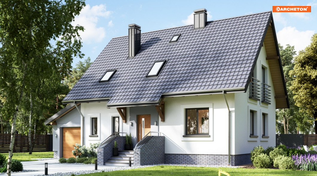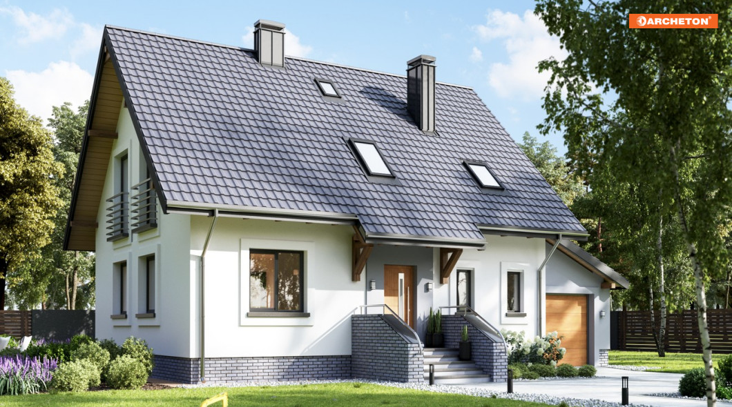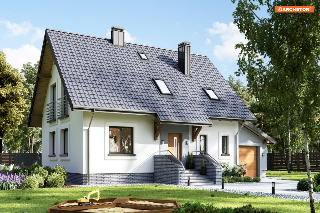 W projekcie domu Aga nieprzechodnia kotłownia dostępna jest z mieszkania przez przedsionek łączący go z garażem. Jest to bardzo wygodne rozwiązanie, a przy tym rzadkie w koncepcjach niewielkich domów parterowych z użytkowym poddaszem i garażem. Pozwala zaaranżować w kotłowni na gaz pralnię, a w przypadku paliwa stałego - uzupełniać zapasy opału z pominięciem drogi przez mieszkanie. Przy dość zwartym, mało wydłużonym rzucie projekt domu Aga wymaga poza tym niewielkiej działki, a dodatkowy pokój na parterze umożliwia etapowanie inwestycji. Centralnie położony kominek rozdziela parter na pokój dzienny, hol, salon i dużą kuchnię. Pod dwuspadowym dachem (z kalenicą równoległą do drogi dojazdowej) jest miejsce na cztery pokoje. Najmniejszy z nich, przy łazience, adaptować można łatwo po części na pralnię, po części na powiększenie sąsiedniej sypialni. Garaż z pulpitowym przekryciem dostawiono do ściany bocznej i połączono z mieszkaniem przejściem pod zabiegową klatką schodową. Bryła Agi jest oszczędna, prosta i tradycyjna, bez balkonów i z symetrycznie usytuowanym akcentem przedłużonego częściowo okapu nad tarasikiem wejściowym.