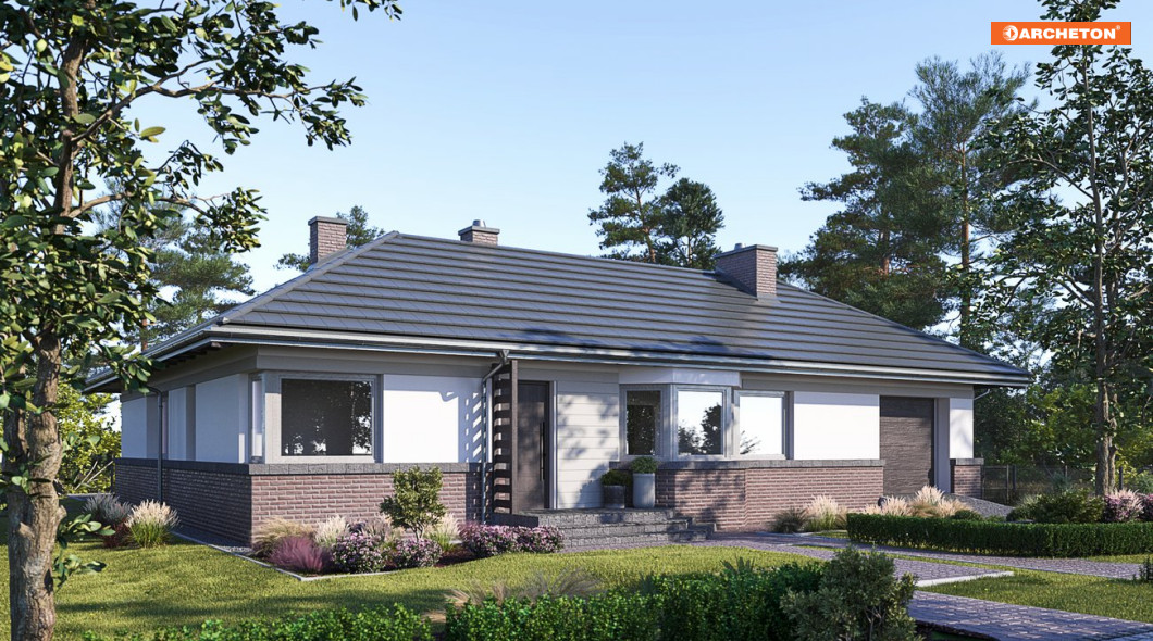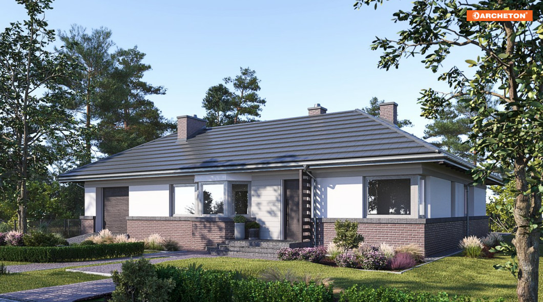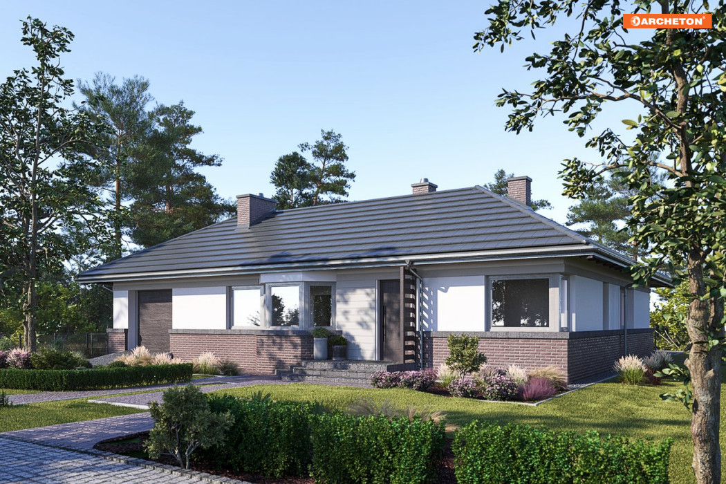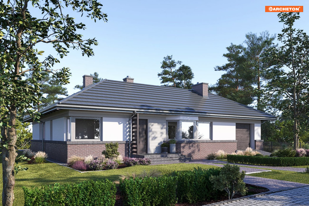 Budynek jest obiektem parterowym, niepodpiwniczonym. Na parterze zaprojektowano pokój dzienny, trzy sypialnie kuchnię z jadalnią, schowek, wc, łazienkę, hol, wiatrołap, kotłownię, garaż. Zasadniczą bryłę budynku tworzą dwa prostopadłościany o horyzontalnym układzie nakryte dachem dwuspadowym o kącie nachylenia połaci 30 stopni. Bryłę wzbogaca wydatny okap i wysoka kamienna podmurówka.