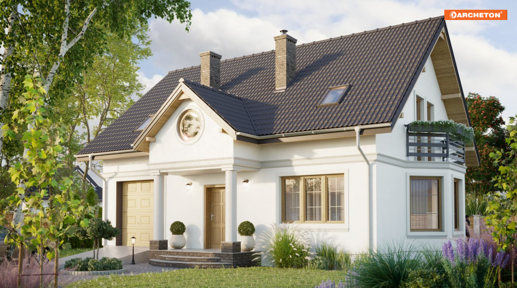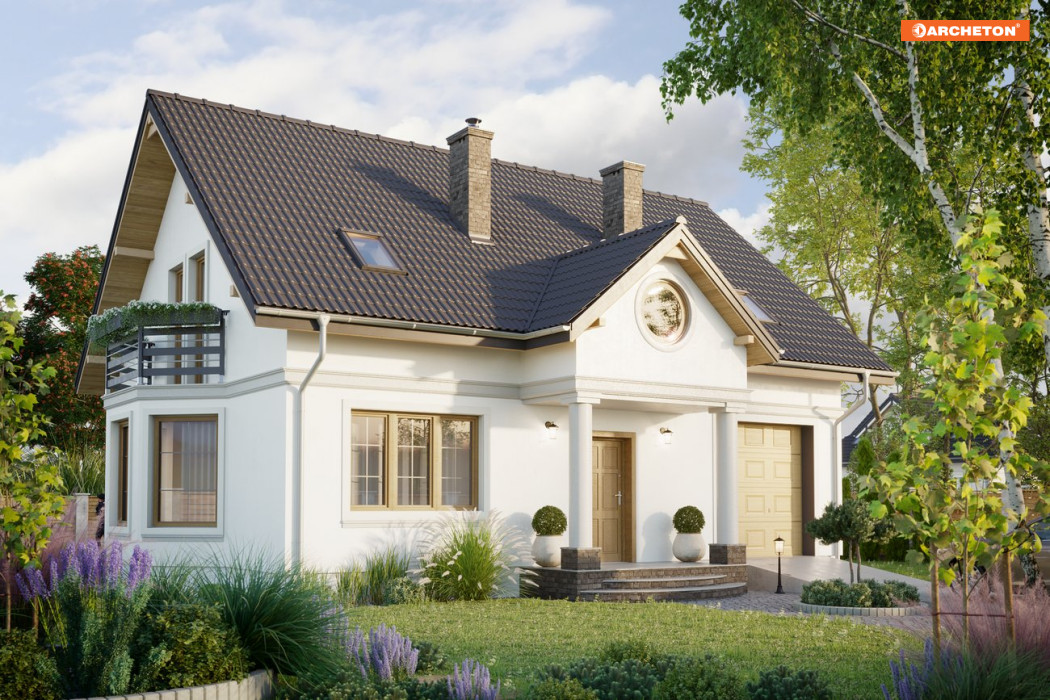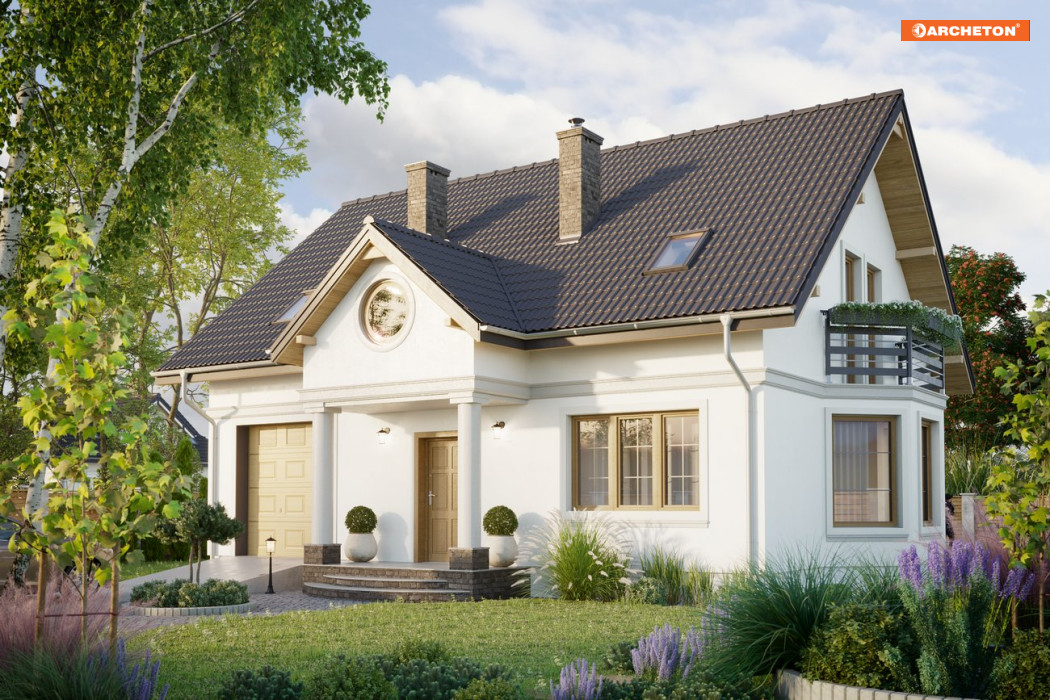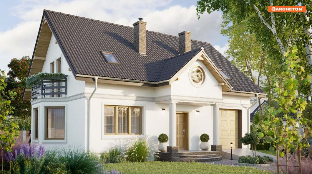 Przez wiatrołap wchodzimy do holu. Na parterze znajduje się otwarty pokój dzienny z wyjściem na taras, kuchnia, w.c., schowek pod schodami, kotłownia z palnią i garaż. Na poddaszu - przedpokój, trzy sypialnie, łazienka oraz garderoba. Drabant Lux to projekt domu jednorodzinnego, z użytkowym poddaszem, w stylu tradycyjnym. Salon w Drabancie Lux jest bardzo obszerny, a dodatkowo powiększają go otwarty hol i kuchnia. W domu, którego powierzchnia nie przekracza 120 m2, daje to niezwykle odczucie swobody przestrzeni. Aby rozciągnąć to wrażenie na całe mieszkanie, aranżacja proponuje konsekwentne zastosowanie w kolorystyce dwóch wiodących odcieni. Pełen powietrza błękit i energetyczna barwa pomarańczy dominują zarówno na parterze jak i w zamkniętych, prywatnych pomieszczeniach poddasza. Bryła budynku przykryta jest dachem dwuspadowym o kącie nachylenia połaci 40°. Urozmaicają ją portyk wejściowy, lukarna oraz balkony.