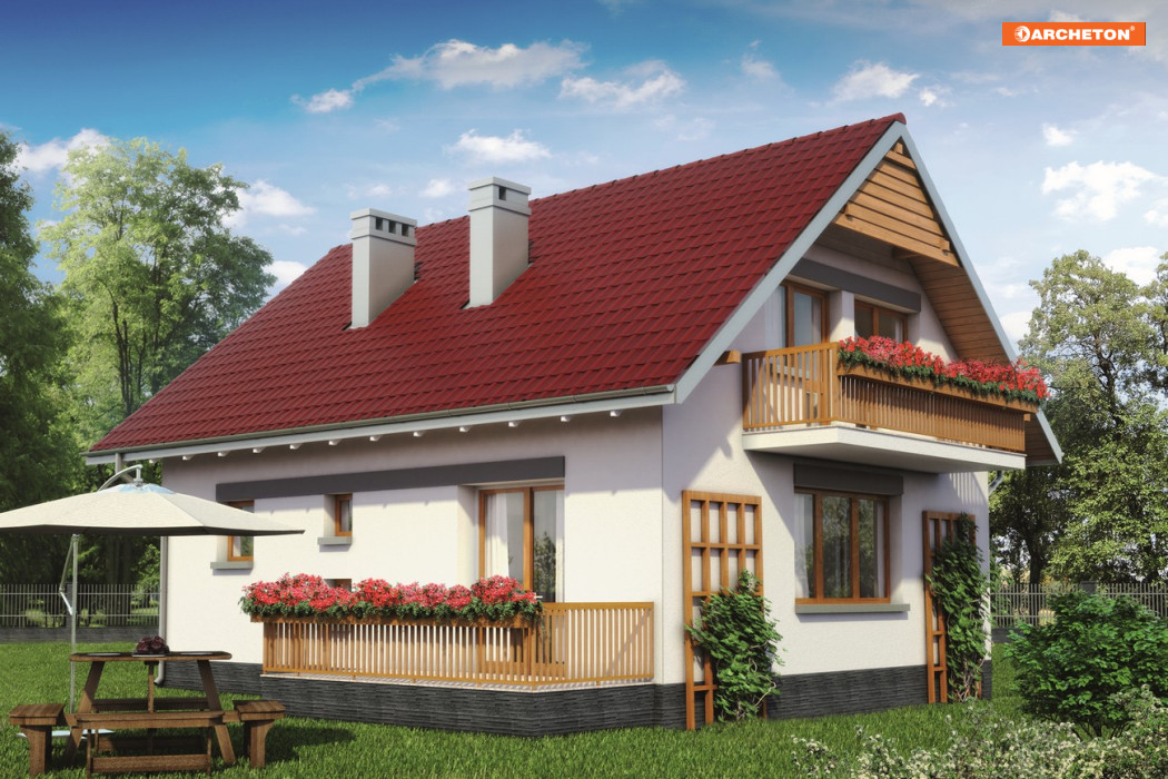Układ otwartej strefy dziennej Calineczki przewiduje oświetlenie jej oknami z trzech różnych stron świata, co daje dużą swobodę w ustawieniu domu na działce. Zarówno na parceli z dojazdem od południa, jak i od północy, salon i kuchnia będą jasne i ciepłe przez większą część dnia. Pokój dzienny jest wyjątkowo przestronny. Program funkcjonalny parteru uzupełnia stosunkowo duża kotłownia. Projekty domów parterowych z użytkowym poddaszem często tracą sporo powierzchni na komunikację. Calineczkę wyróżnia pod tym względem wyjątkowo zręcznie rozplanowana strefa nocna, w której kształtny przedpokój ma zaledwie 3,9m2. Projekt domu Calineczka łączy ekonomiczna koncepcję konstrukcyjną z urokliwą formą architektoniczną.