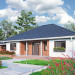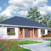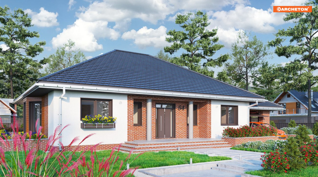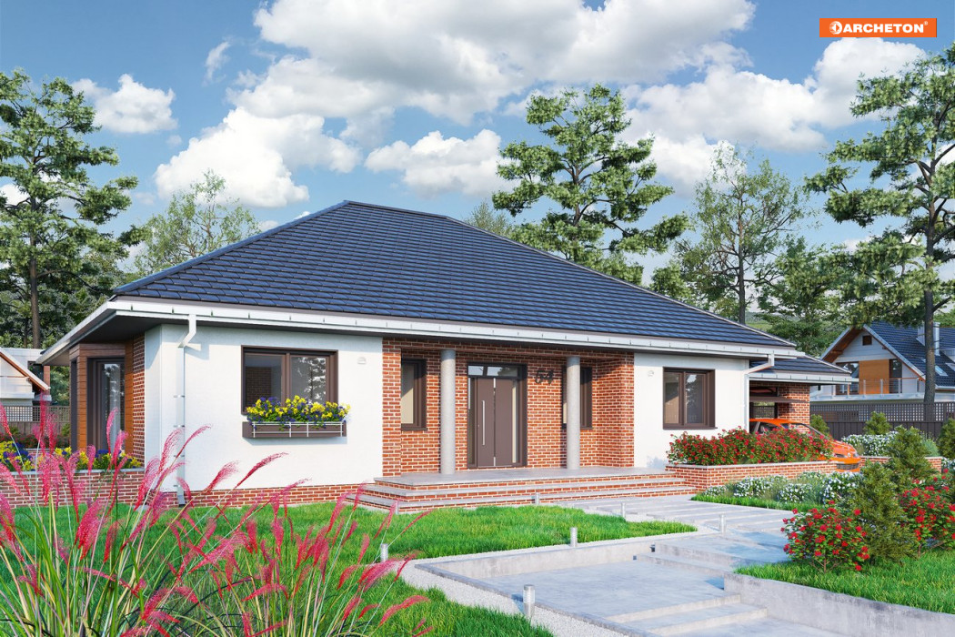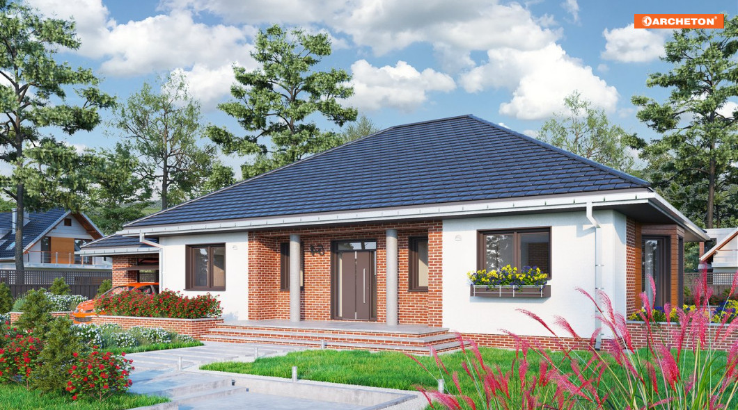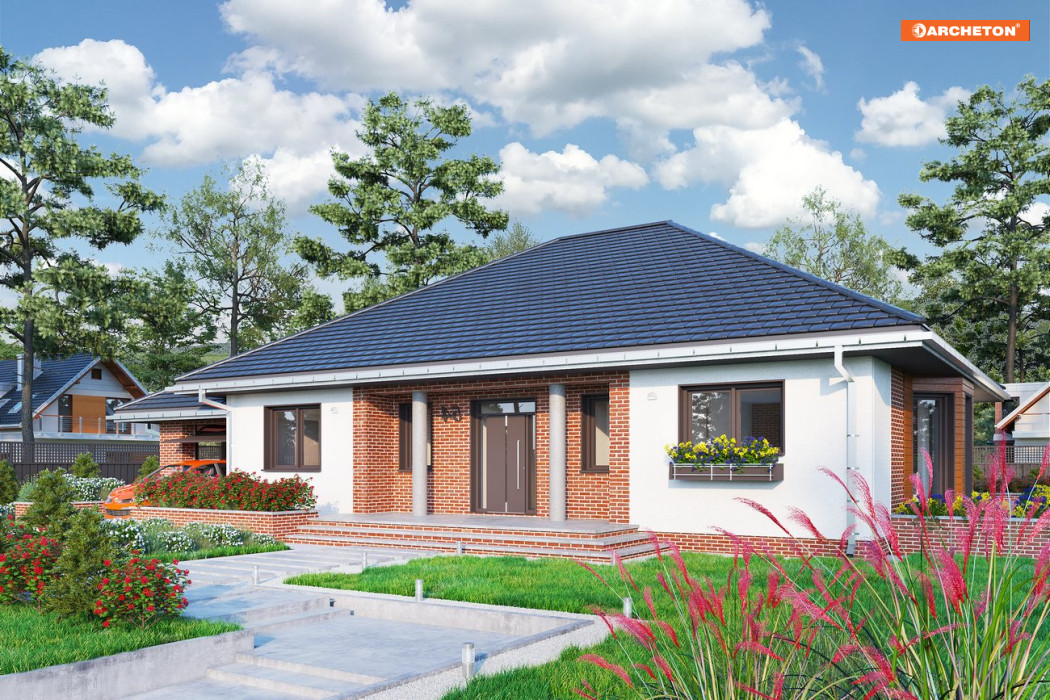 Średniej wielkości domy parterowe z pojedynczym garażem mają w ofercie Archetonu najczęściej czterospadową konstrukcję dachu. Projekt domu Eliza jest wśród nich propozycją o dość stromych połaciach i prostokątnym, zwartym rzucie. Część gospodarcza, dostępna tylko z zewnątrz, dostawiona jest do ściany bocznej. Wyjątkowo duży garaż z kotłownią ma własne przekrycie i jest głęboko odsunięty od elewacji budynku mieszkalnego. Frontowa wnęka, wsparta dwoma słupami, wprowadza do centralnie położonego, obszernego holu dzielącego mieszkanie na część wspólną i prywatną. Strefa rodzinna to przestronne, otwarte wnętrze z dużą kuchnią i jadalnią w ryzalicie przy salonie. Trzy sypialnie, odizolowane od komunikacji dwoma łazienkami i garderobami, tworzą po drugiej stronie planu spokojną część nocną. Wygodnie położone: spiżarnia i pralnia, przy wejściu, obejmują sporą sień. Projekt domu Eliza wyróżnia wśród podobnych rozwiązań symetryczny układ elewacji wejściowej części mieszkalnej, która wysuwa się zdecydowanie na pierwszy plan, mimo, że jest składową większej, złożonej bryły.