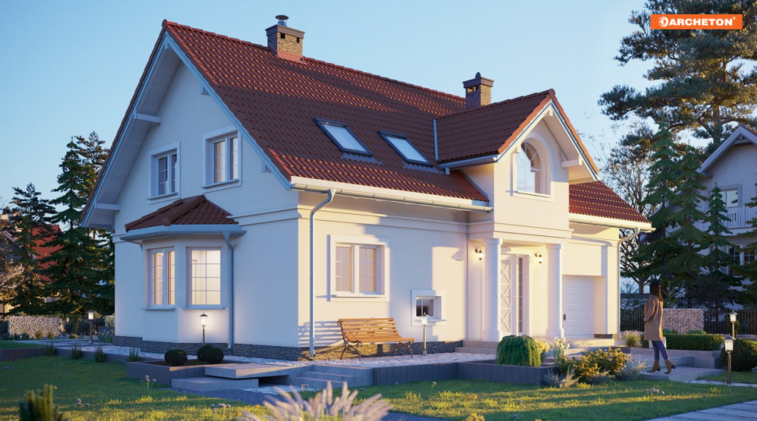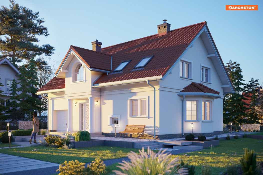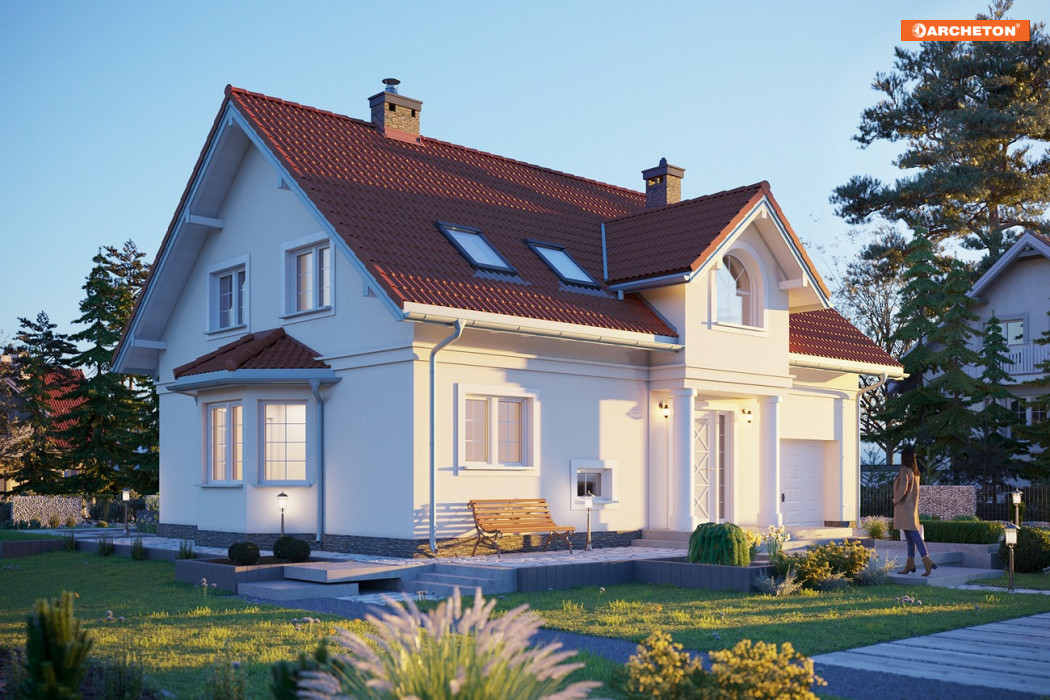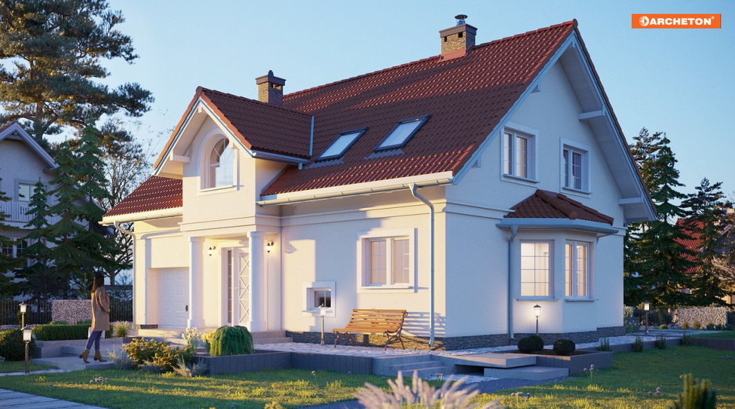Projekt domu Gala Lux to średniej wielkości dom parterowy z użytkowym poddaszem dla 4 lub 5 osobowej rodziny. Posiada czytelny podział funkcjonalny – parter to część dzienna z wydzieloną strefą gospodarczą (garaż + kotłownia dostępne są z wiatrołapu) oraz poddasze - strefa nocna. Salon wraz z kuchnią i jadalnią tworzą przestronne, otwarte wnętrze skupione wokół centralnie ustawionego kominka. Dodatkowy pokój na parterze pozwala na przyjmowanie gości lub komfortową pracę w ciągu dnia. Umożliwia też etapowanie budowy tworząc z pokojem dziennym i łazienką kompletne mieszkanie dla 2 osób. Na poddaszu jest miejsce na cztery sypialnie i przestronną łazienkę oświetlona oknem w lukarnie. Zwarta bryła budynku w projekcie domu Gala Lux jest urozmaicona ryzalitem jadalni w ścianie bocznej i wejściowym portykiem z kolumnami. Opaski wokół okien oraz gzymsy nadają budynkowi tradycyjny, historyzujący charakter. Przy tak zbudowanej bryle, opartej na rzucie prostokąta, z dwuspadowym, prostym dachem, całość tworzy energooszczędne i eleganckie rozwiązanie.