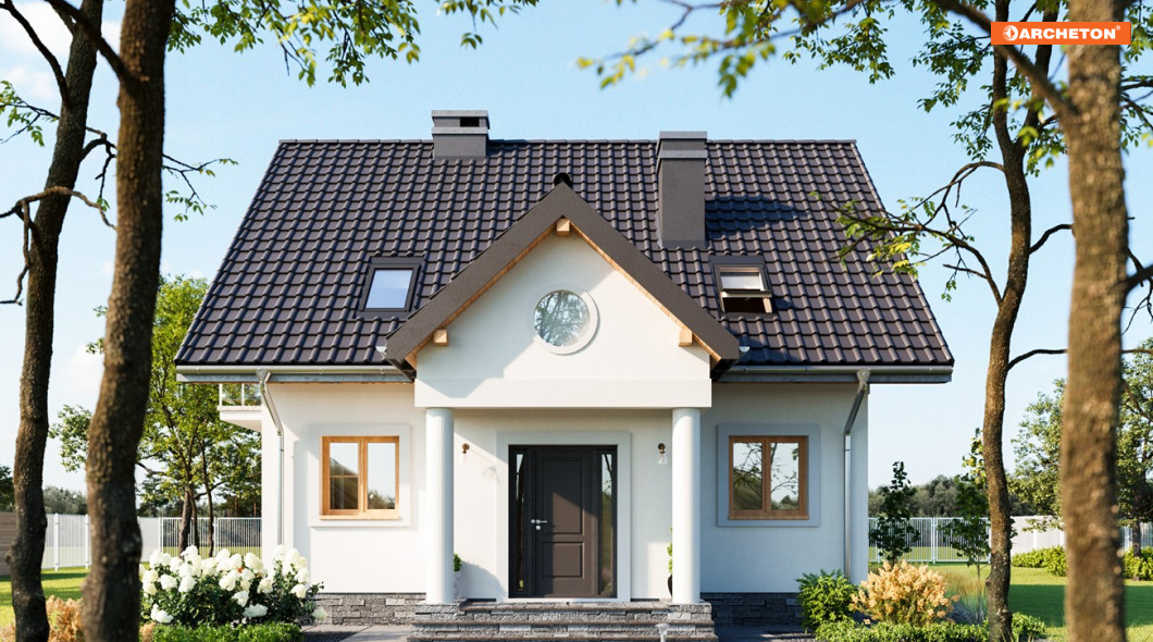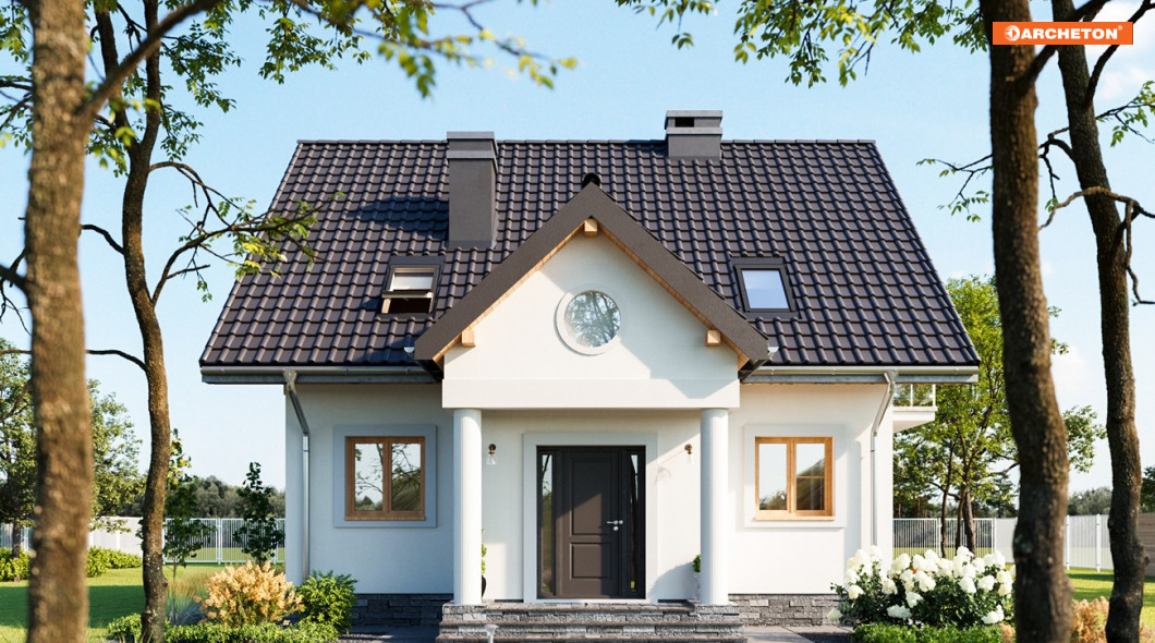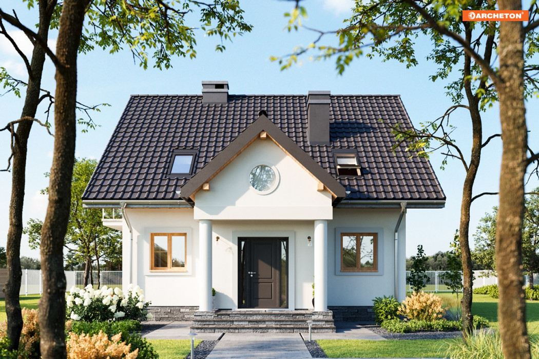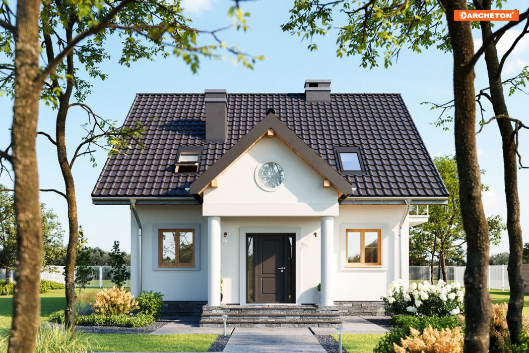 Projekt domu Staś Retro i całą Rodzinę Stasia wyróżnia fronton z podcieniem i przedsionkiem wypchniętym z elewacji wejściowej. Jest to jedyny tak wyrazisty, klasycyzujący detal w grupie niewielkich, parterowych domów z użytkowym poddaszem i kalenicą dwuspadowego dachu równoległą do drogi dojazdowej. W połączeniu z kwadratowym rzutem i symetrycznie skomponowanymi elewacjami tworzy koncepcję o dość charakterystycznej architekturze. Plan dzieli na połowy ściana nośna, wyznaczająca po jednej stronie strefę wejścia i komunikacji z kuchnią, wc i kotłownią oraz szeroki salon od ogrodu. Pokój dzienny jest wyjątkowo obszerny jak na mieszkanie o powierzchni ok. 100m2. W projekcie domu Staś Retro, jak i w pozostałych wersjach, ekonomiczny układ konstrukcyjny parteru przekłada się na racjonalny, wygodny rozkład poddasza z trzema sypialniami i dużą łazienką. Zwarty kształt niewielkiej sylwetki dobrze wpisuje się zarówno w małe jak i wąskie działki. Tylko wersja Staś Lux jest szersza, bo jako jedyna przewiduje dostawiony garaż.
