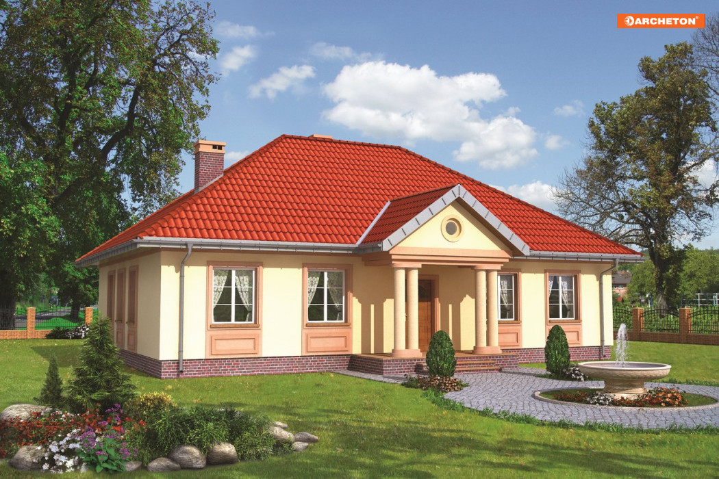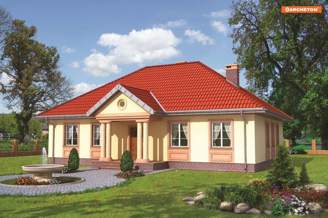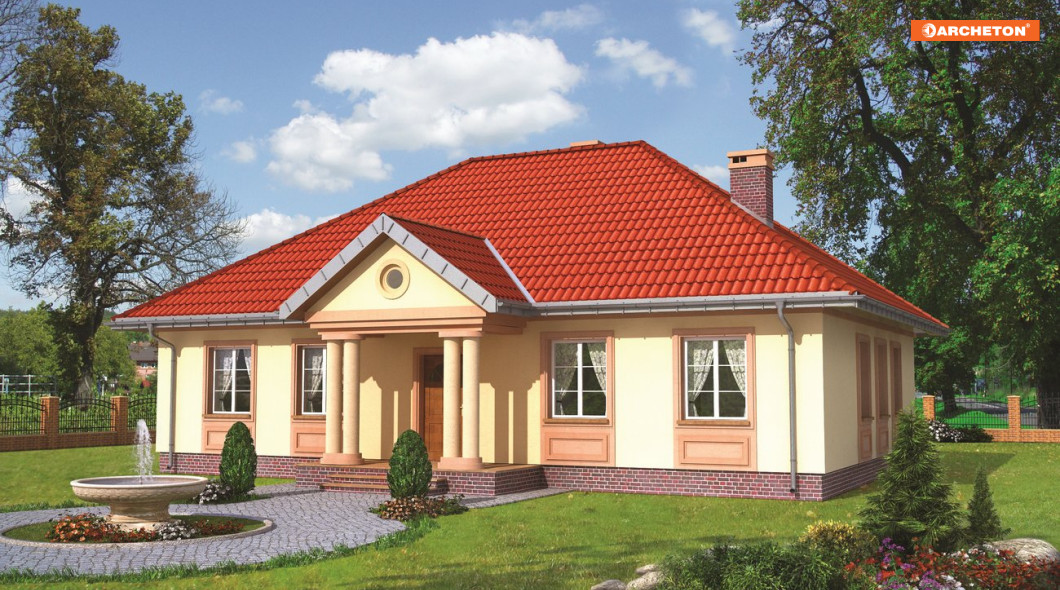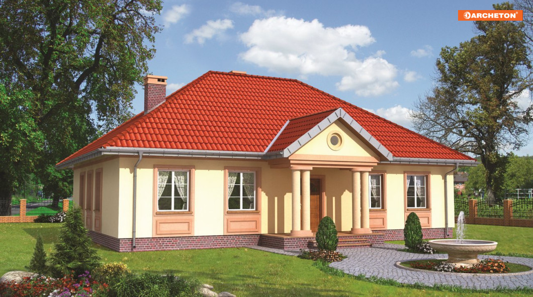 Architektura polskiego dworku nieustannie inspiruje tworzących projekty domów jednorodzinnych. Rzut na planie prostokąta jest energooszczędny, a nieużytkowa przestrzeń pod czterospadowym dachem w sposób naturalny (a więc najbardziej ekonomiczny!) izoluje od chłodów i od upału. Projekt domu Aleksandria Hera to większy z kilku parterowych wariantów rodziny Aleksandrii. Czerpią one wprost z historycznego pierwowzoru, oferując jednopoziomowe (za wyjątkiem wersji Tura) mieszkanie bez garażu o powierzchni 100-140m2. Tradycyjna bryła Aleksandrii o zbliżonych do autentycznych proporcjach zawiera, zamiast izb w amfiladowym układzie, przestronne, nowoczesne mieszkanie dla 4-5 osób. Część dzienna to otwarty salon z dużą kuchnią, do której przylega kotłownia (największa w rodzinie), spiżarnia i gościnna łazienka. Strefa nocna z czterema pokojami i z dużą łazienką dostępna jest z korytarza wyprowadzonego z narożnika pokoju dziennego. Projekt domu Aleksandria Hera proponuje współczesne duże okna bez podziałów , ale historyzujący charakter architektury dominuje, podkreślony od frontu i od ogrodu kolumnowymi portykami.