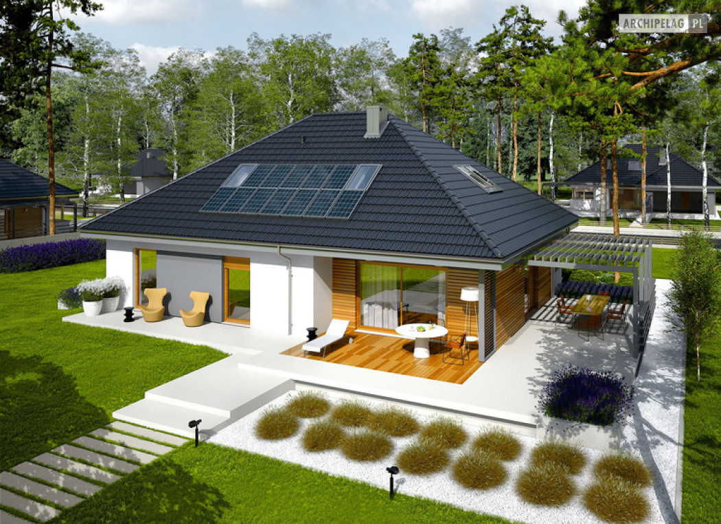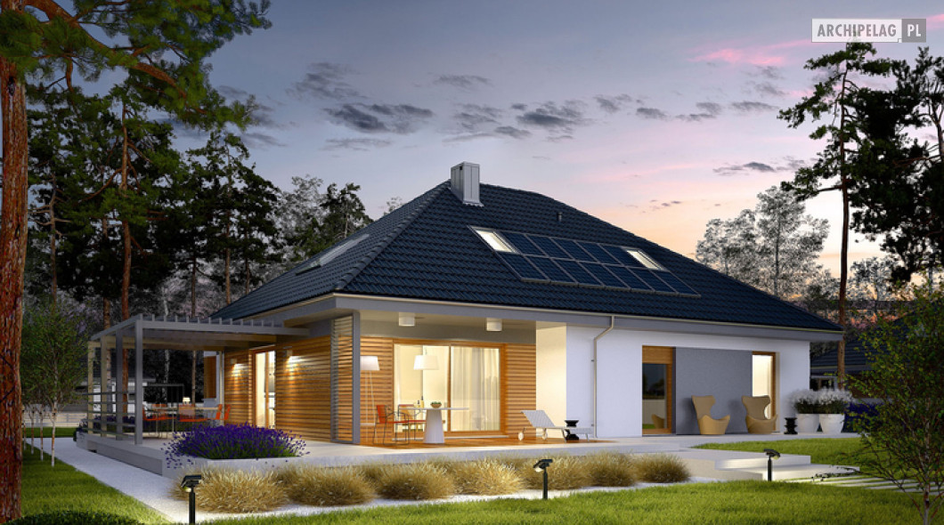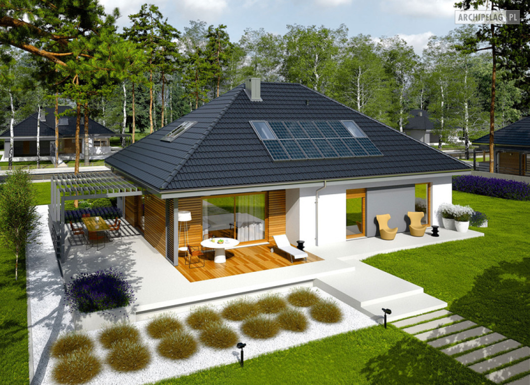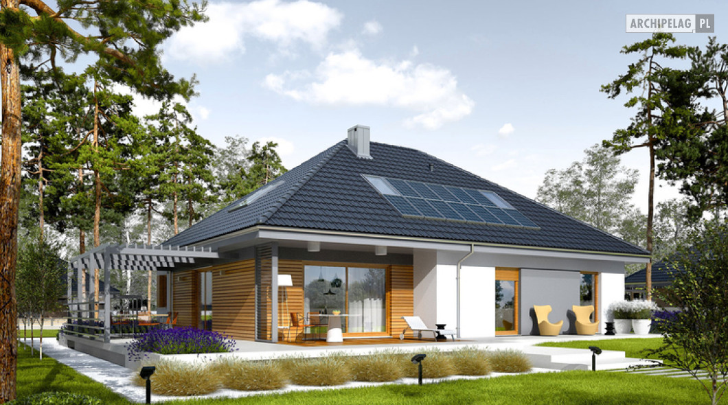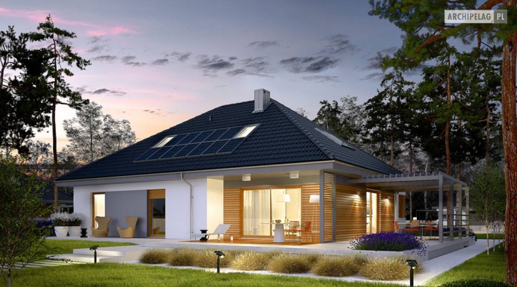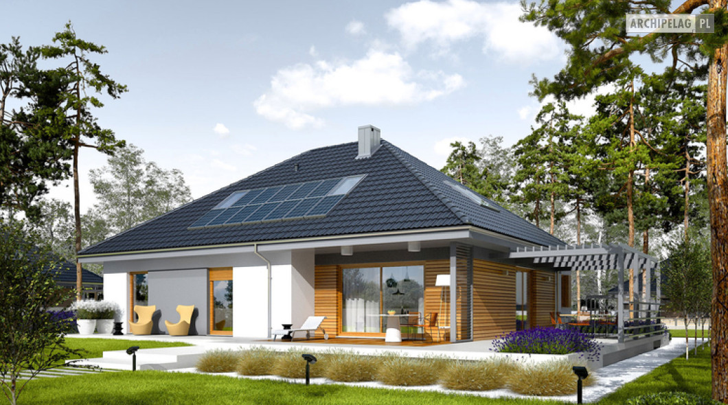 mniejsza powierzchnia użytkowa, dach o kącie nachylenia 30°, węższy budynek, z