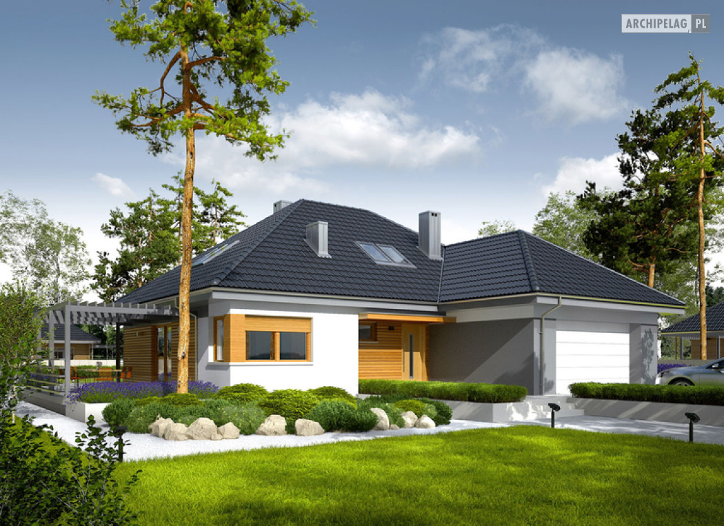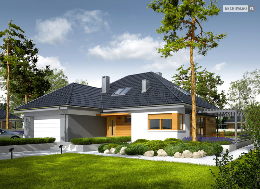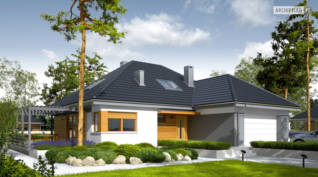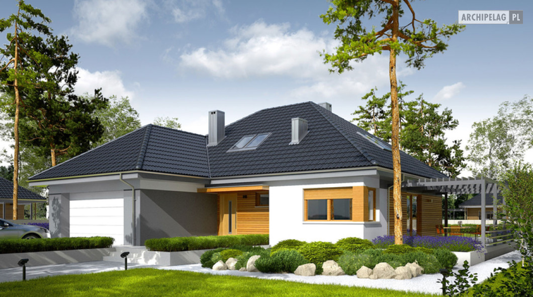 funkcji parteru, dach o kącie nachylenia 30°, szerszy budynek, z garażem jedno-