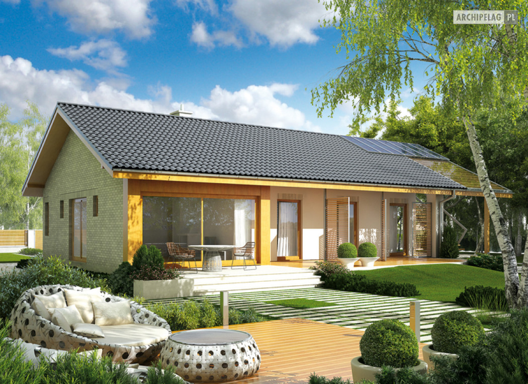Duże przeszklenia od strony tarasu, salon i sypialnie z widokiem na ogród