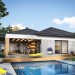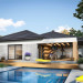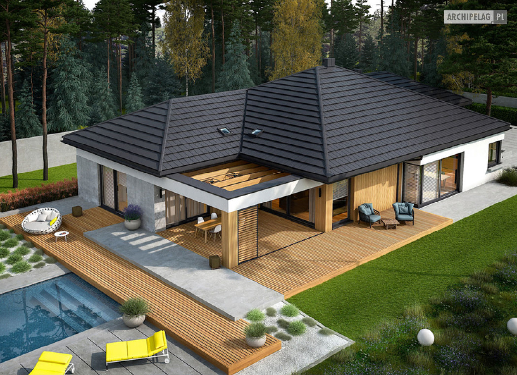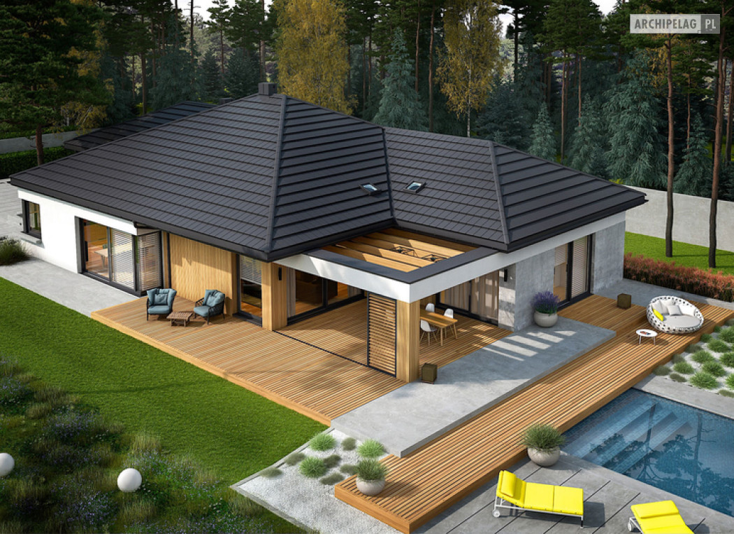 Otoczenie: kostka betonowa i płyty tarasowe firmy Libet, system tarasowy ProDeck - deska kompozytowa Terra w kolorze orzech