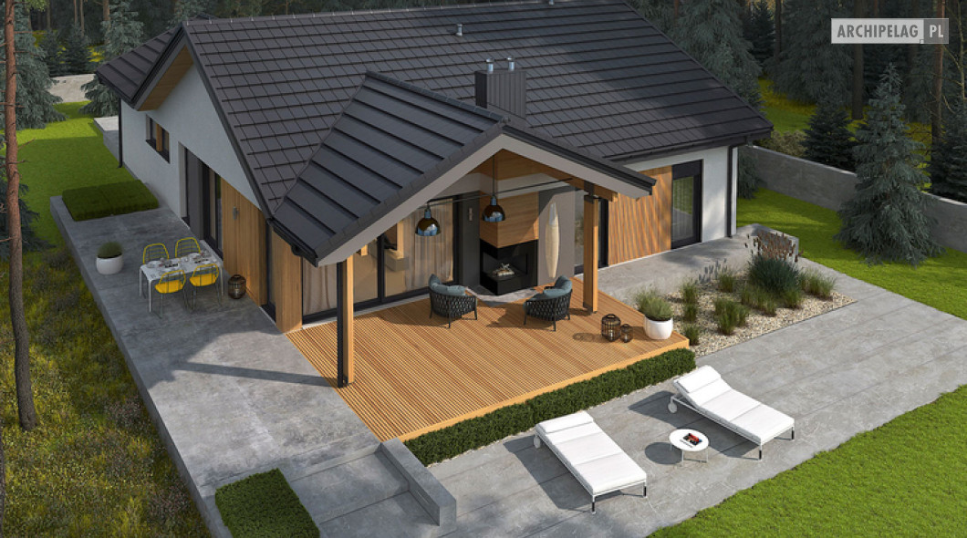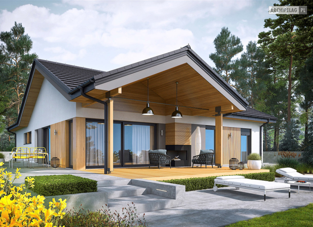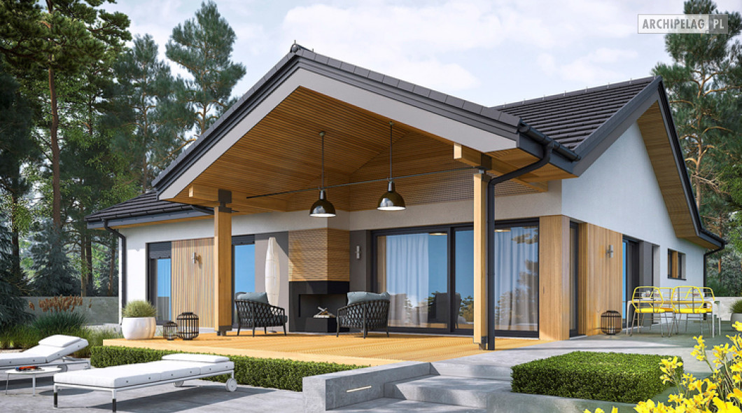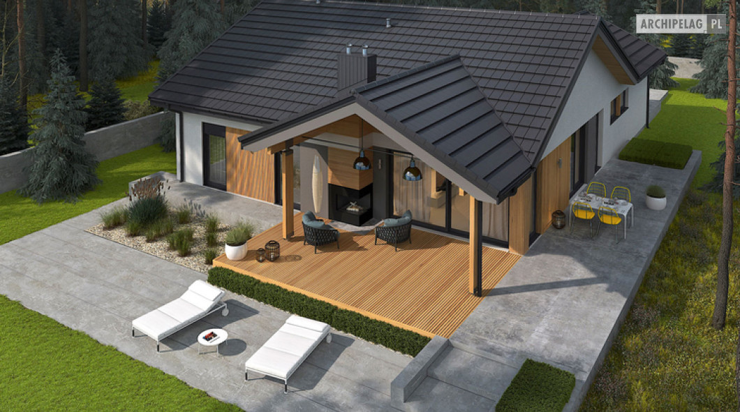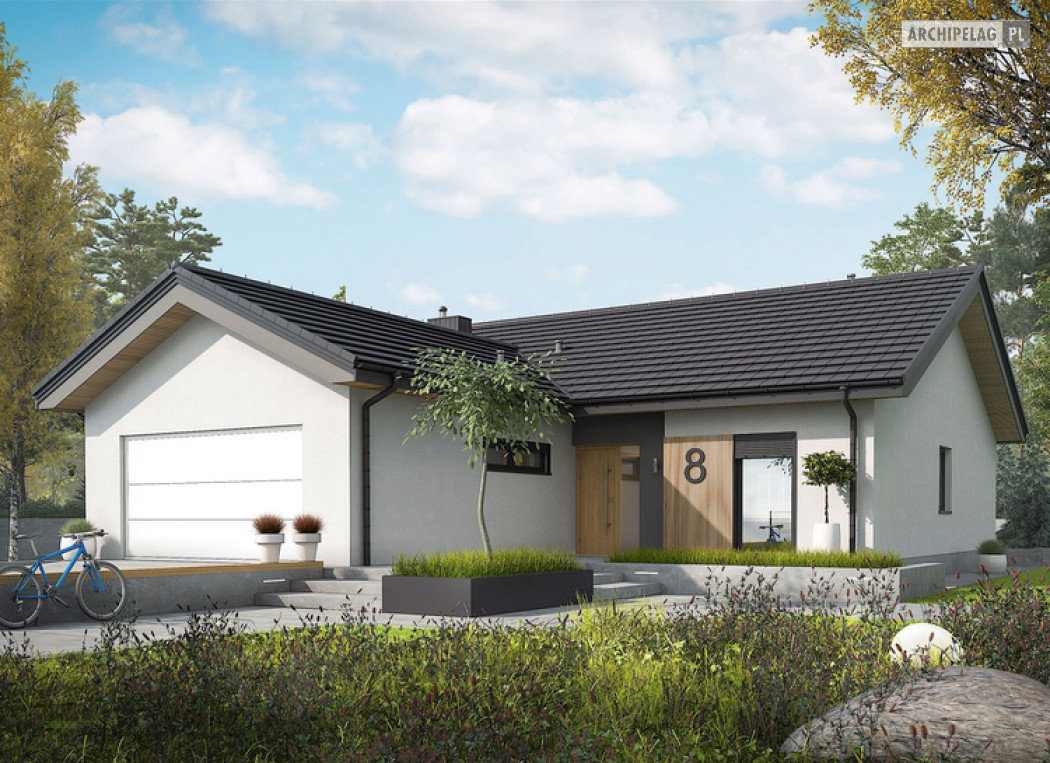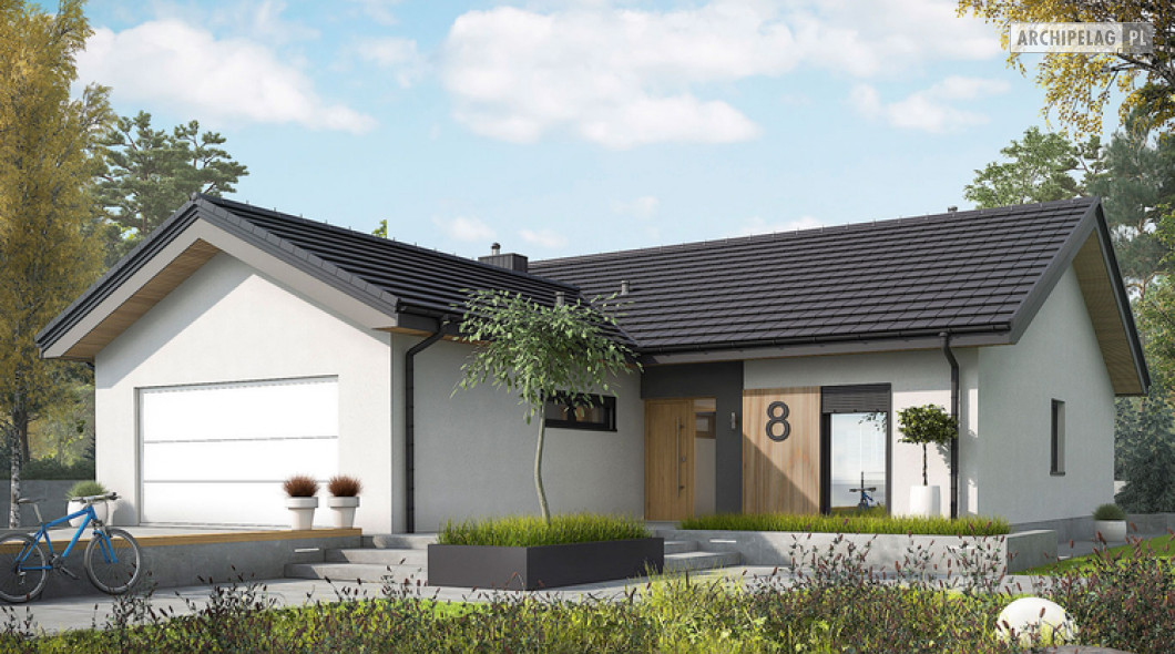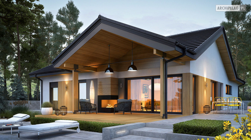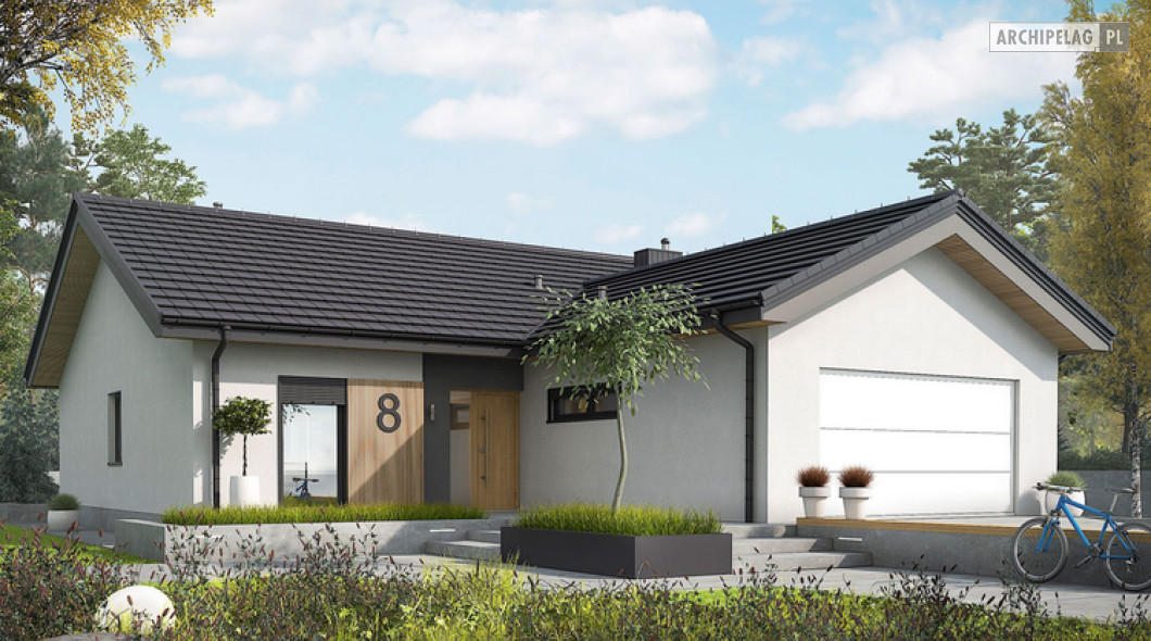 - Simon IV – dom parterowy, 3 sypialnie, dach o kącie nachylenia