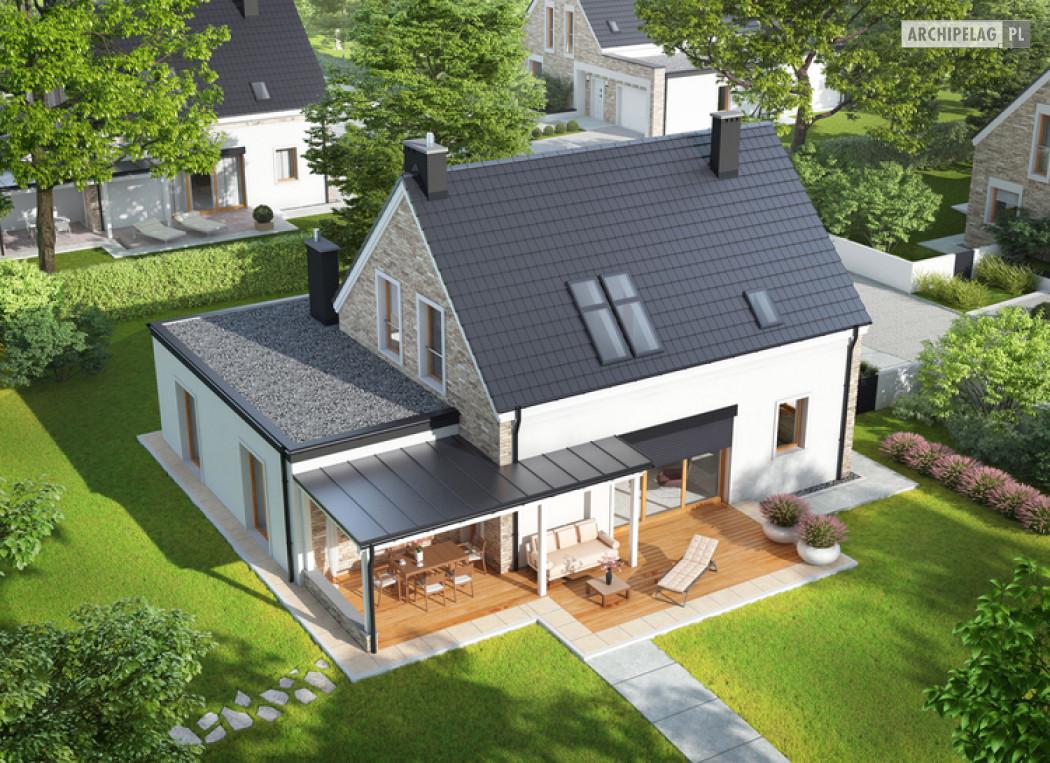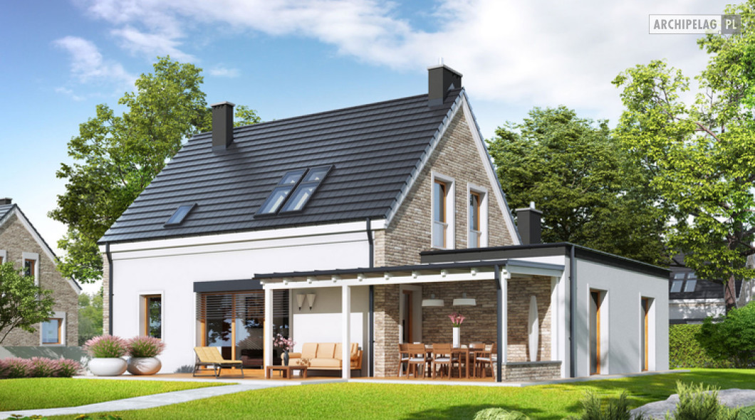 - Tymon G1 – elewacje tynkowane, na ścianach szczytowych okładzina