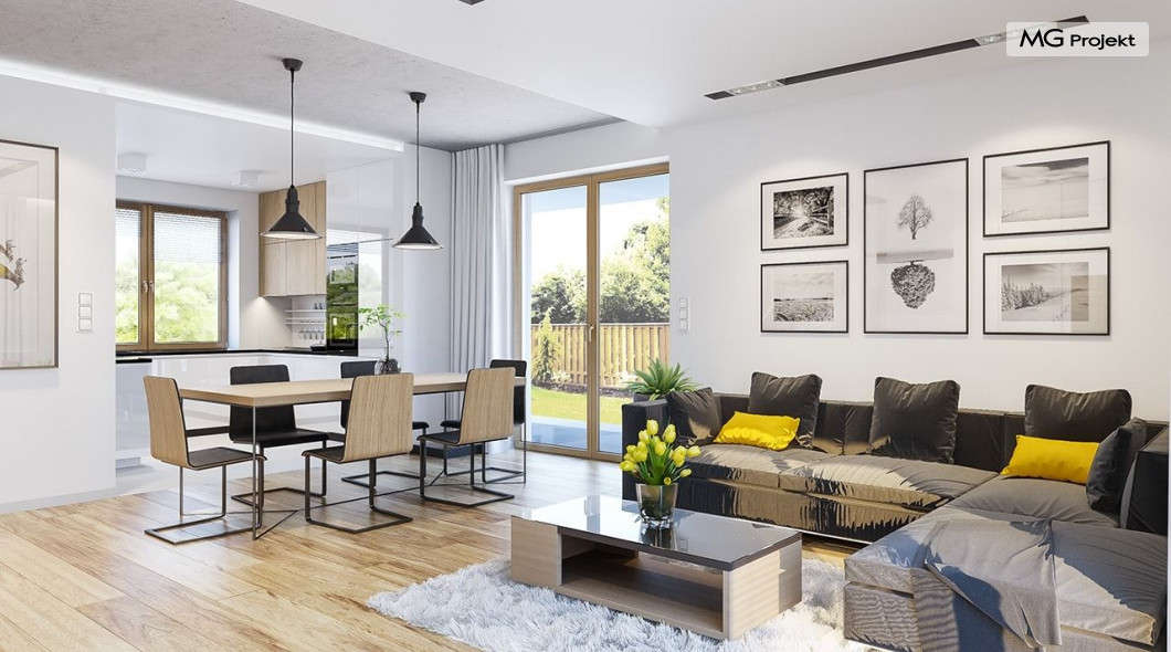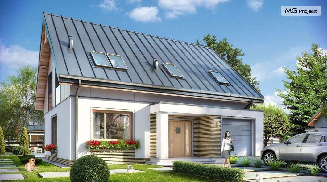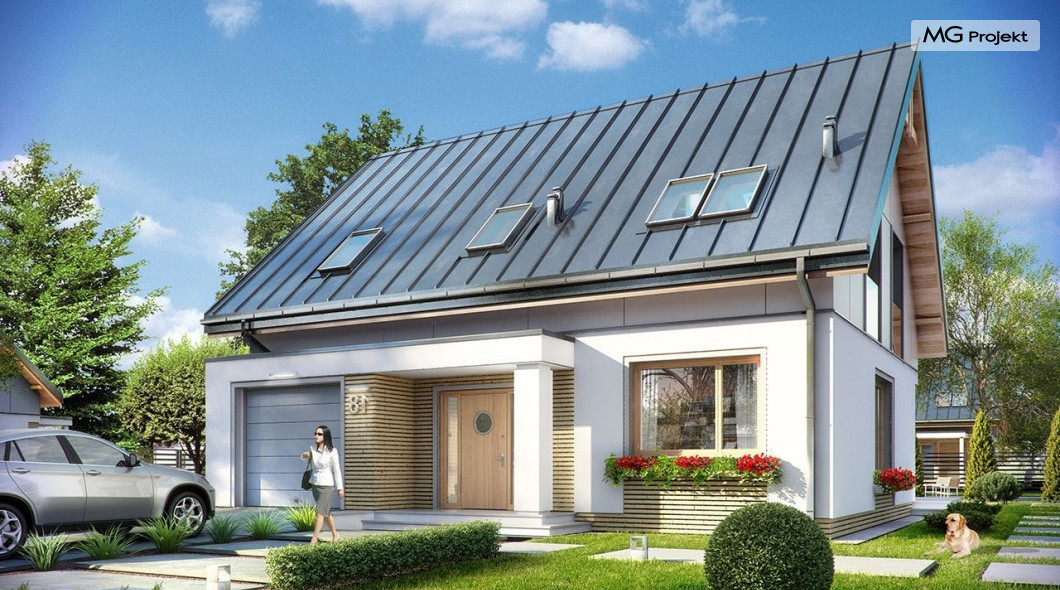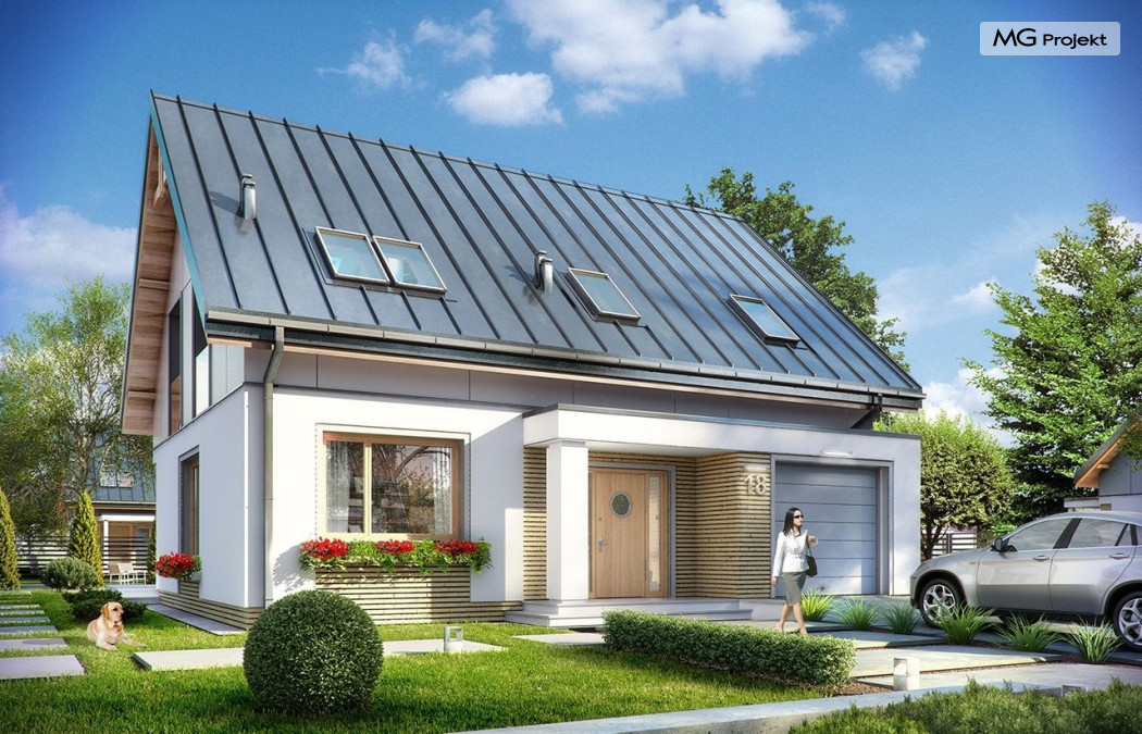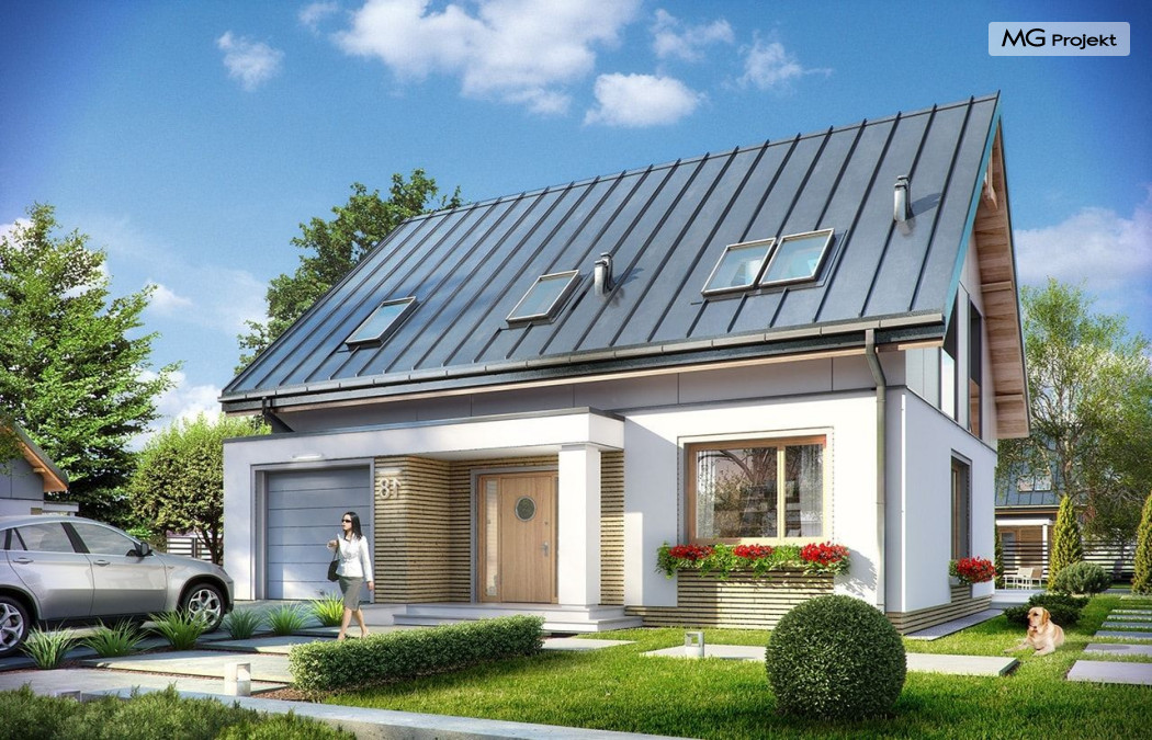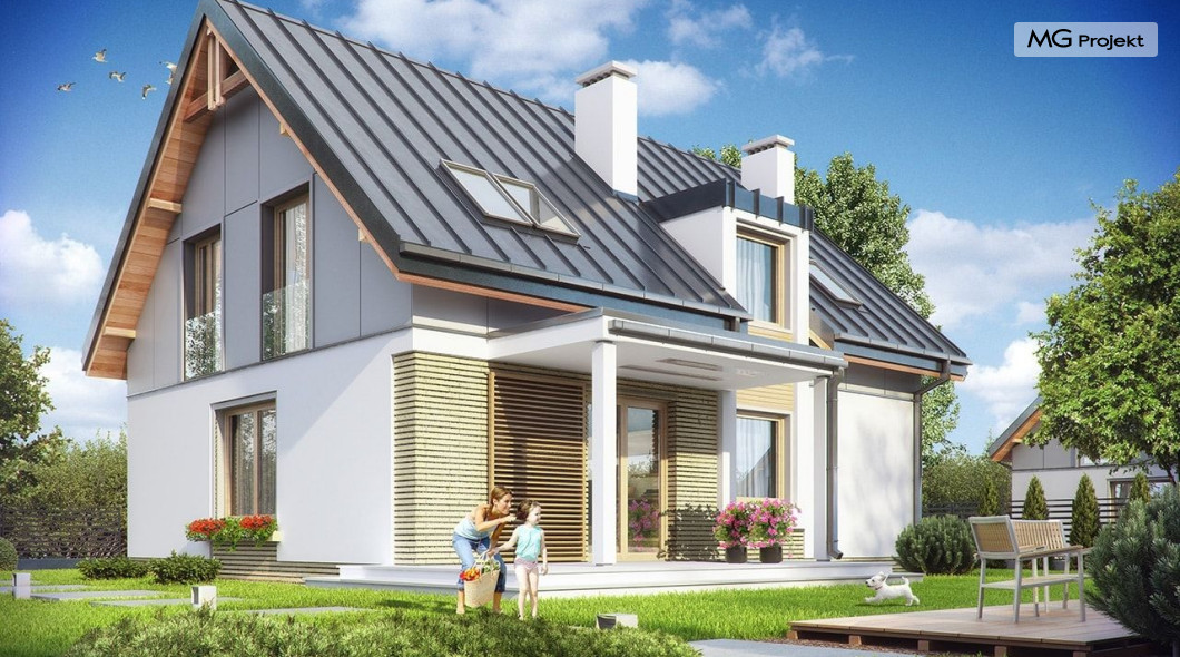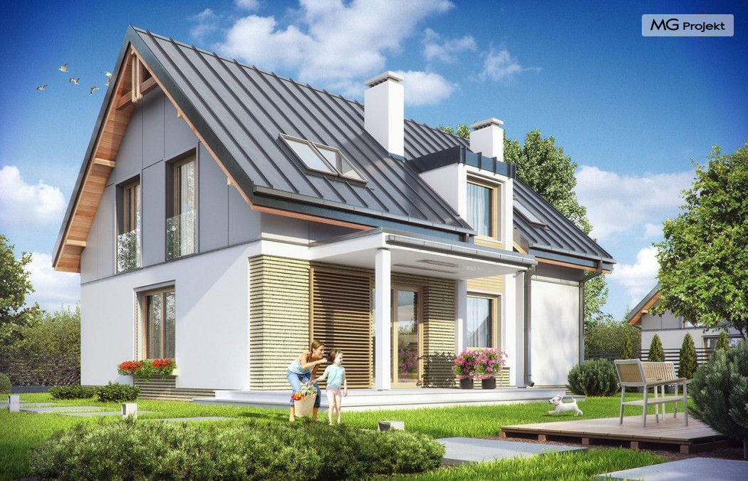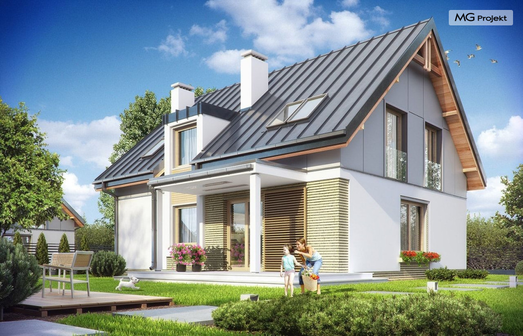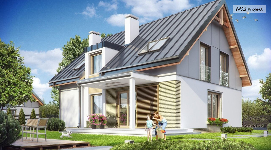 Projekt domu Albatros to prosty w budowie, niedrogi domek z poddaszem użytkowym dla 4-5 osobowej rodziny. Bryła budynku została zaprojektowana na planie prostokąta. Poddasze wieńczy symetryczny dwuspadowy dach. Projekt podporządkowano połączeniu ekonomicznych i funkcjonalnych rozwiązań, z nowoczesną i ciekawą estetyką budynku. Albatros jest klasycznym domem z poddaszem i dwuspadowym dachem, który bez problemu wybuduje każdy wykonawca, a zarazem ma w sobie „coś”: ciekawie dobrane materiały, dobre proporcje brył, właściwą wielkość okien, no i przede wszystkim – funkcjonalne, rozsądnie zaplanowane wnętrze. Parter domu, to przestrzeń dzienna, z wygodnym salonem, centralnym holem z ozdobnymi schodami, częściowo otwartą na salon kuchnią, oraz dodatkowy pokój - gabinet lub sypialnia gościnna i część gospodarcza, czyli garaż i kotłownia. Na poddaszu, dzięki wysokim ściankom kolankowym, mieszczą się trzy przestronne sypialnie, w tym sypialnia rodziców z osobną łazienka i garderobą. Dodatkowo przewidziano tu też miejsce na pralnię – ewentualnie schowek. Projekt domu Albatros mimo niewielkiej powierzchni to przestronny i wygodny budynek, który zapewni komfortowe warunki do życia nawet licznej rodzinie. Energooszczędne rozwiązania – dobre docieplenia, zwarta bryła budynku - pozwolą ograniczyć koszty przyszłej eksploatacji, a prostota konstrukcji domu zapewni mniej stresów podczas budowy. Pracownia posiada wersję odbicia lustrzanego projektu Albatros. Zapraszamy do zapoznania się z pełną ofertą pracowni MG Projekt: projekt domu Albatros 2.