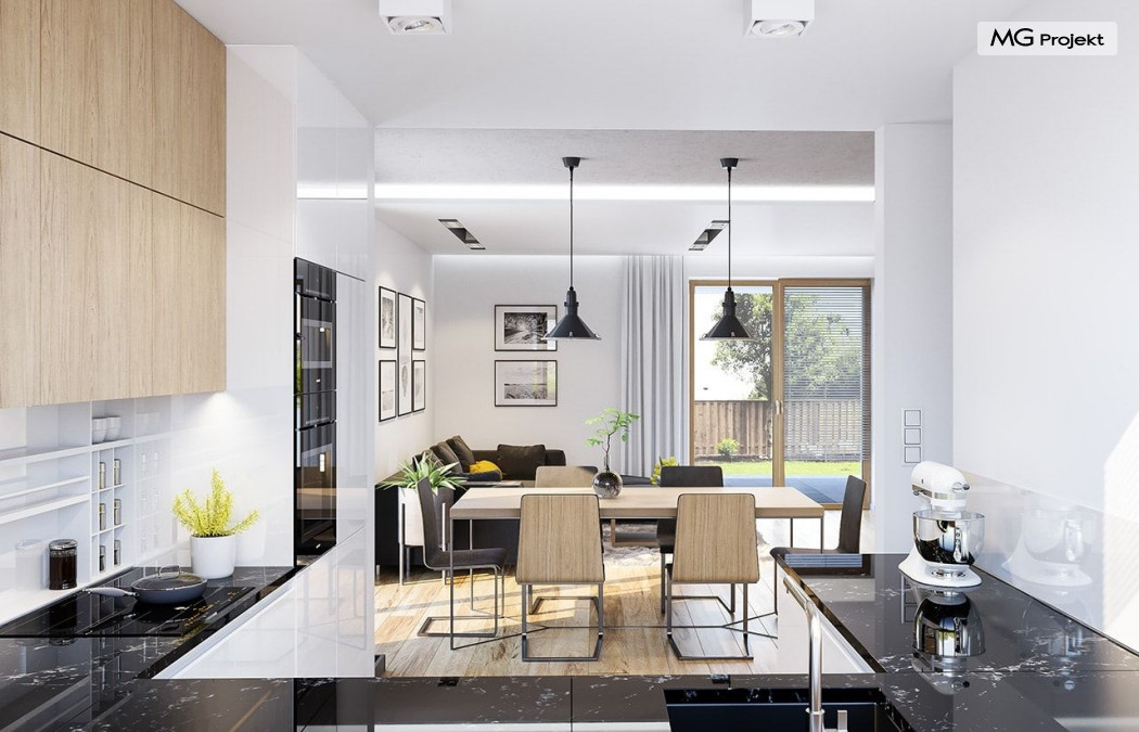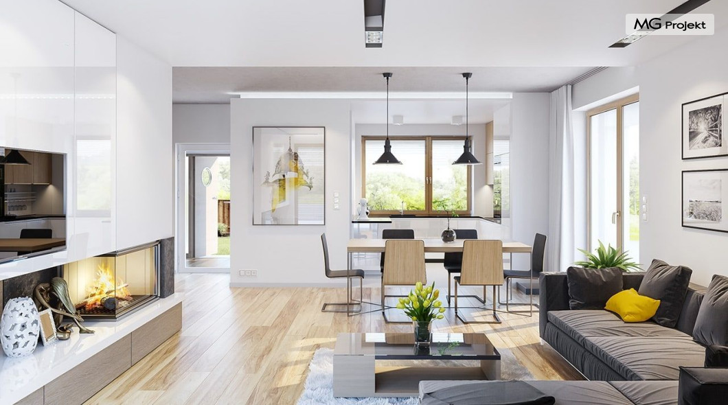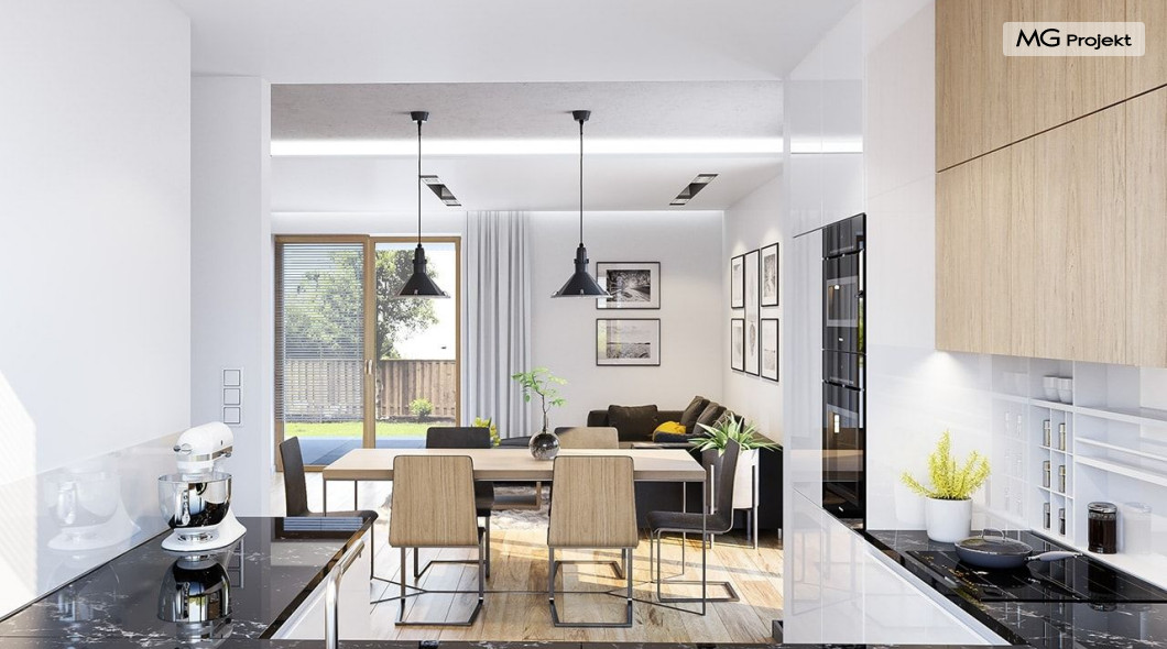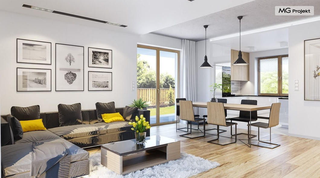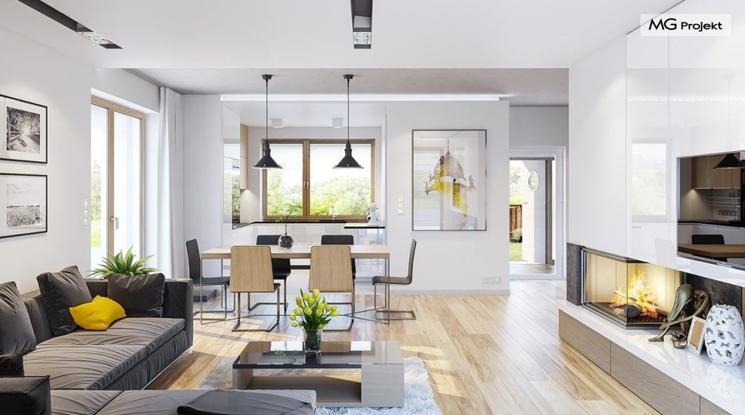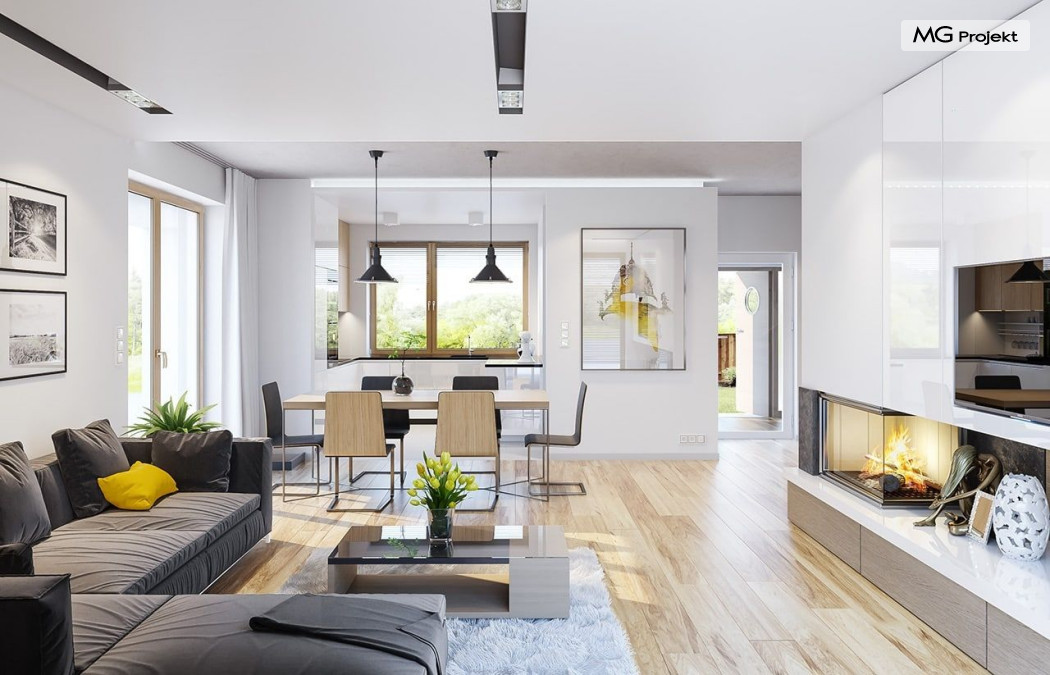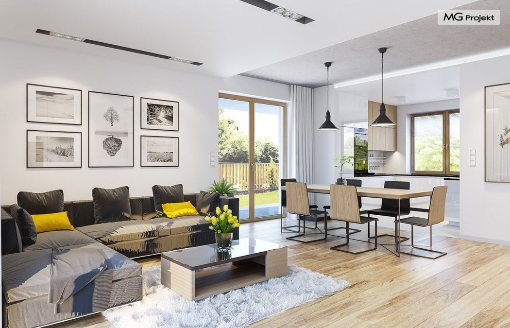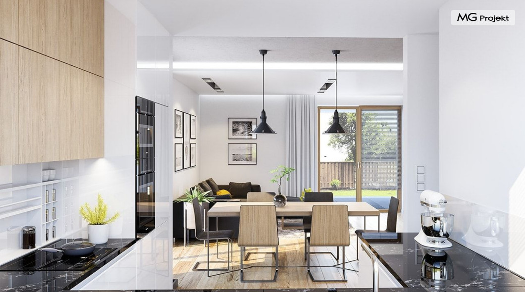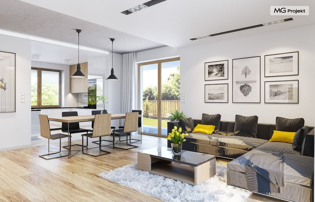 Projekt domu Albatros to prosty w budowie, niedrogi domek z poddaszem użytkowym dla 4-5 osobowej rodziny. Bryła budynku została zaprojektowana na planie prostokąta. Poddasze wieńczy symetryczny dwuspadowy dach. Projekt podporządkowano połączeniu ekonomicznych i funkcjonalnych rozwiązań, z nowoczesną i ciekawą estetyką budynku. Albatros jest klasycznym domem z poddaszem i dwuspadowym dachem, który bez problemu wybuduje każdy wykonawca, a zarazem ma w sobie „coś”: ciekawie dobrane materiały, dobre proporcje brył, właściwą wielkość okien, no i przede wszystkim – funkcjonalne, rozsądnie zaplanowane wnętrze. Parter domu, to przestrzeń dzienna, z wygodnym salonem, centralnym holem z ozdobnymi schodami, częściowo otwartą na salon kuchnią, oraz dodatkowy pokój - gabinet lub sypialnia gościnna i część gospodarcza, czyli garaż i kotłownia. Na poddaszu, dzięki wysokim ściankom kolankowym, mieszczą się trzy przestronne sypialnie, w tym sypialnia rodziców z osobną łazienka i garderobą. Dodatkowo przewidziano tu też miejsce na pralnię – ewentualnie schowek. Projekt domu Albatros mimo niewielkiej powierzchni to przestronny i wygodny budynek, który zapewni komfortowe warunki do życia nawet licznej rodzinie. Energooszczędne rozwiązania – dobre docieplenia, zwarta bryła budynku - pozwolą ograniczyć koszty przyszłej eksploatacji, a prostota konstrukcji domu zapewni mniej stresów podczas budowy. Pracownia posiada wersję odbicia lustrzanego projektu Albatros. Zapraszamy do zapoznania się z pełną ofertą pracowni MG Projekt: projekt domu Albatros 2.
