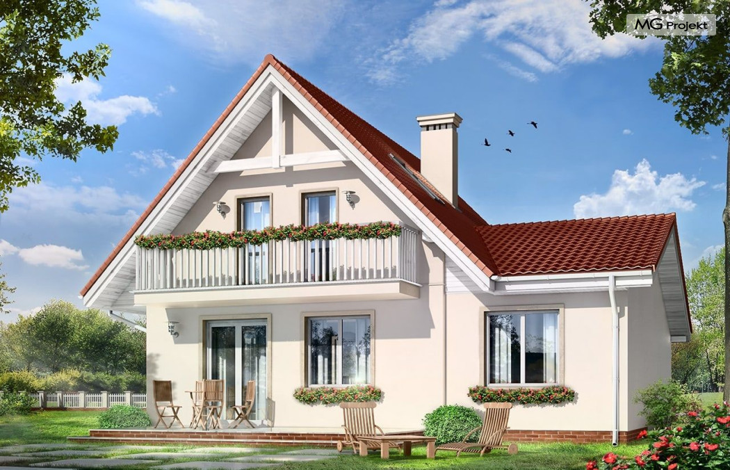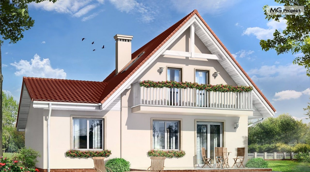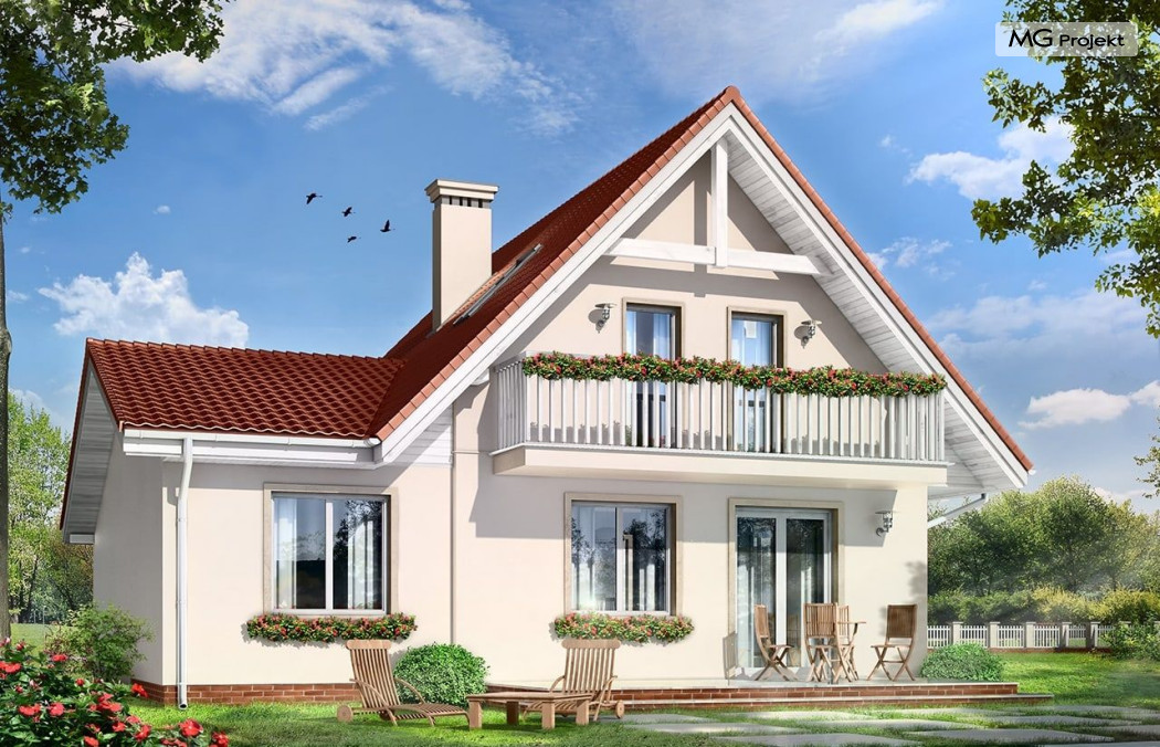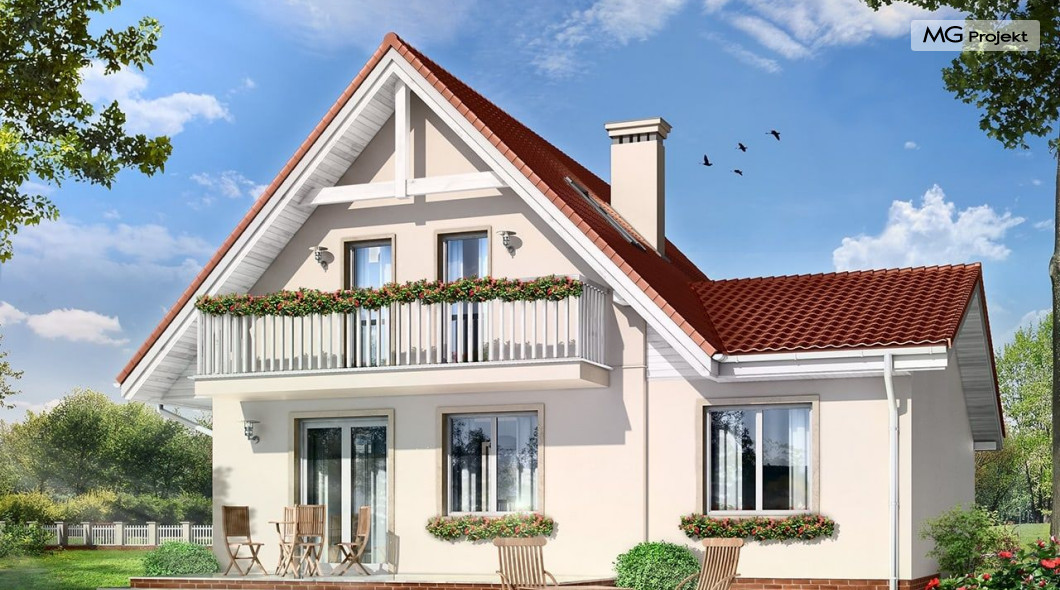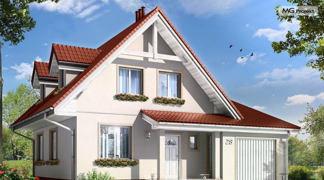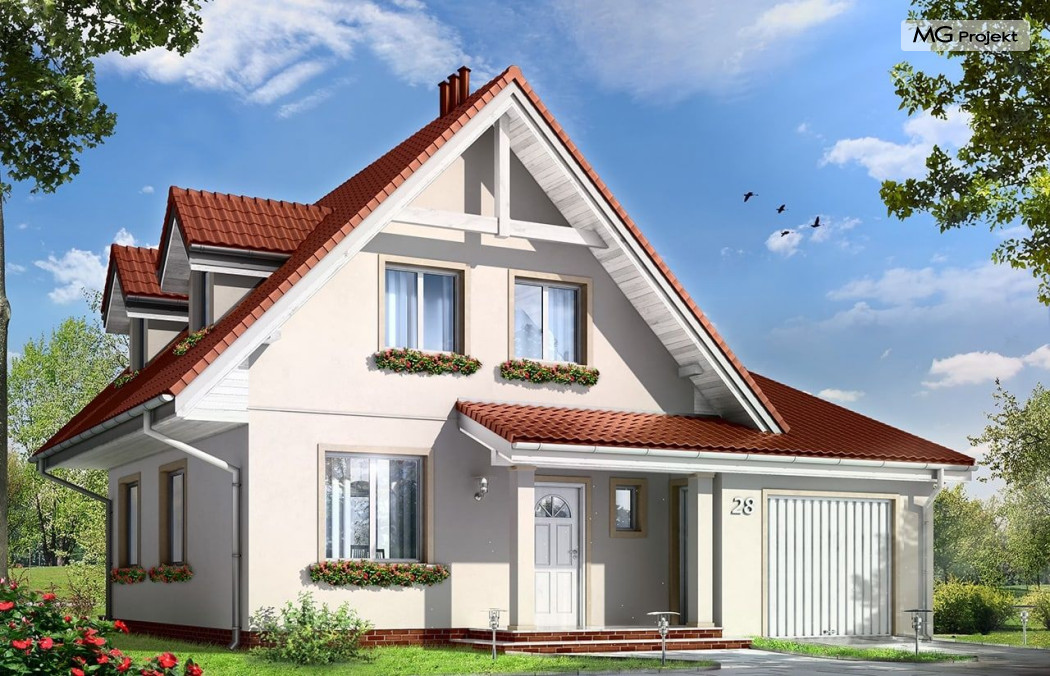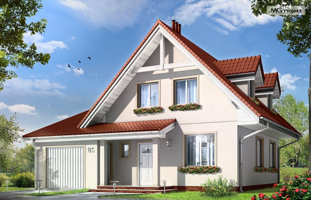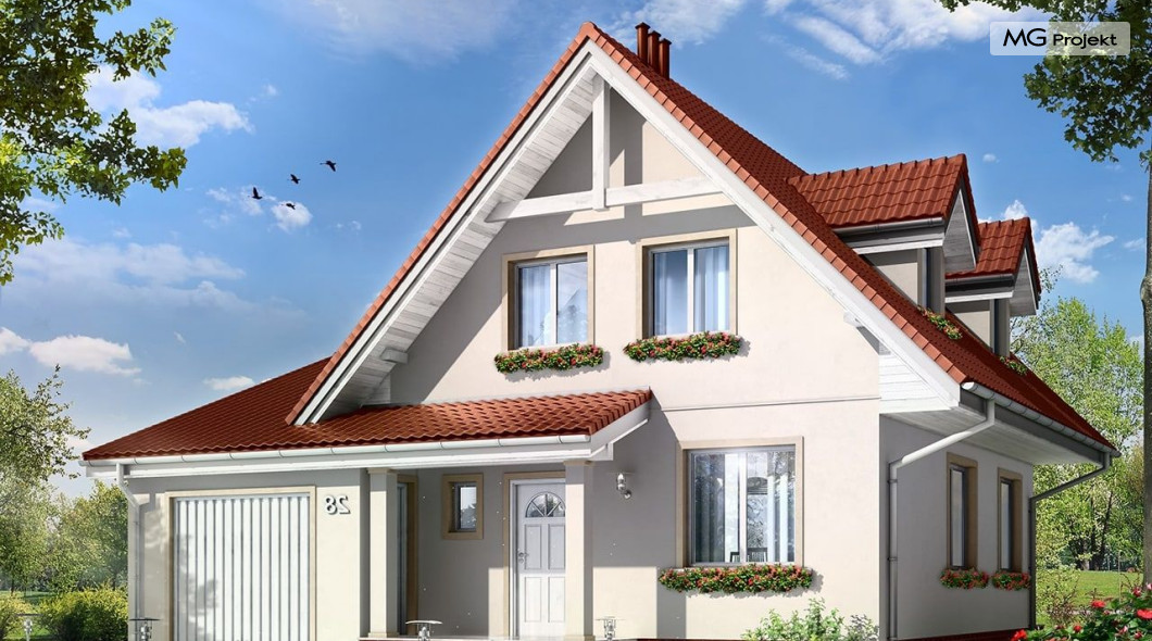 Projekt domu Alicja to propozycja dla rodziny cztero-pięcioosobowej. Dom parterowy, z poddaszem użytkowym, przykryty dwuspadowymi dachami, z dobudowanym garażem. Domek Alicja zaprojektowano w spokojnej stylistyce z przenikającymi się tradycyjnymi i nowoczesnymi detalami. Zwarta bryła budynku z dobudowanym garażem, została ozdobiona lukarnami, oraz balkonem w elewacji ogrodowej. We wnętrzu domu zaplanowano na parterze połączony hol, oraz salon tworzące otwartą przestrzeń dzienną. Otwarta kuchnia łączy się z aneksem jadalnym dodatkowo powiększając wnętrze. Centralnie usytuowane schody na poddasze, oraz ściana kominkowo-telewizyjna stanowią główną oś podziału przestrzeni. Na parterze przewidziano dodatkowy pokój, mogący służyć jako gabinet lub dodatkowa sypialnia. Z dużej łazienki z natryskiem wydzielono aneks techniczny z miejscem na kocioł c.o. Na poddaszu zaprojektowano trzy sypialnie, oraz łazienkę. Pracownia posiada także wersję odbicia lustrzanego projektu domu Alicja oraz wariant projekt domu Alicja wariant B https://www.mgprojekt.com.pl/alicja-wariant-b