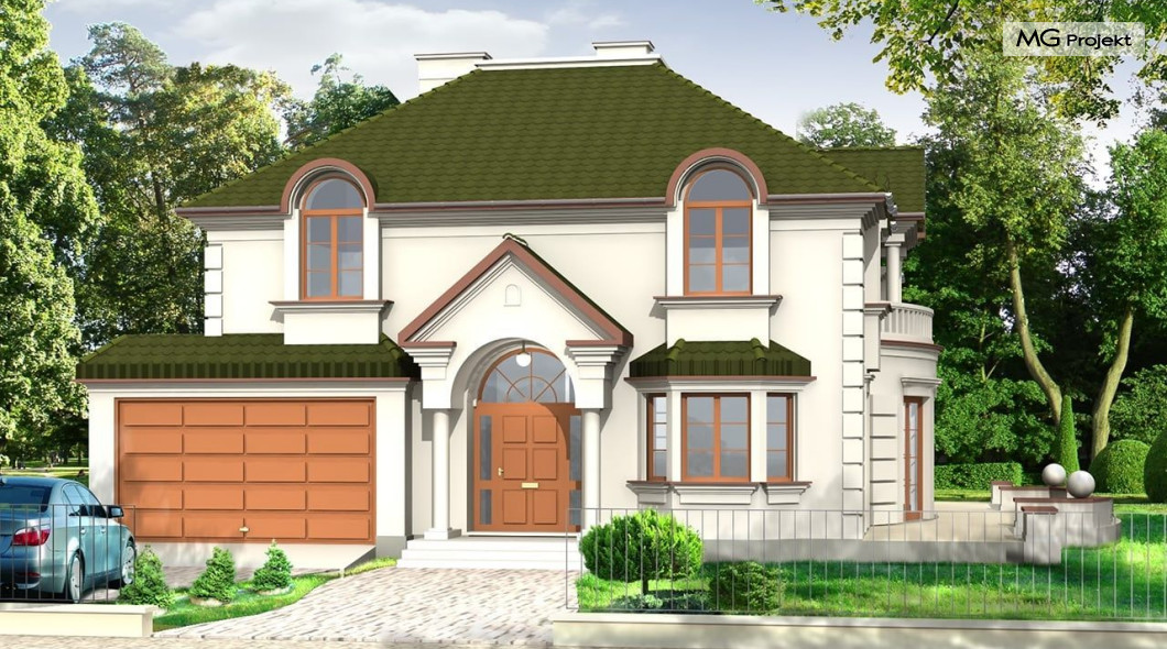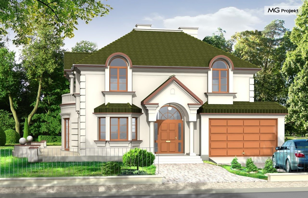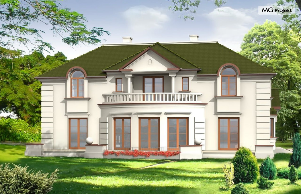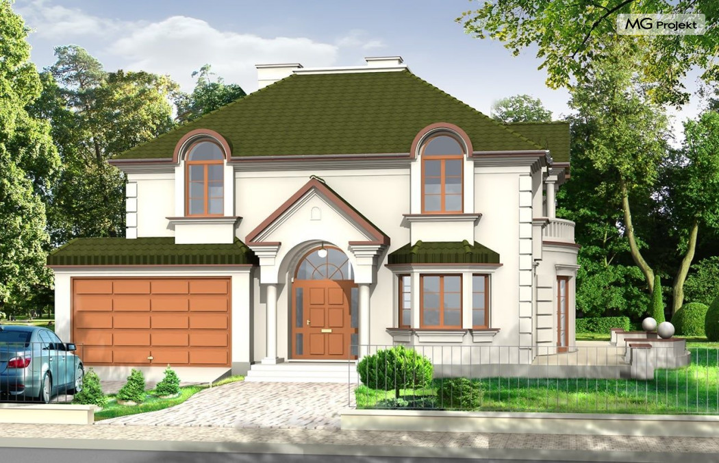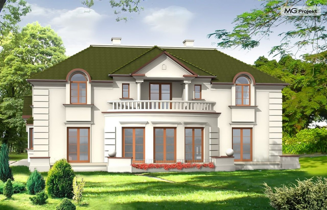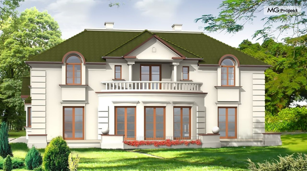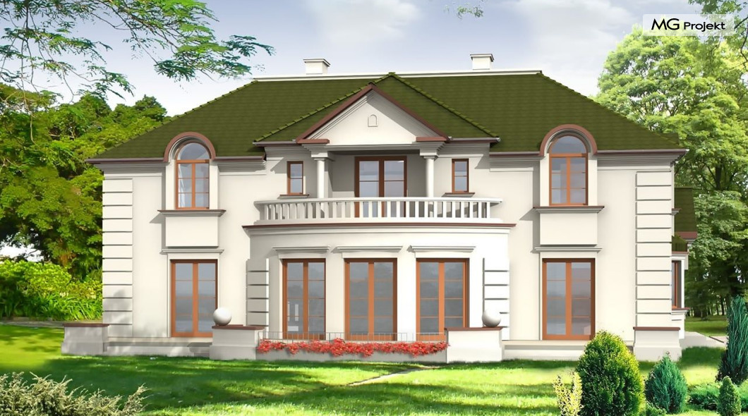 Projekt domu Ambasador to duży, reprezentacyjny, piętrowy dom dla 4-6 osobowej rodziny. Architektura Ambasadora wyraża poczucie stabilizacji i komfortu - wyższej klasy. W projekcie domu Ambasador, dzięki zaprojektowanemu wejściu od strony krótszej elewacji istnieje możliwość adaptacji na działkę z ogrodem z boku. Prostokątna bryła domu z dobudowanym garażem i ozdobnym portykiem wejściowym tworzą mimo mnogości detali jasny i klarowny układ wnętrza i konstrukcji. Wygląd zewnętrzny podporządkowano osiowości i estetyce natomiast wnętrze jest maksymalnie funkcjonalne. Projekt dostępny jest w odbicu lustrzanym oraz w wersji bez garażu (projekt domu Ambasador 2 ) oraz w mniejszej wersji ( projekt domu Ambasador 3 ).