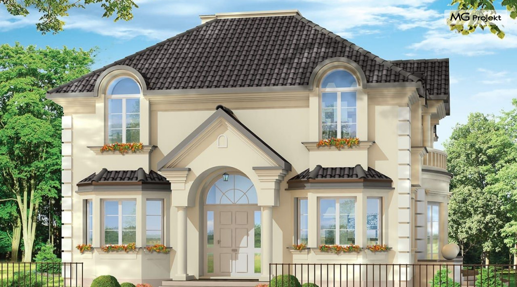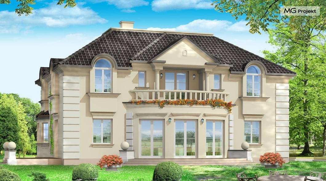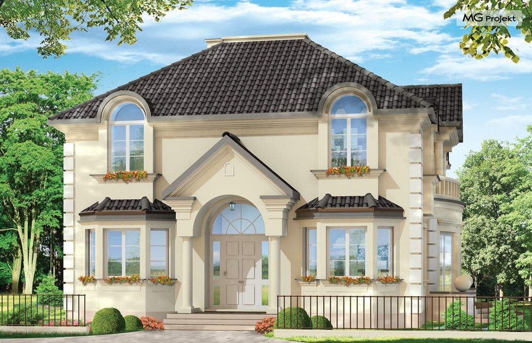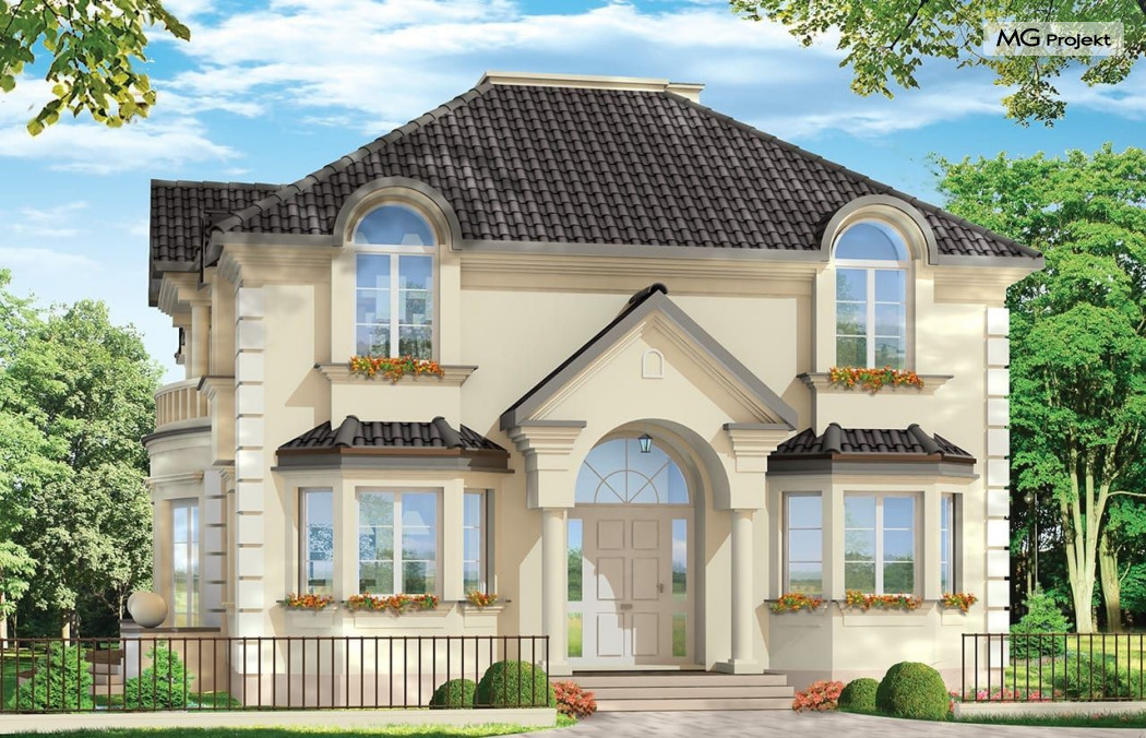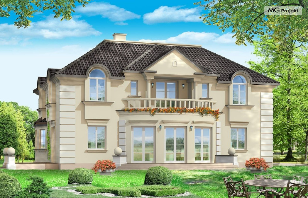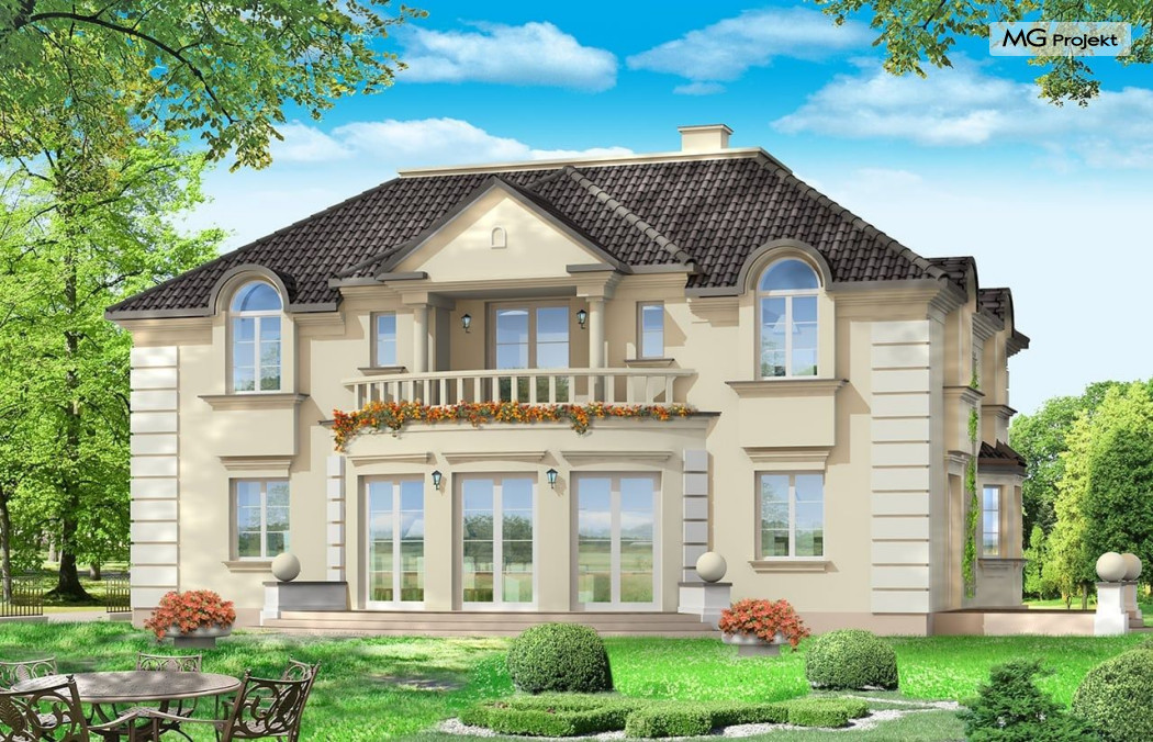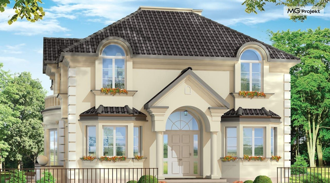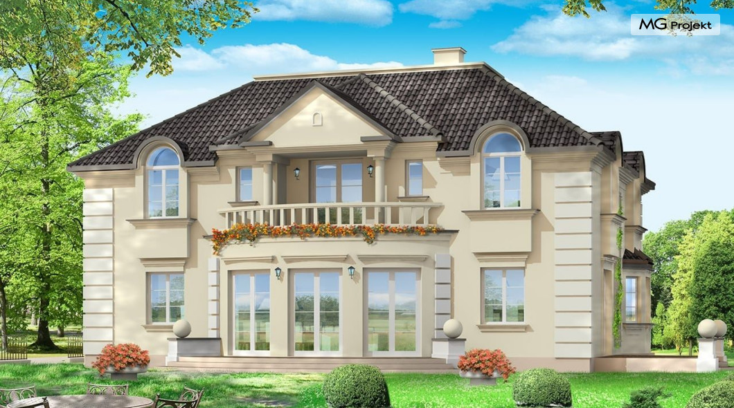Projekt domu Ambasador 3 to duży dom jednorodzinny dla 4-6 osób. Projekt domu o klasycznej architekturze, z ciekawymi detalami elewacji. Dom pasuje zarówno na działkę z ogrodem usytuowanym z tyłu jak i z boku. Wnętrze budynku podzielono na cześć dzienną na parterze i sypialnie na poddaszu. Zapraszamy do zapoznania się z pełną ofertą pracowni MG Projekt: dostępna jest wersja podstawowa projekt domu Ambasador, wersja bez garażu projekt domu Ambasador 2 oraz odbicie lustrzane.