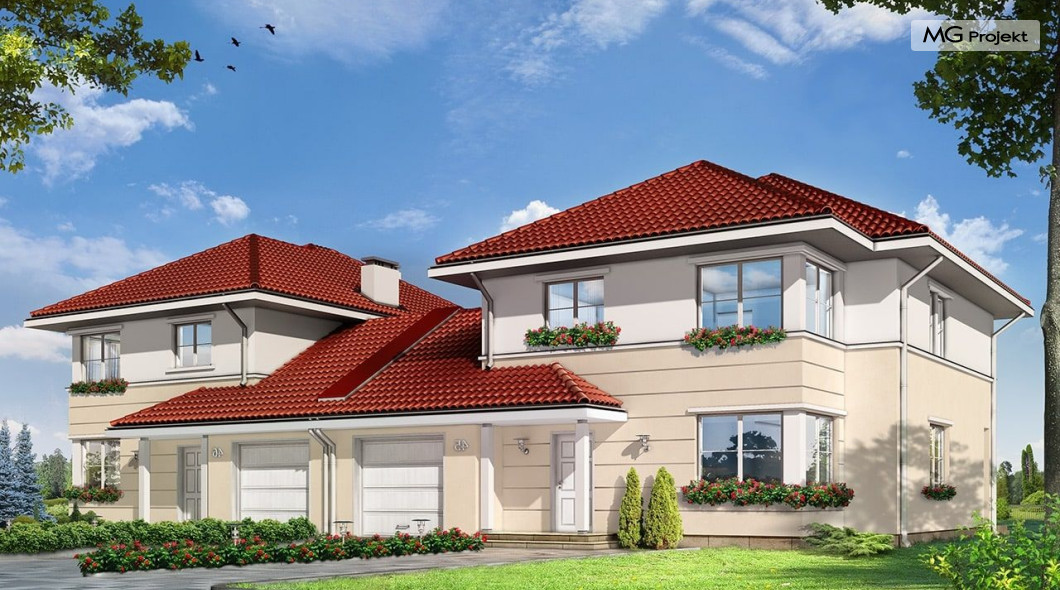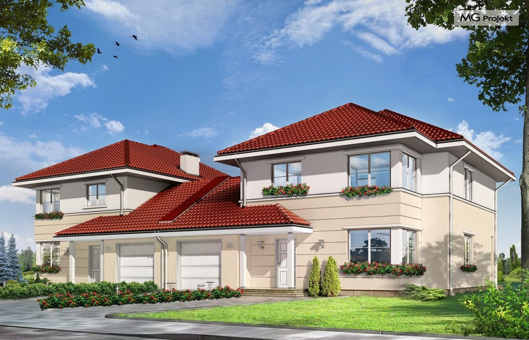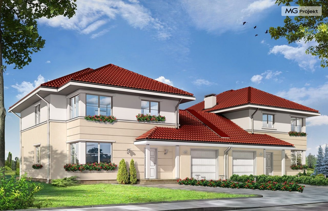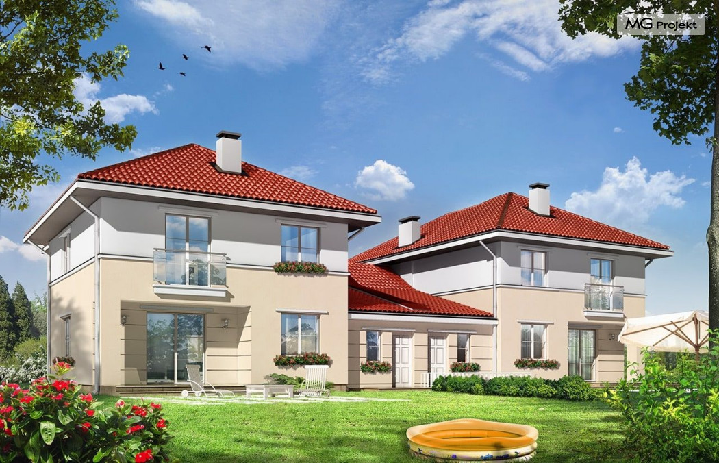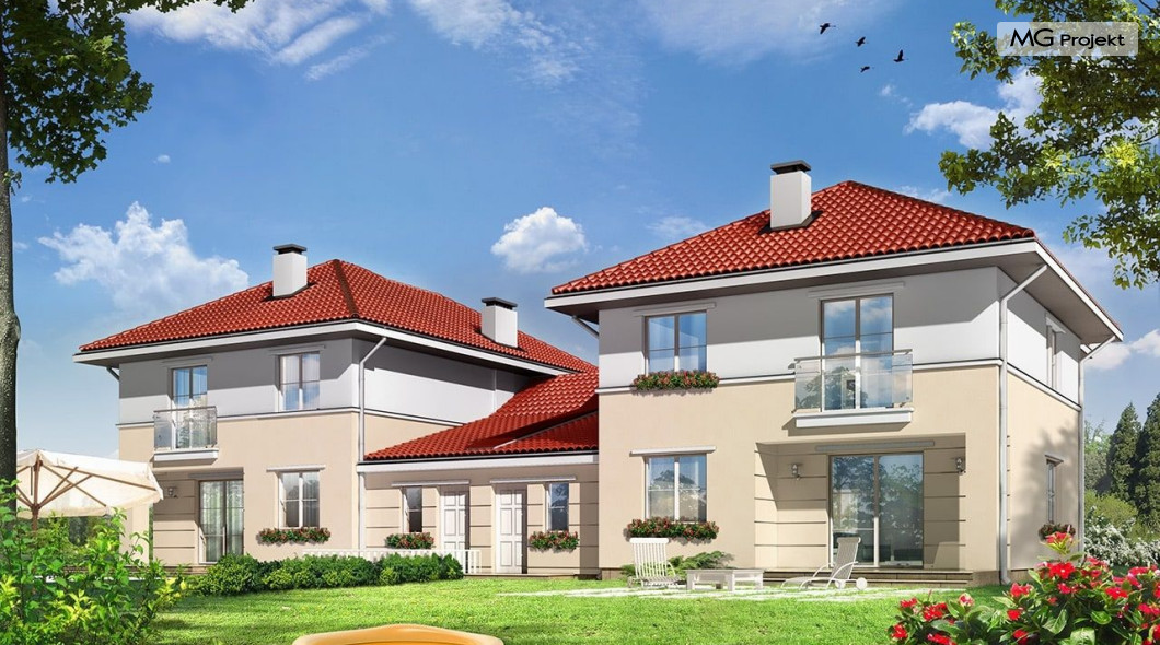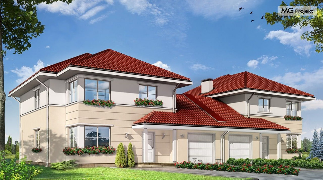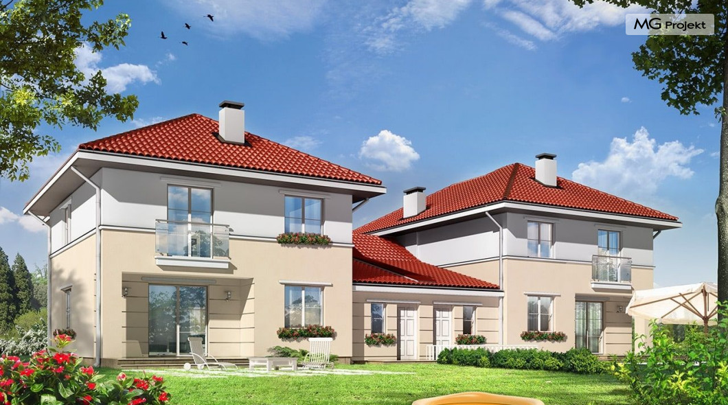 Projekt domu Ametyst 2 to budynek w zabudowie bliźniaczej dla dwóch cztero-sześcioosobowych rodzin. Piętrowy dom przykryty wielospadowym dachem. Zwarta, prosta w budowie bryła, złożona z dwóch piętrowych połówek i parterowego łącznika garaży, została urozmaicona fragmentami ścian z boniowaniem, oraz dwoma podcieniami. Subtelne elementy dekoracyjne dodają Ametystowi 2 dyskretnej elegancji. Wnętrze zaprojektowano z myślą o klarowności podziałów - bez zbędnych przestrzeni. Wszystkie pokoje mają funkcjonalny kształt. Na parterze zaplanowano salon połączony z jadalnią i holem, z częściowo otwartą kuchnią. W projekcie umieszczono też dodatkowy pokój - gabinet lub sypialnię gościnną. Część gospodarcza domu przewiduje dwustanowiskowy garaż i pomieszczenie gospodarcze - można również zrezygnować z drugiego garażu i zaprojektować w jego miejsce duże pomieszczenie gospodarcze. Na piętrze umieszczono trzy sypialnie z garderobami i szafami wbudowanymi, oraz dużą łazienkę. Istnieje możliwość wygospodarowania dodatkowego czwartego pokoju na piętrze - likwidując garderobę. Pracownia posiada wersję odbicia lustrzanego projektu Ametyst 2. Zapraszamy do zapoznania się z pełną ofertą pracowni MG Projekt: projekt domu Ametyst.